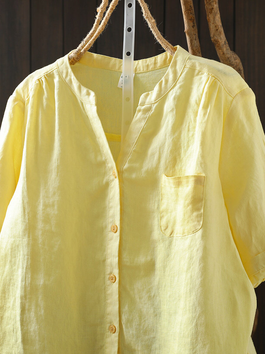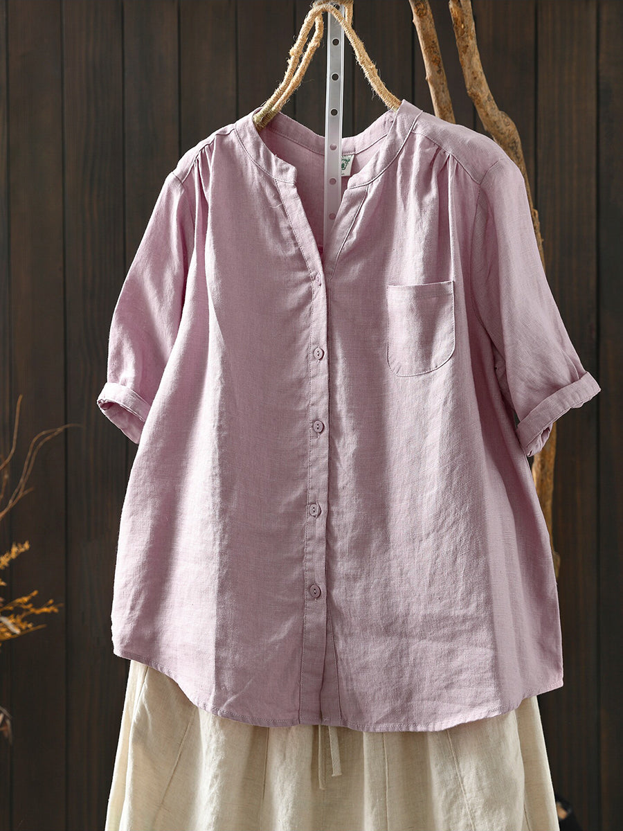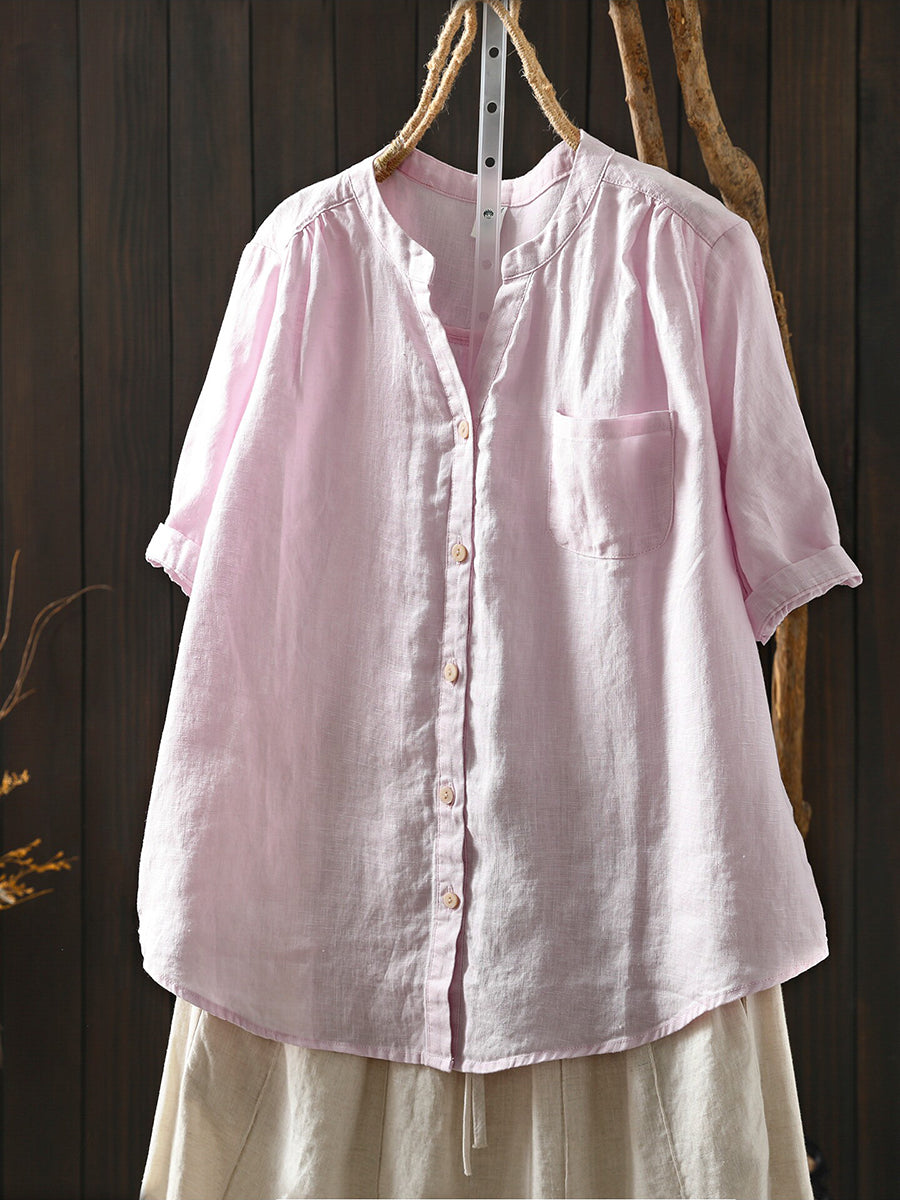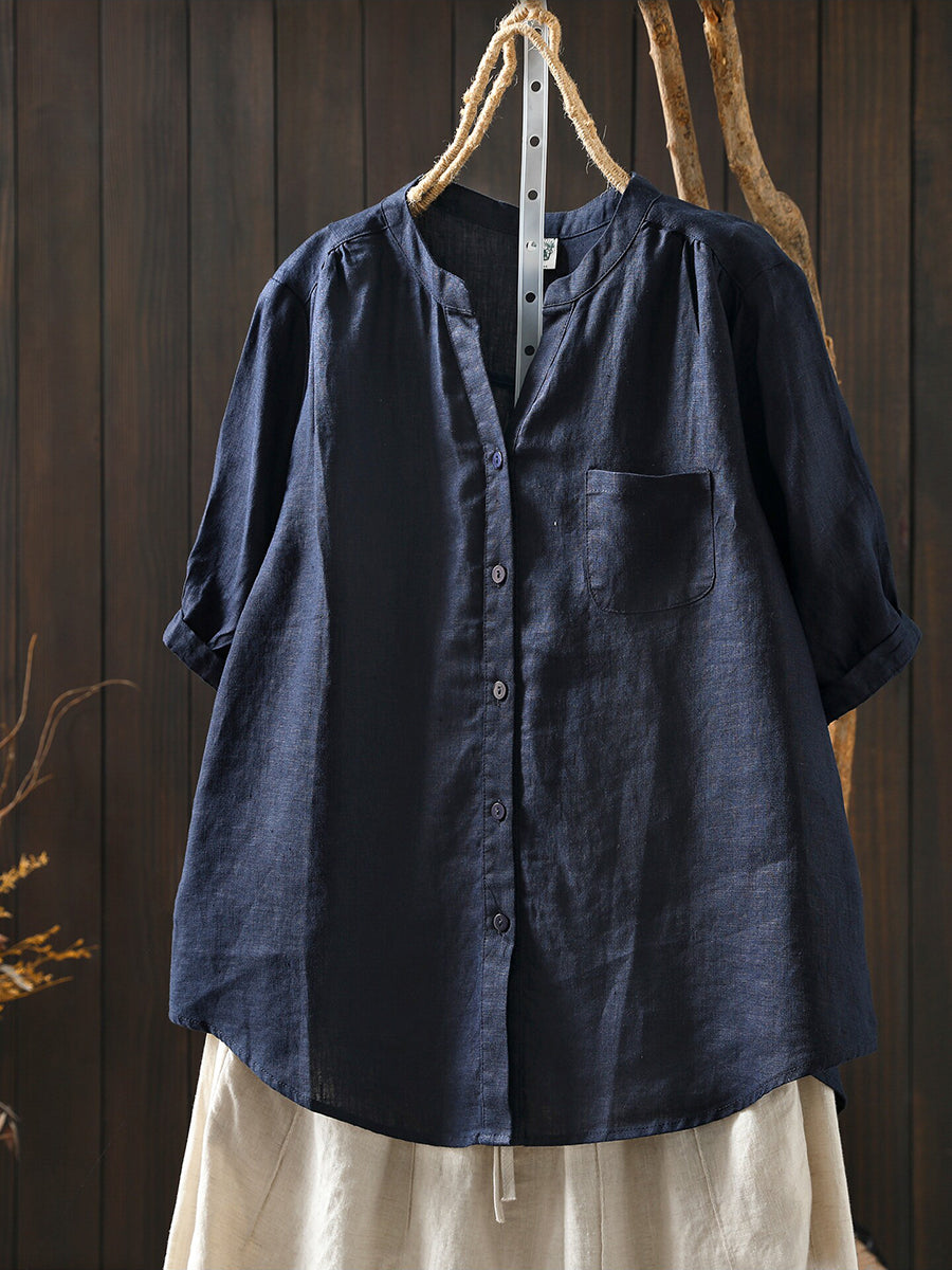 Women Summer Retro Pure Color 100%Linen Blouse