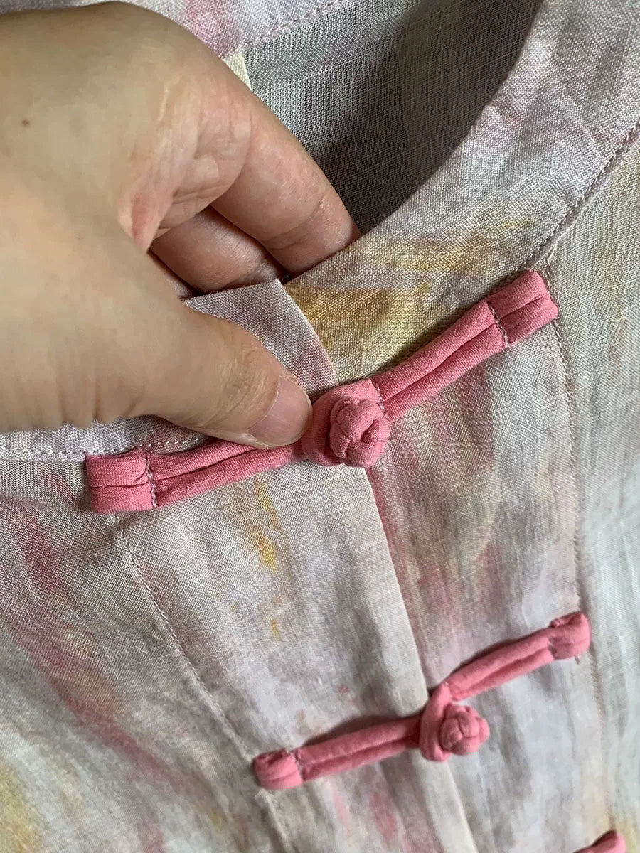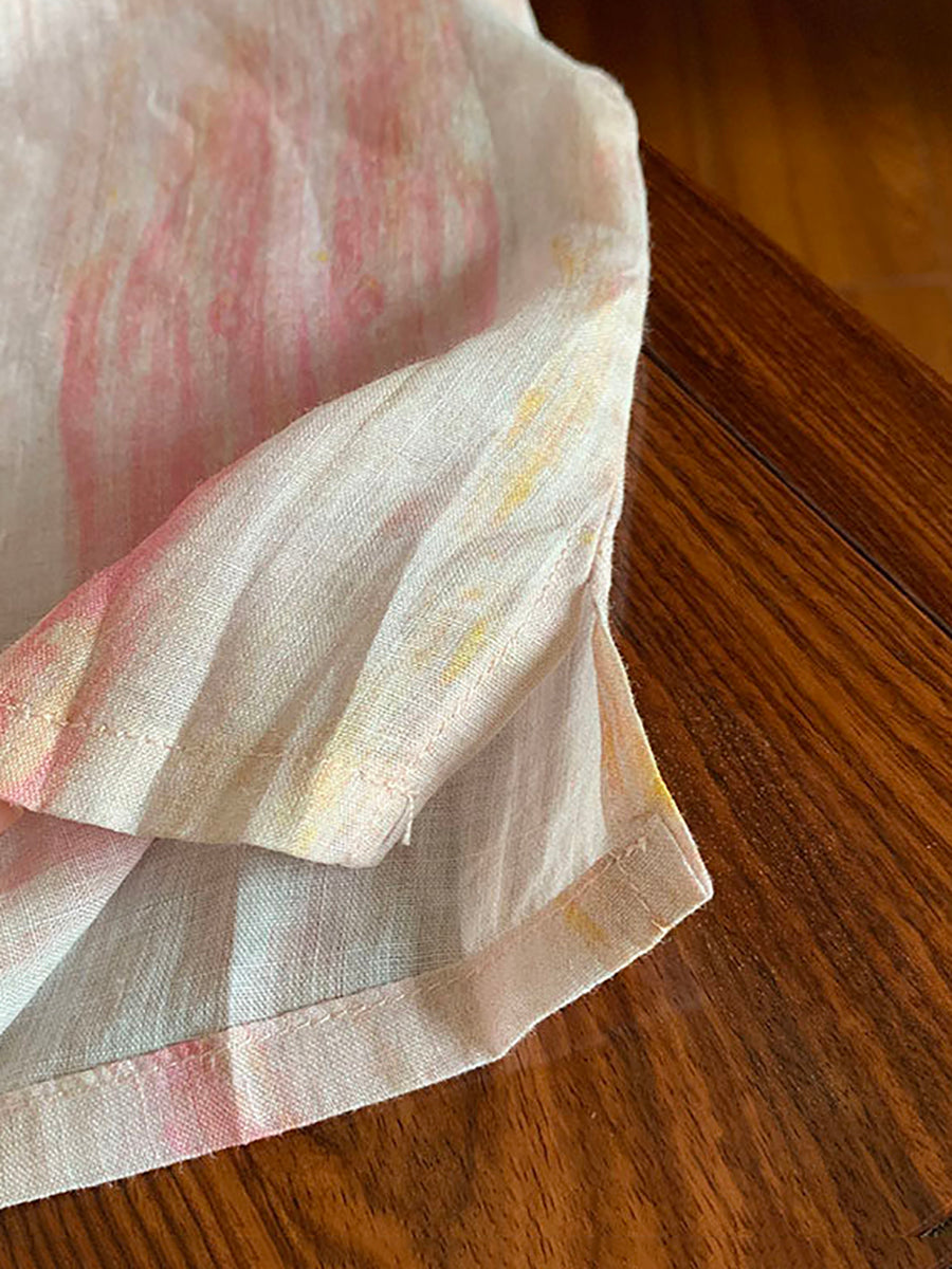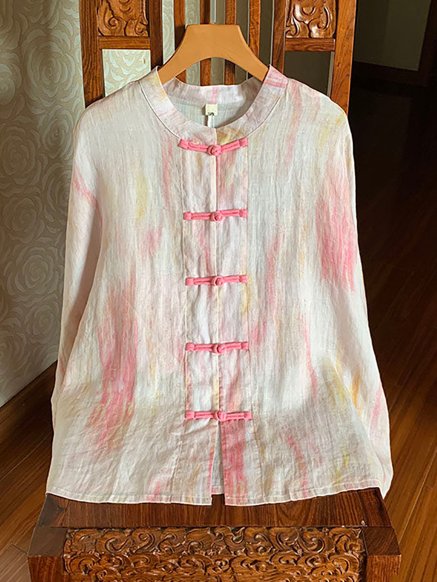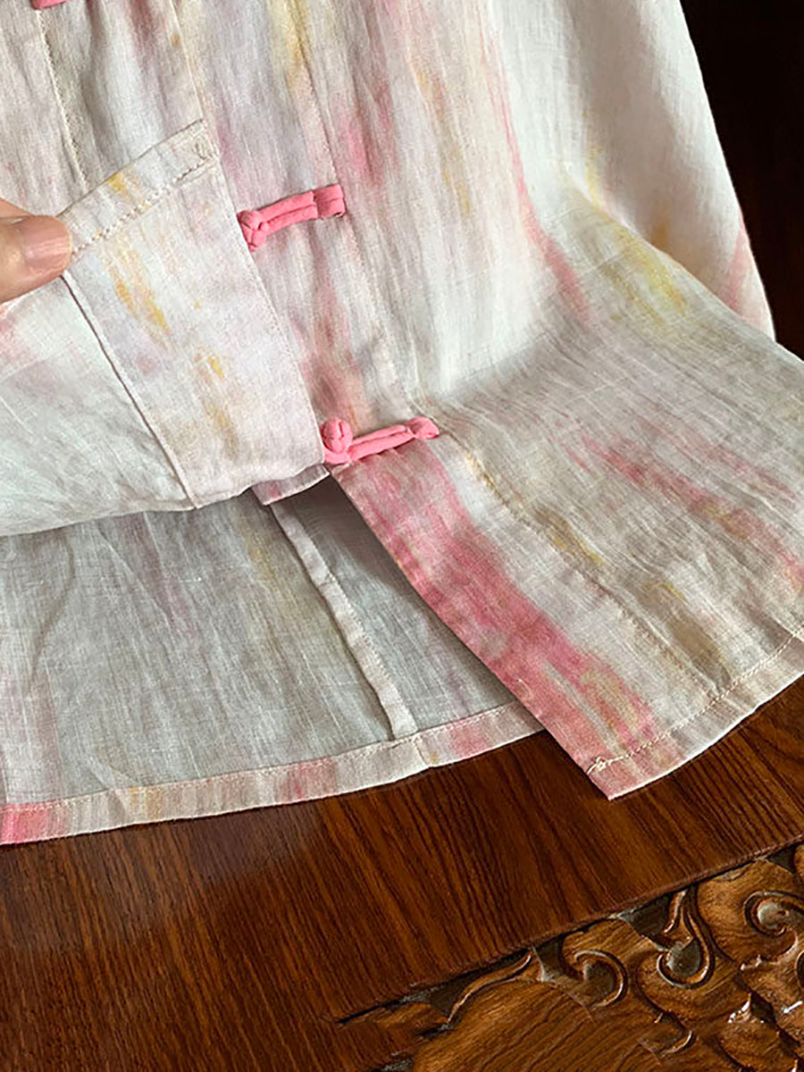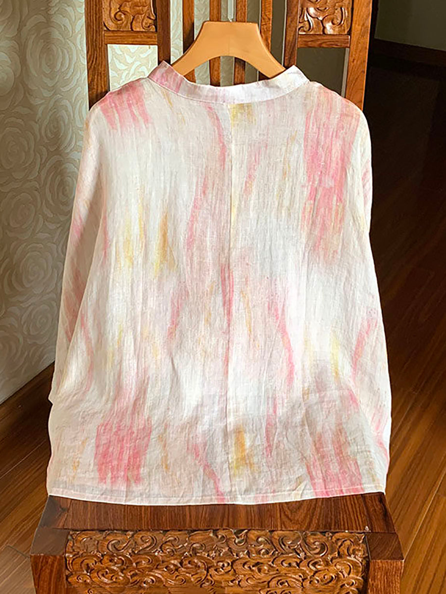 Women Summer Tie-dye Stand Collar 100%Ramie Shirt