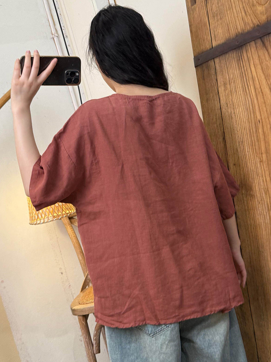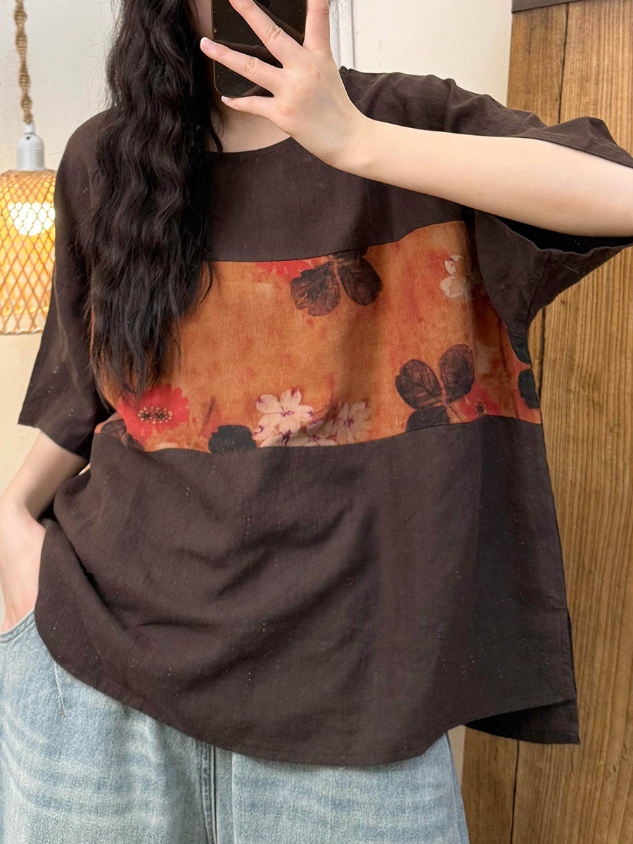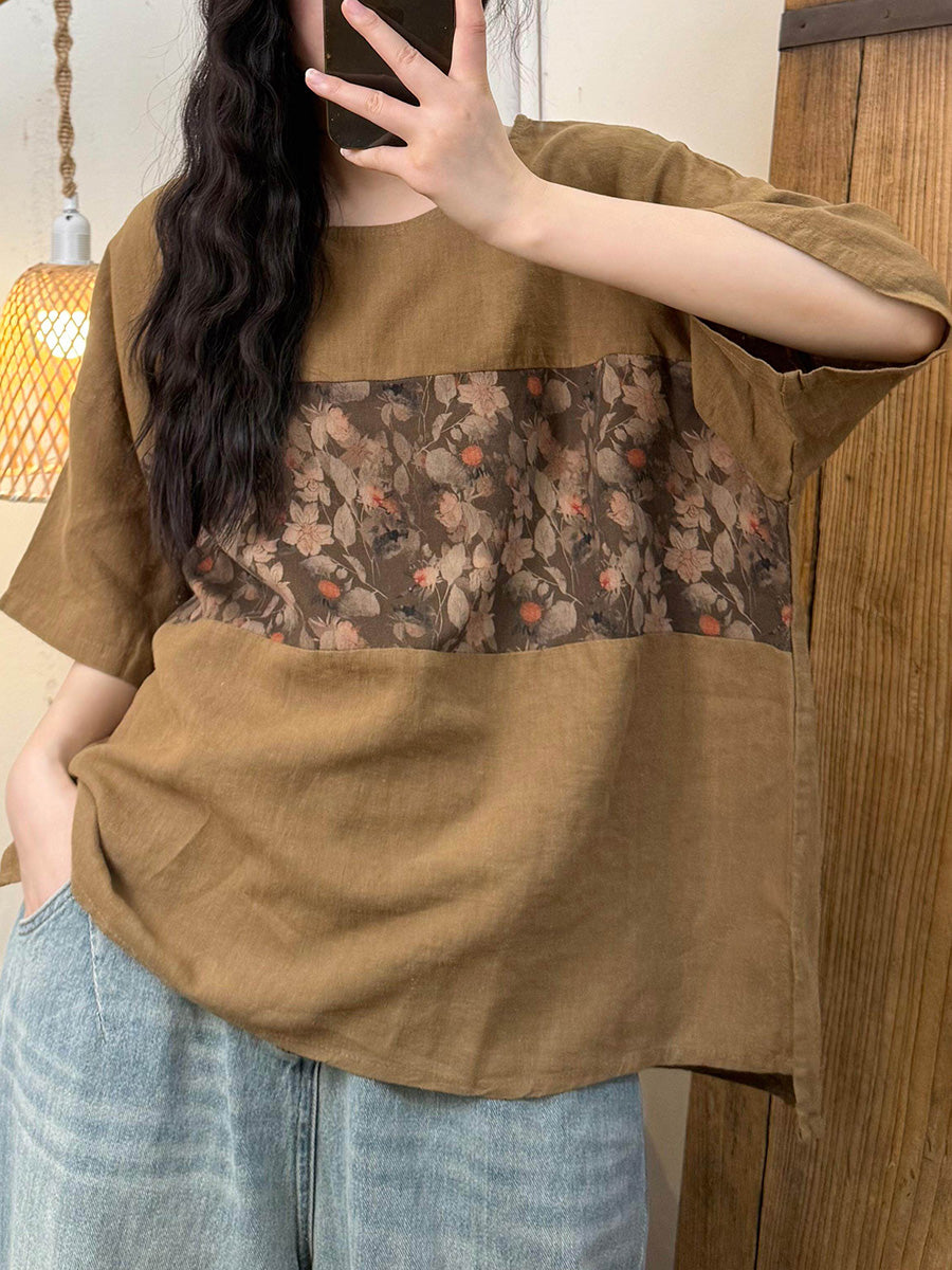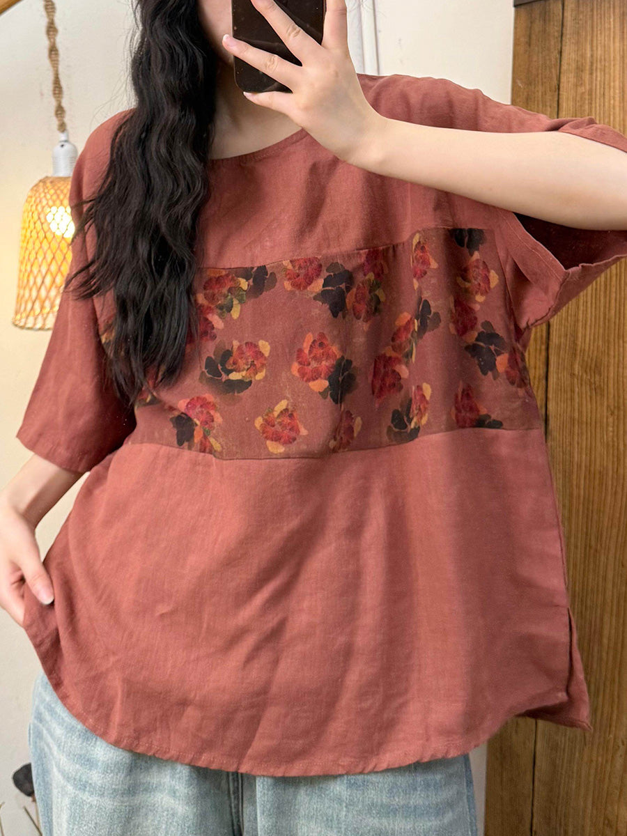 Women Summer Vintage Flower Spliced O-Neck Shirt