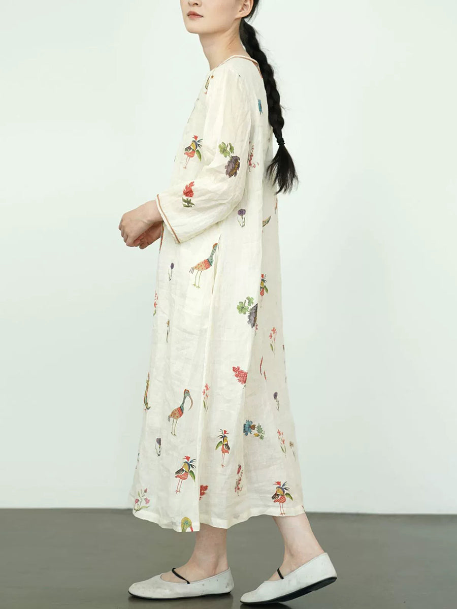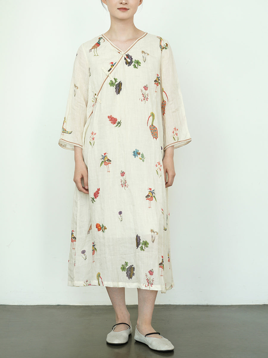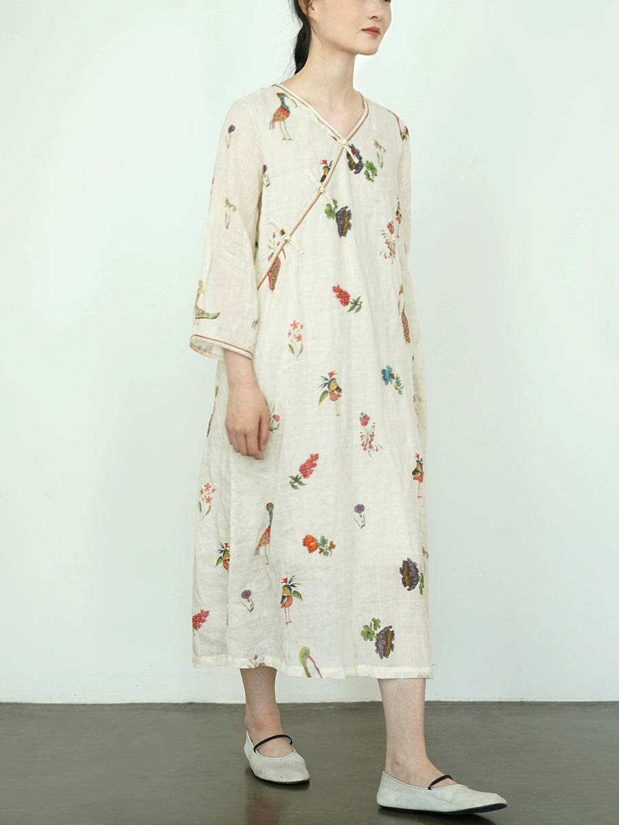 Women Summer Vintage Print 100%Ramie V-Neck Dress
