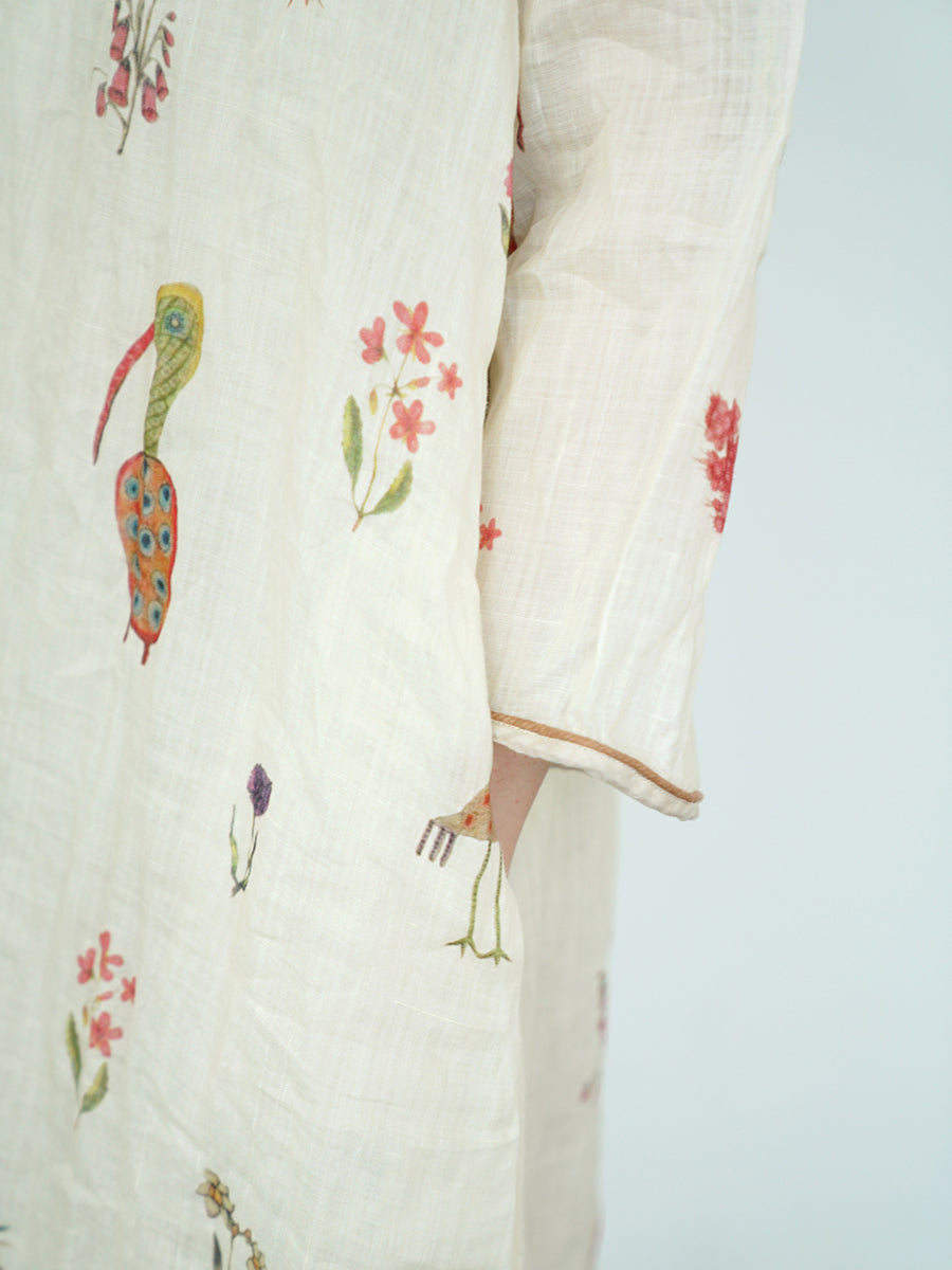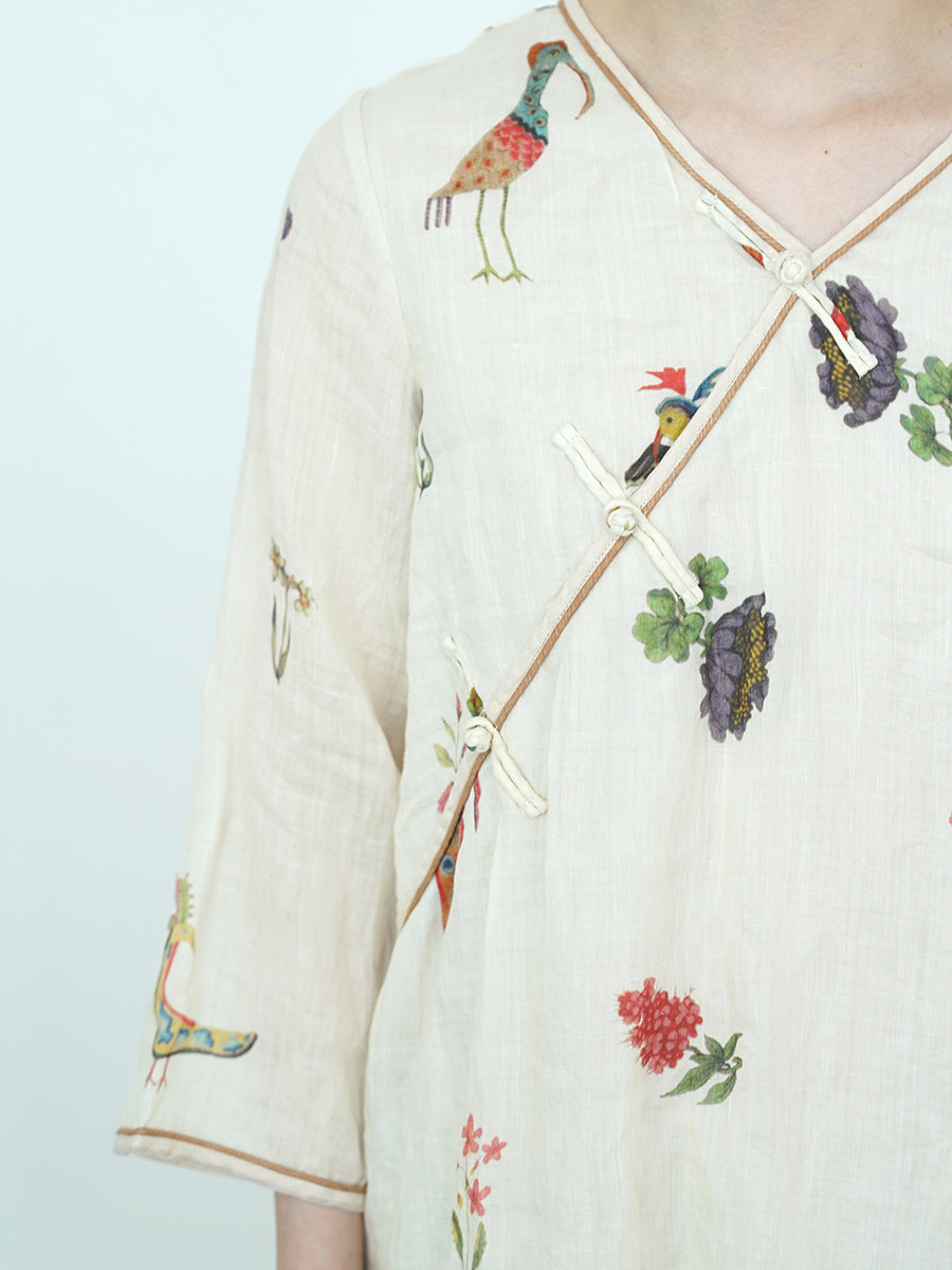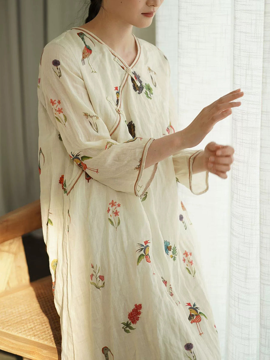 Women Summer Vintage Print 100%Ramie V-Neck Dress