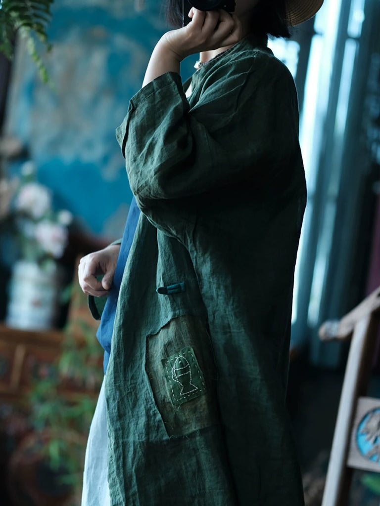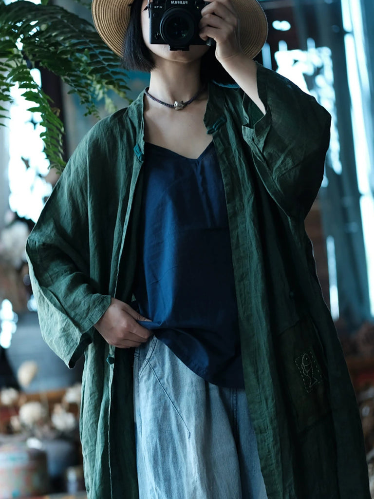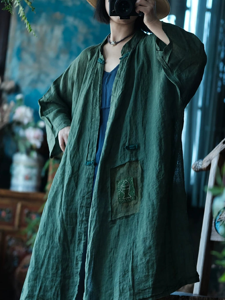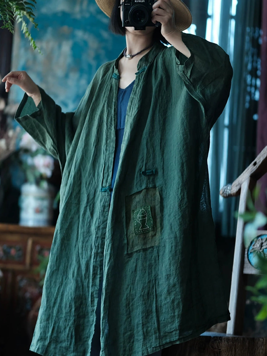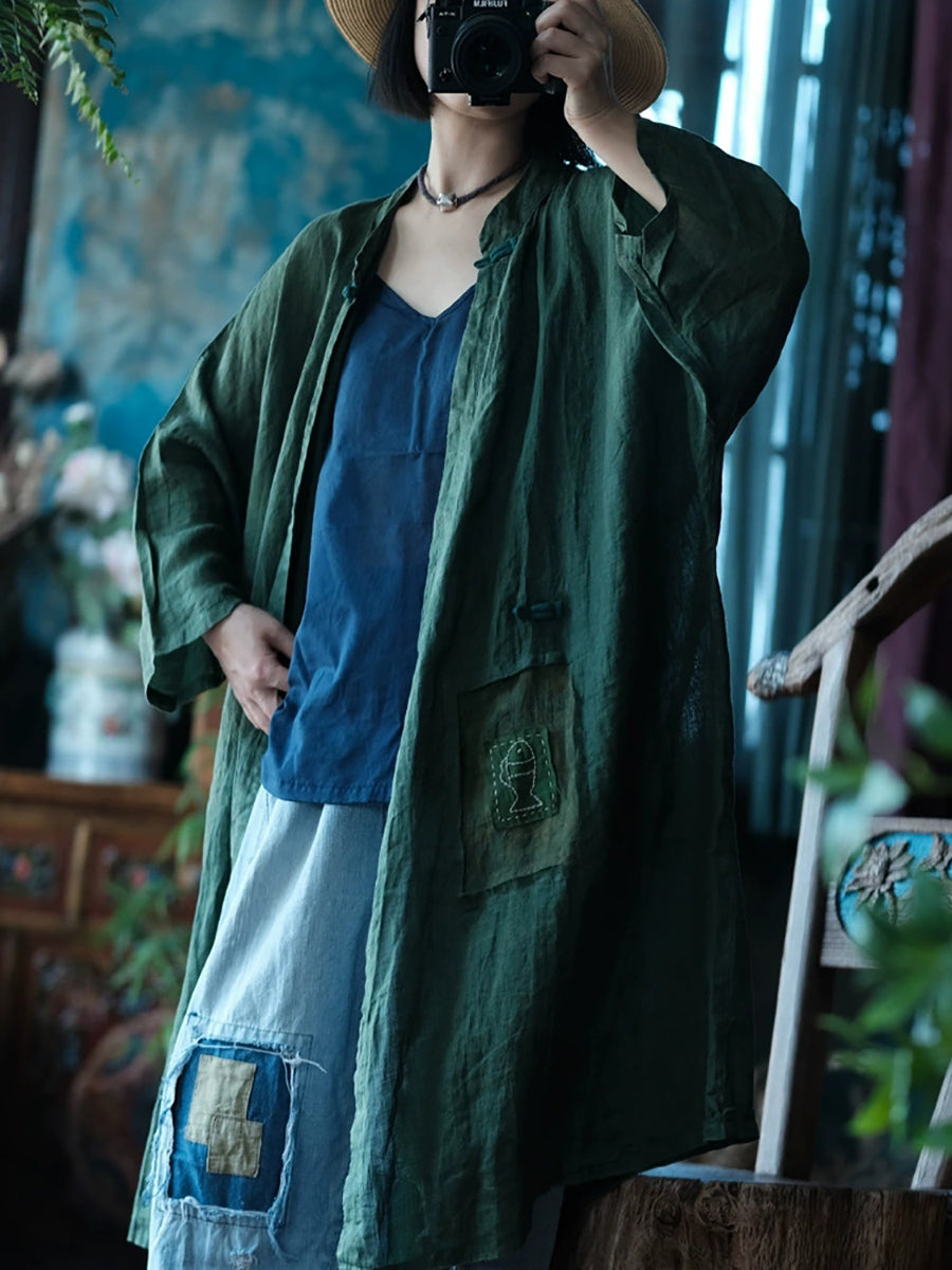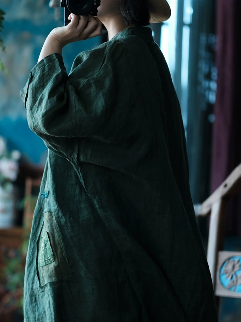 Women Summer Vintage Pure Color Stand Collar Ramie Shirt