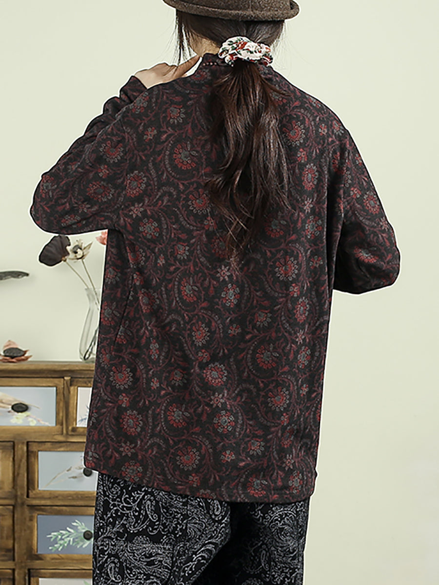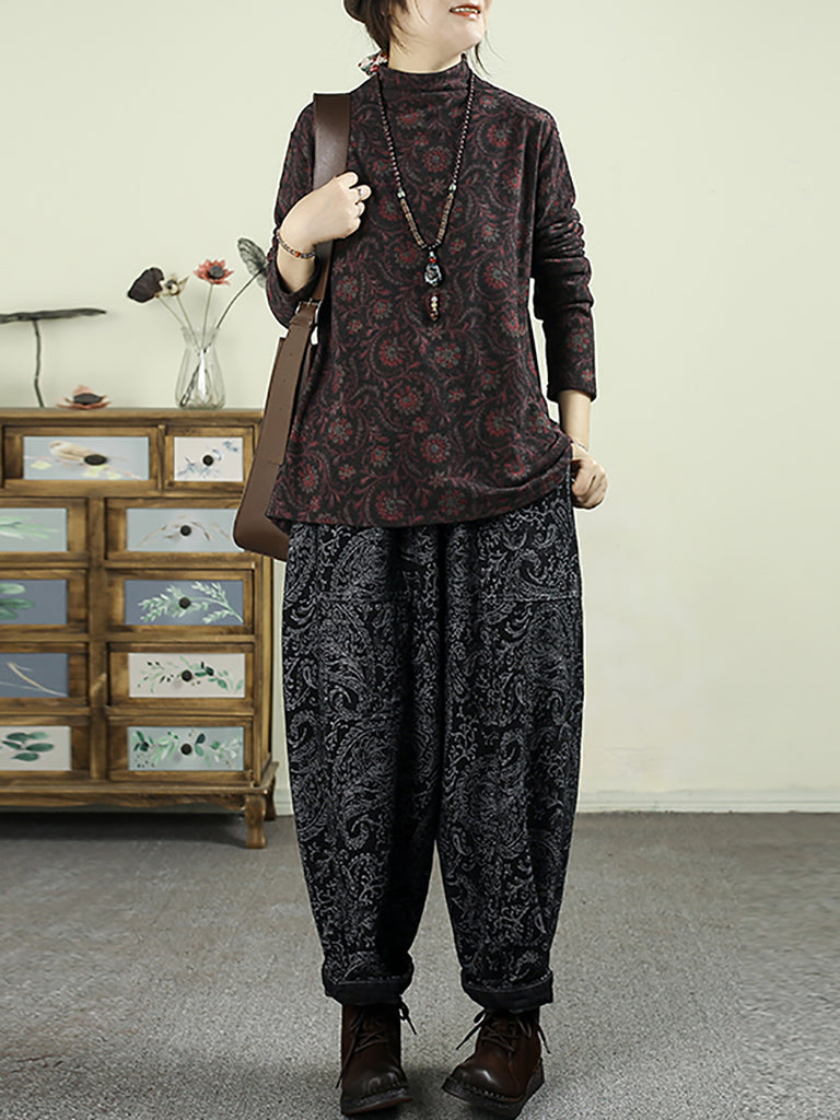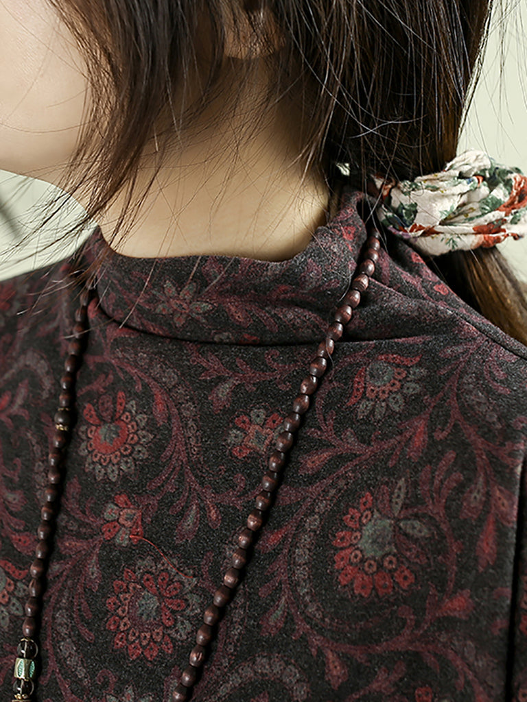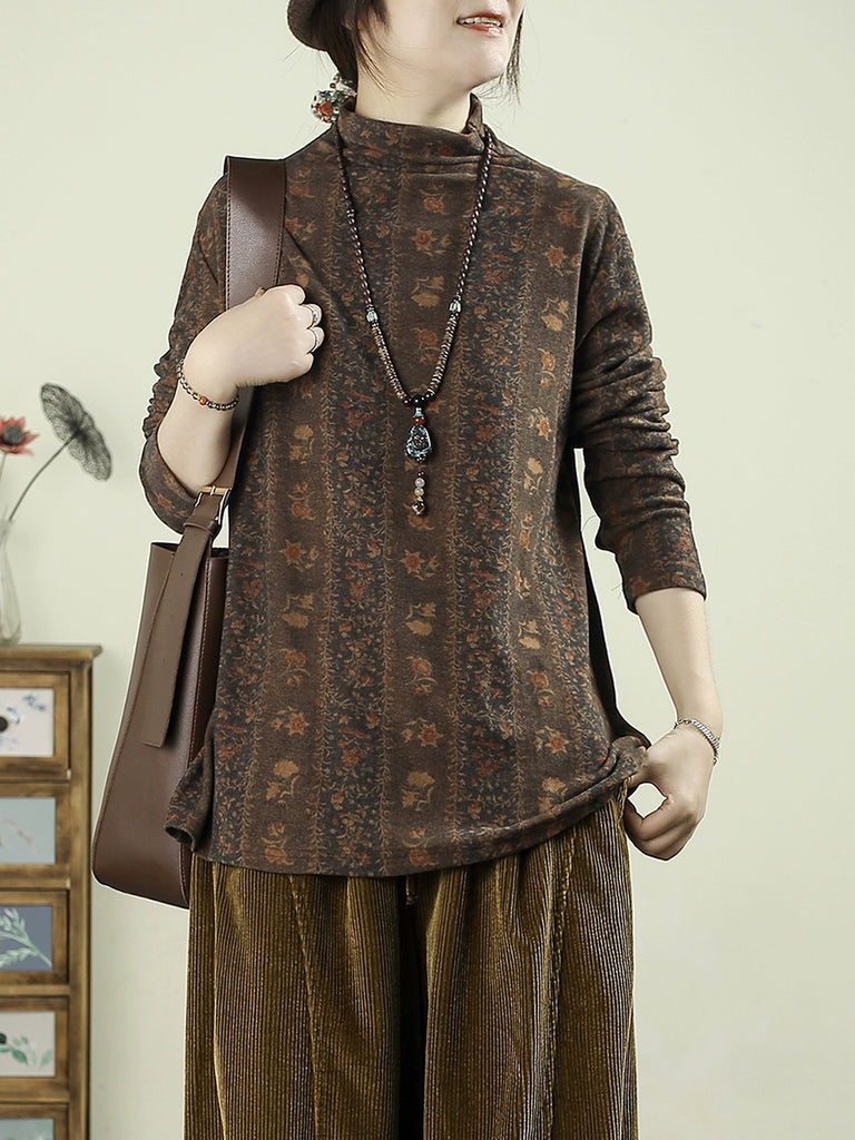 Women Vintage Autumn Flower Half-Turtleneck Blouse