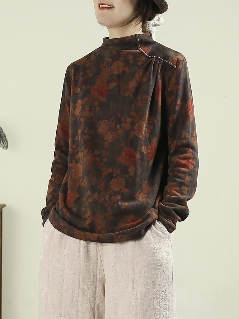 Women Vintage Autumn Flower Half-Turtleneck Blouse