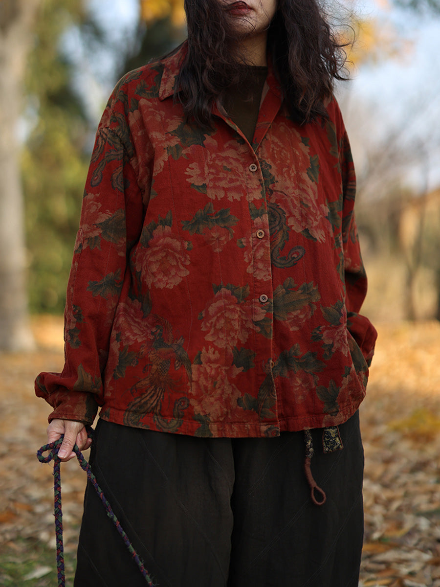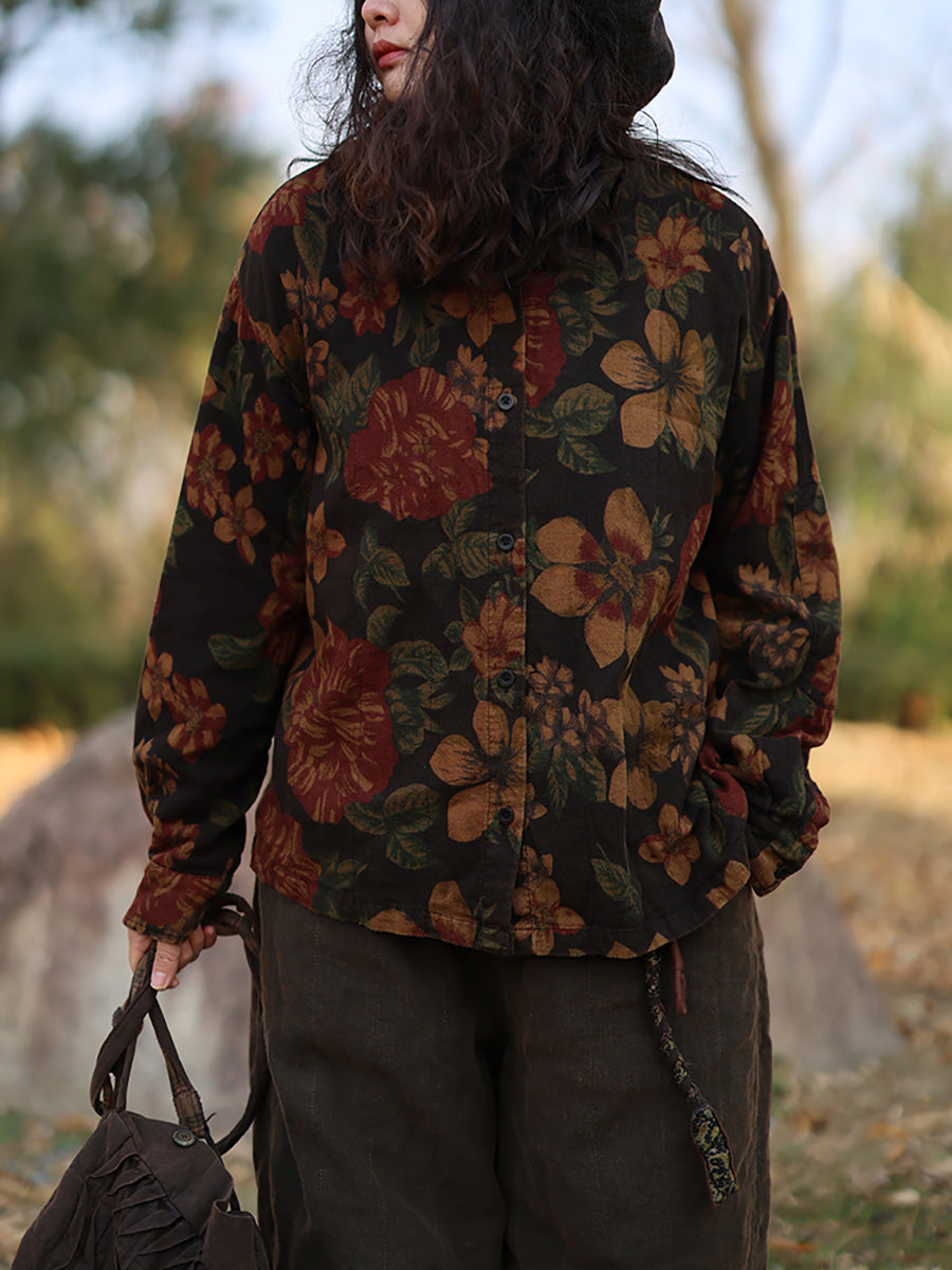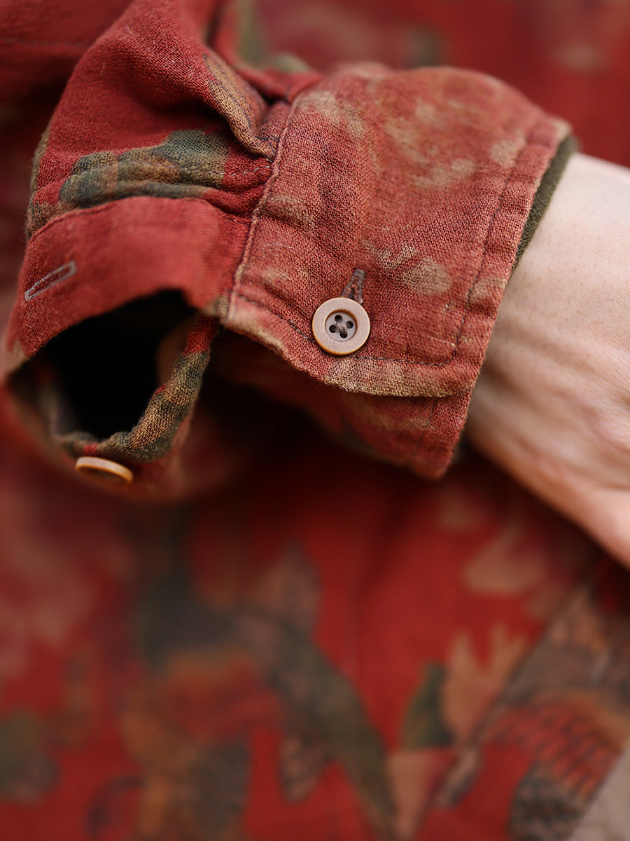 Women Vintage Autumn Flower Turn-down Collar 100%Cotton Shirt