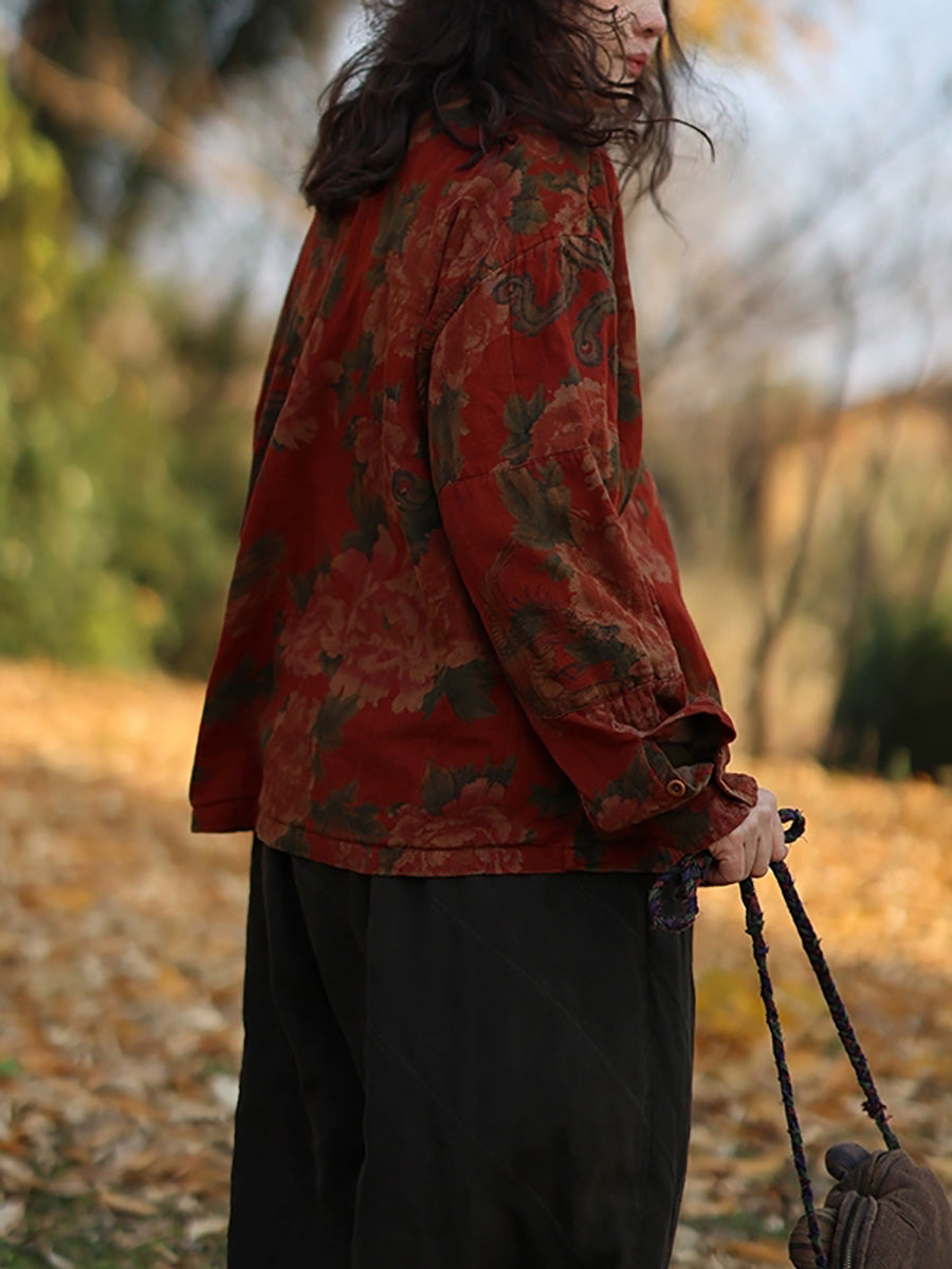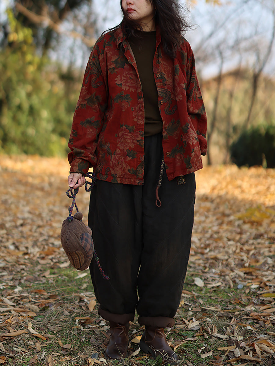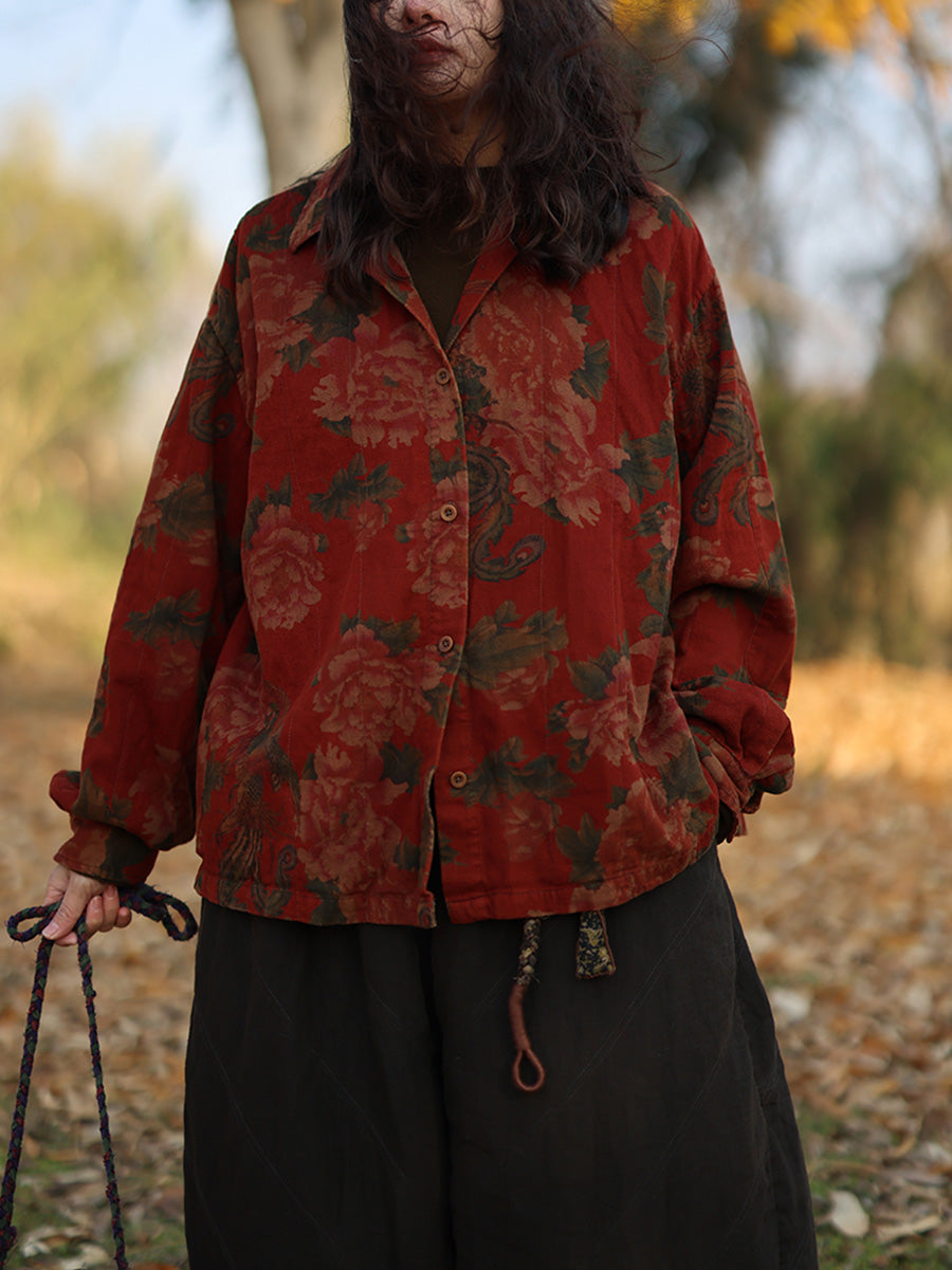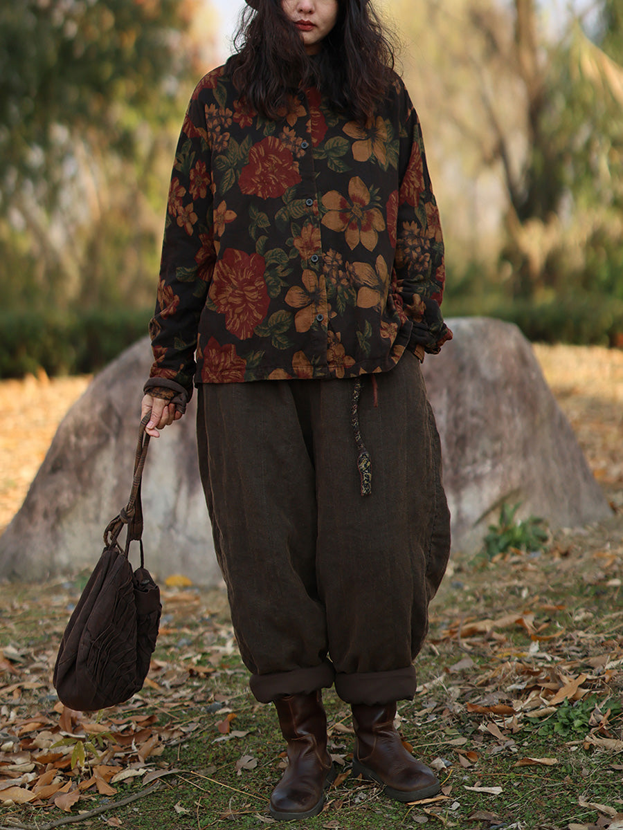 Women Vintage Autumn Flower Turn-down Collar 100%Cotton Shirt