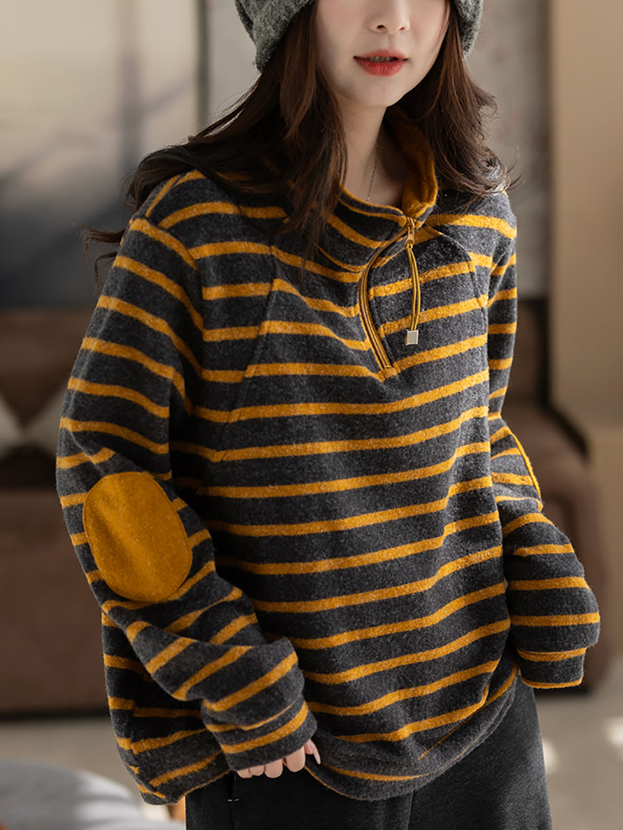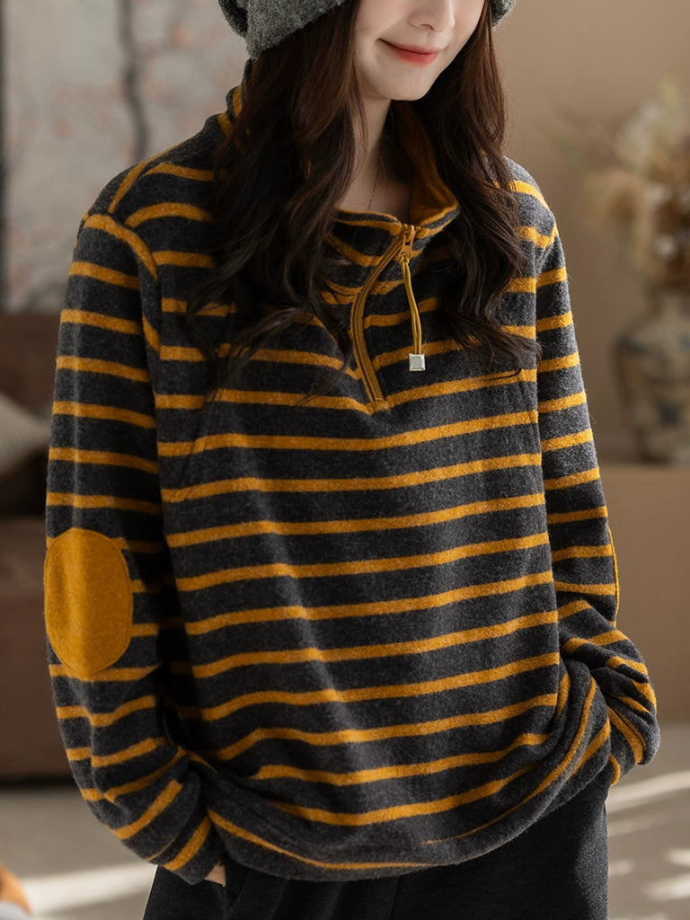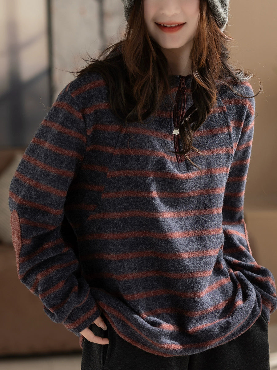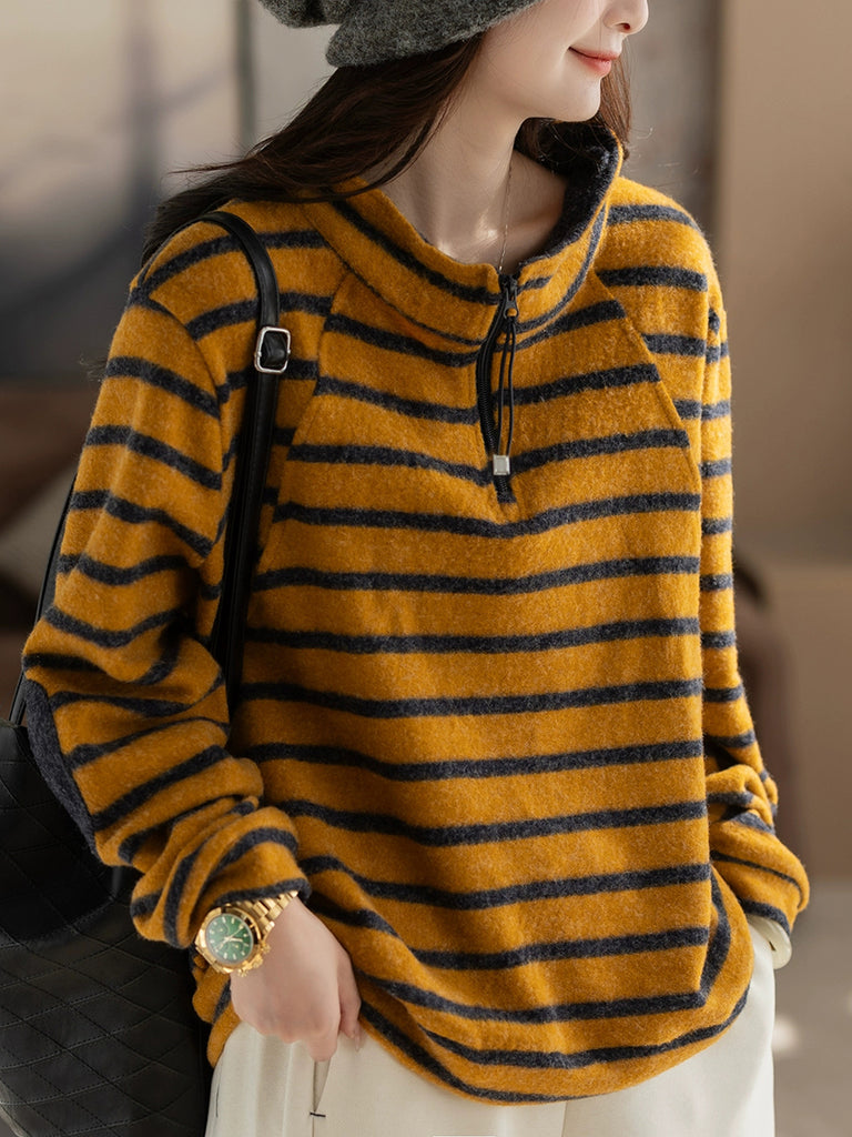 Women Vintage Autumn Stripe Stand Collar Blouse