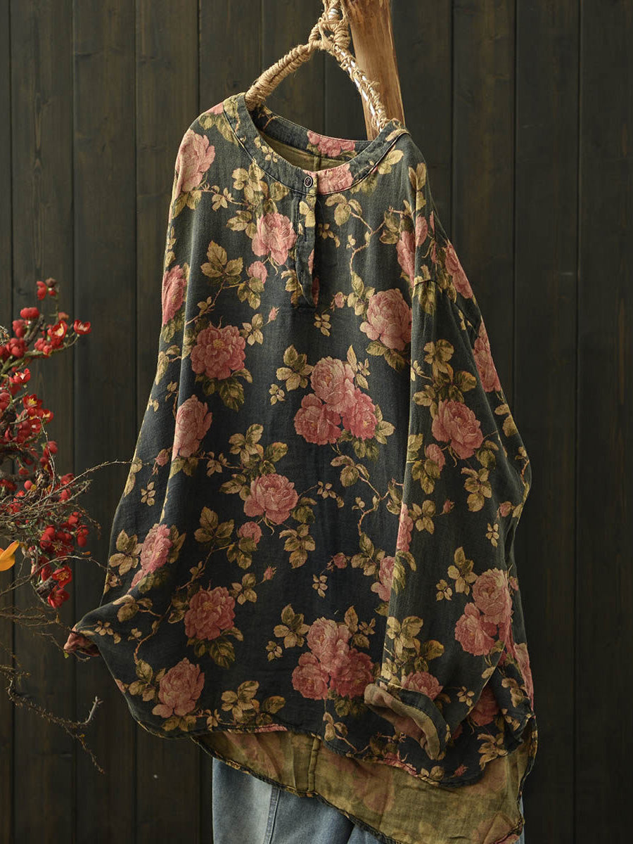 Women Vintage Spring Flower O-Neck Cotton Blouse