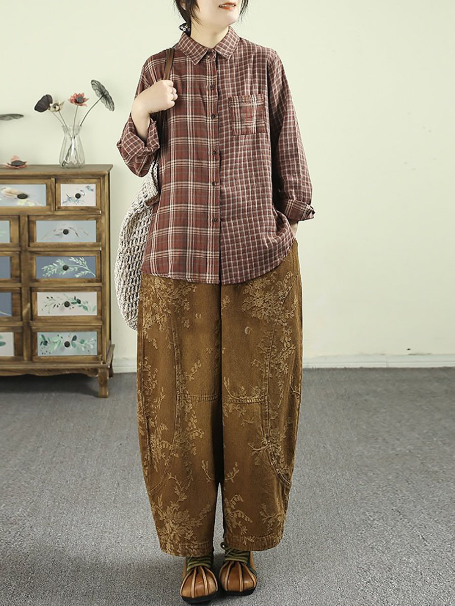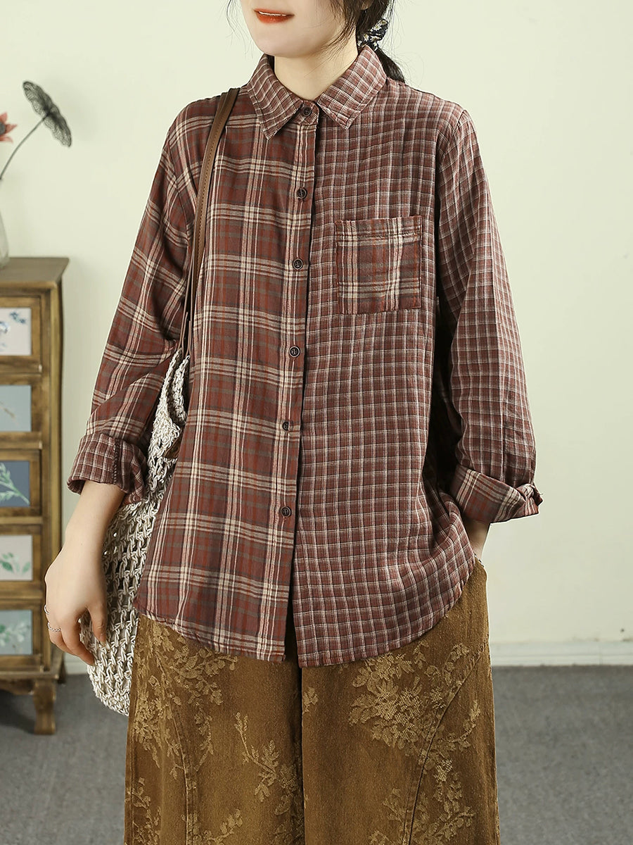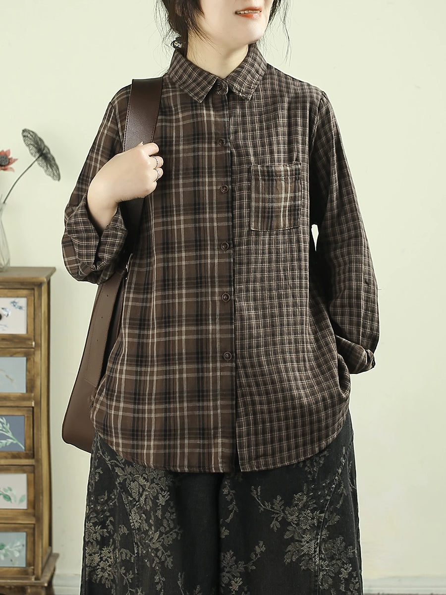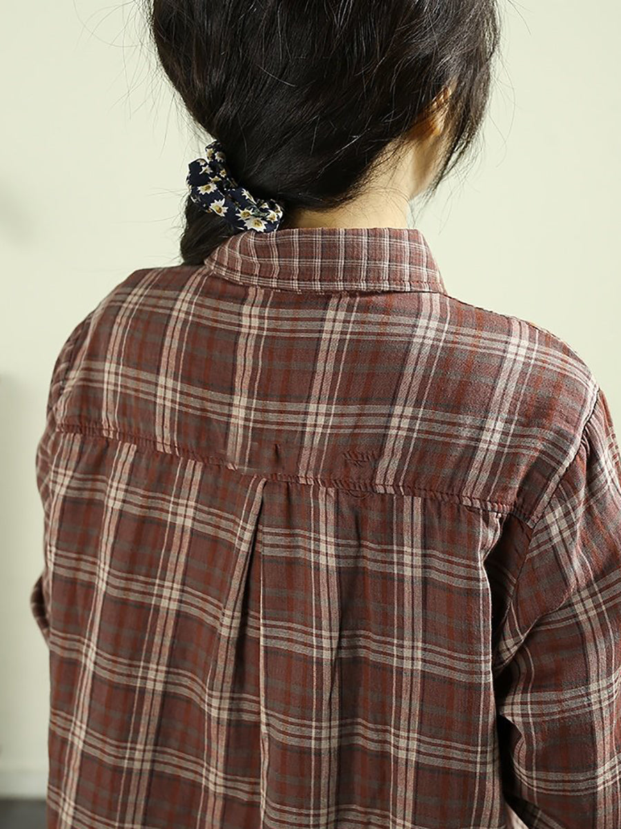 Women Vintage Spring Plaid Turn-down Collar 100%Cotton Shirt
