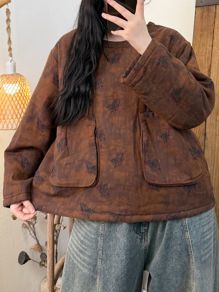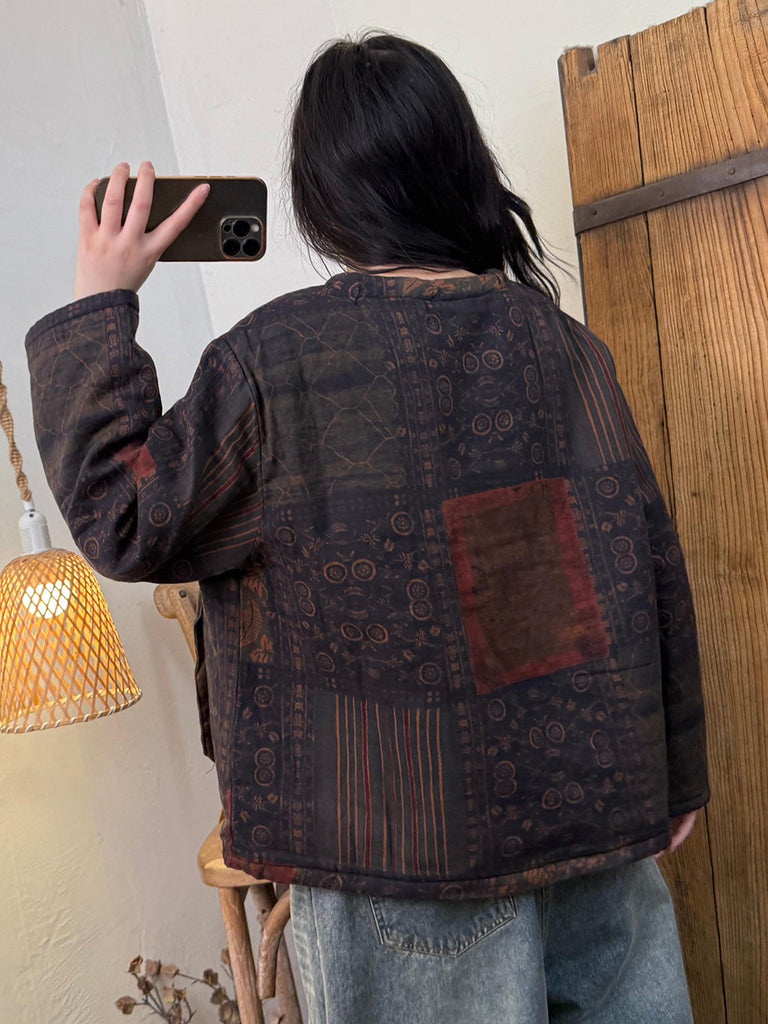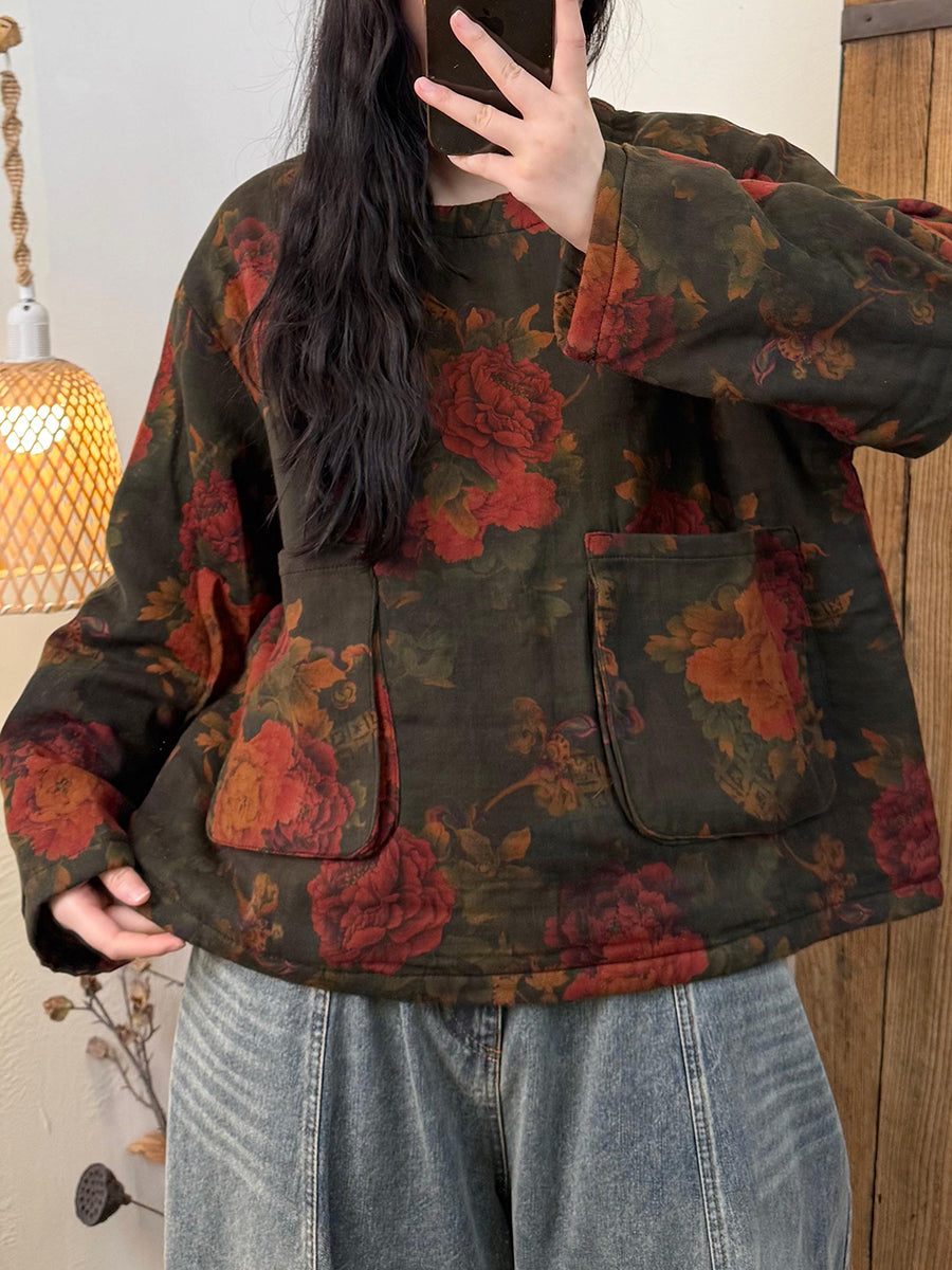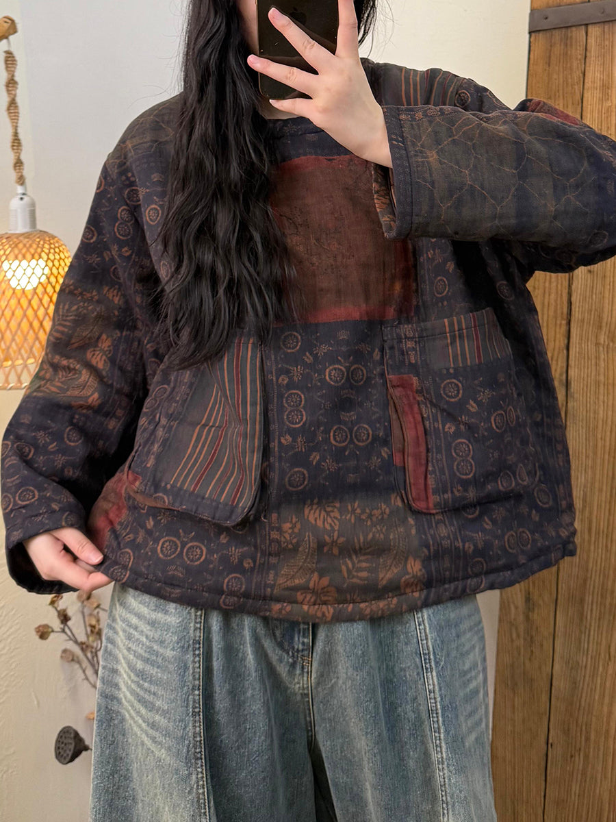 Women Vintage Winter Flower 100%Cotton O-Neck Padded Coat