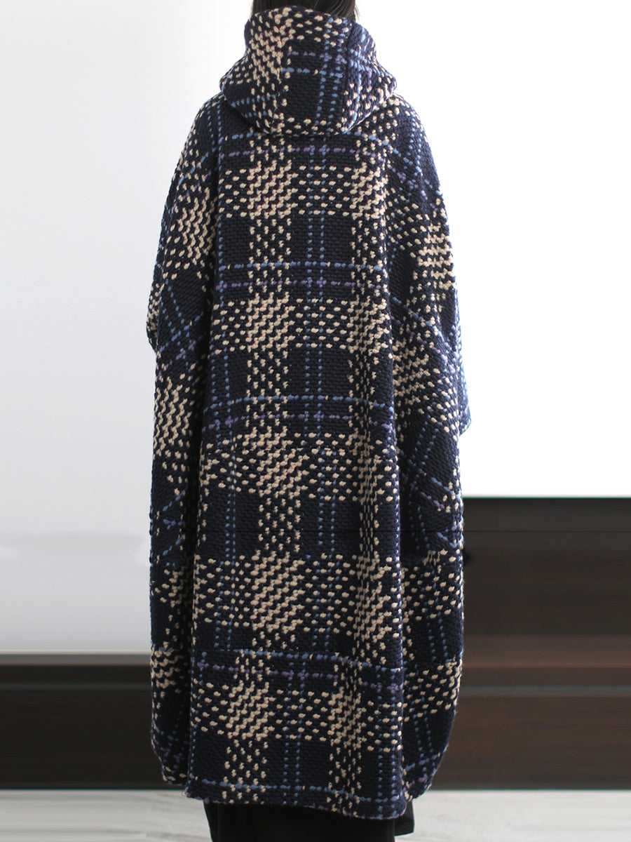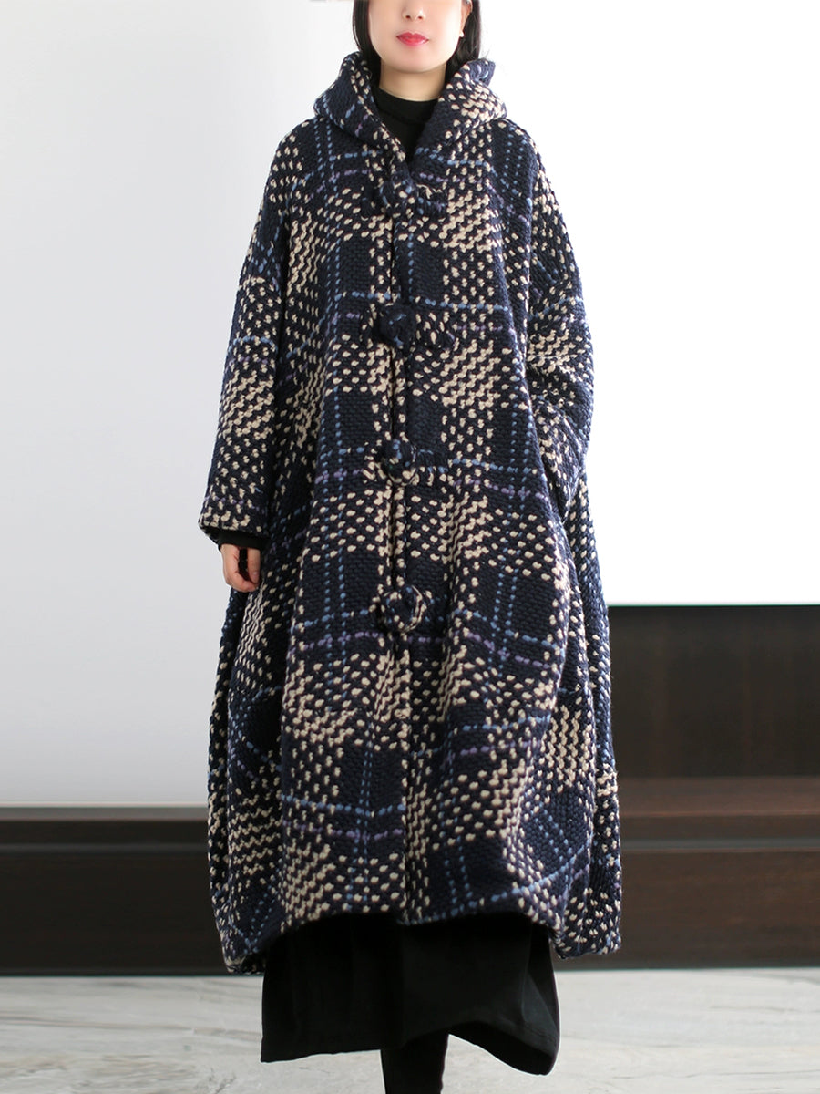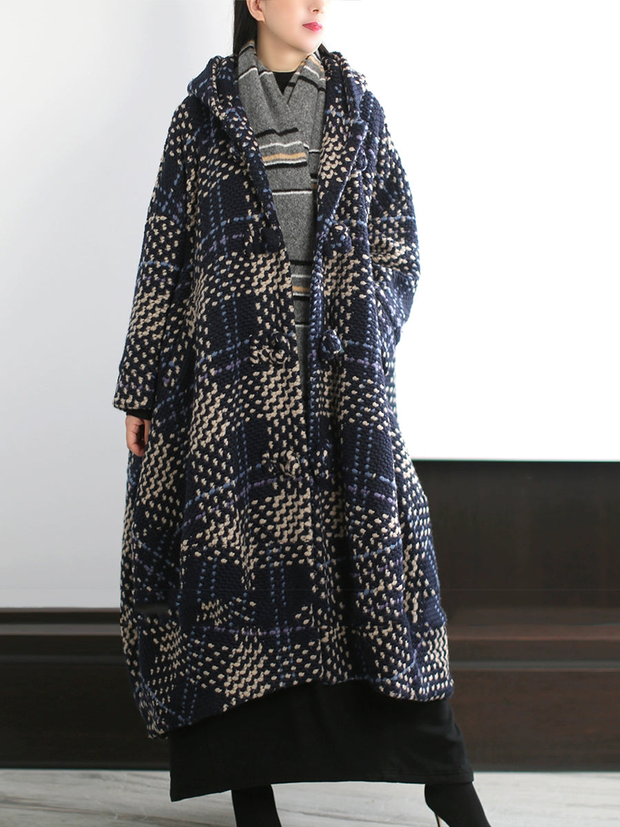 Women Vintage Winter Plaid Hooded Overcoat