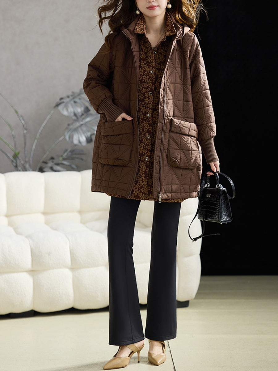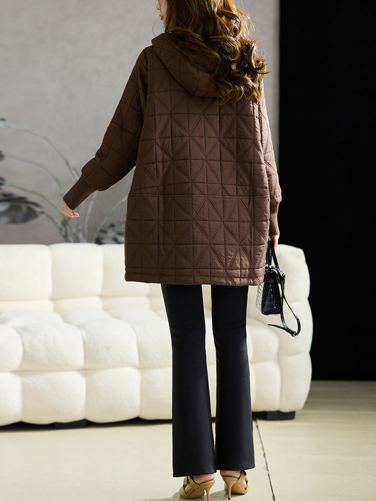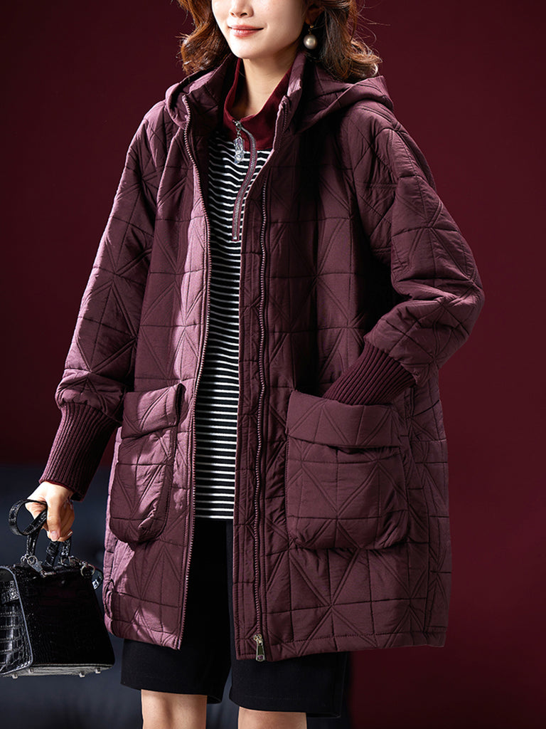 Women Winter Casual Pure Color Rhomboids Padded Hooded Coat