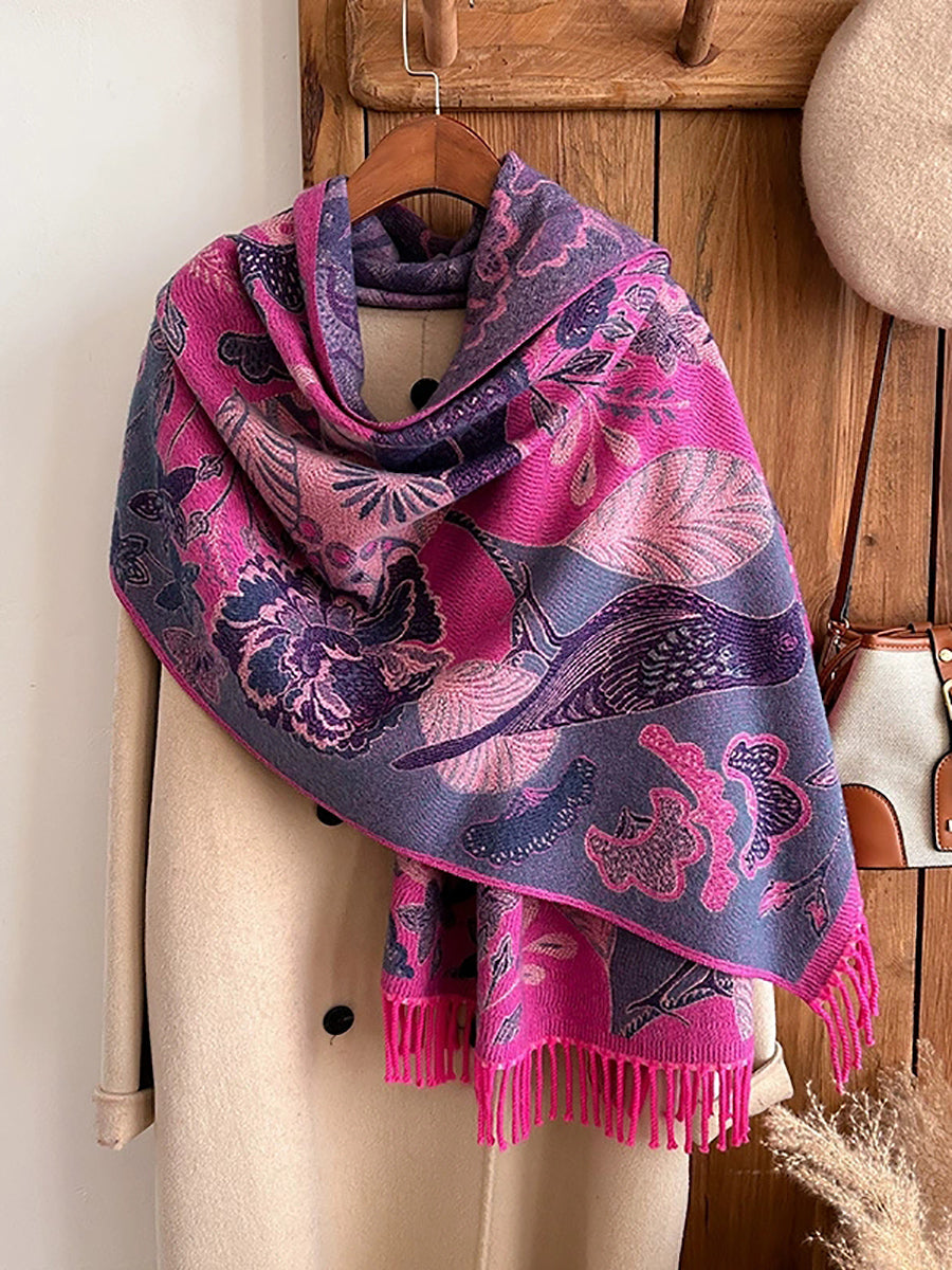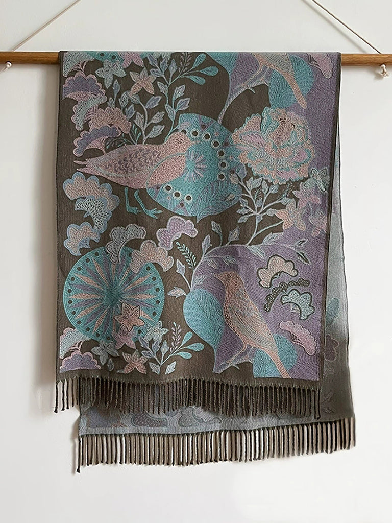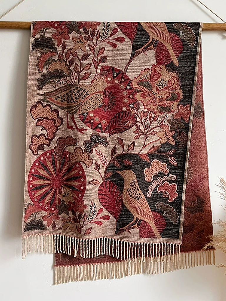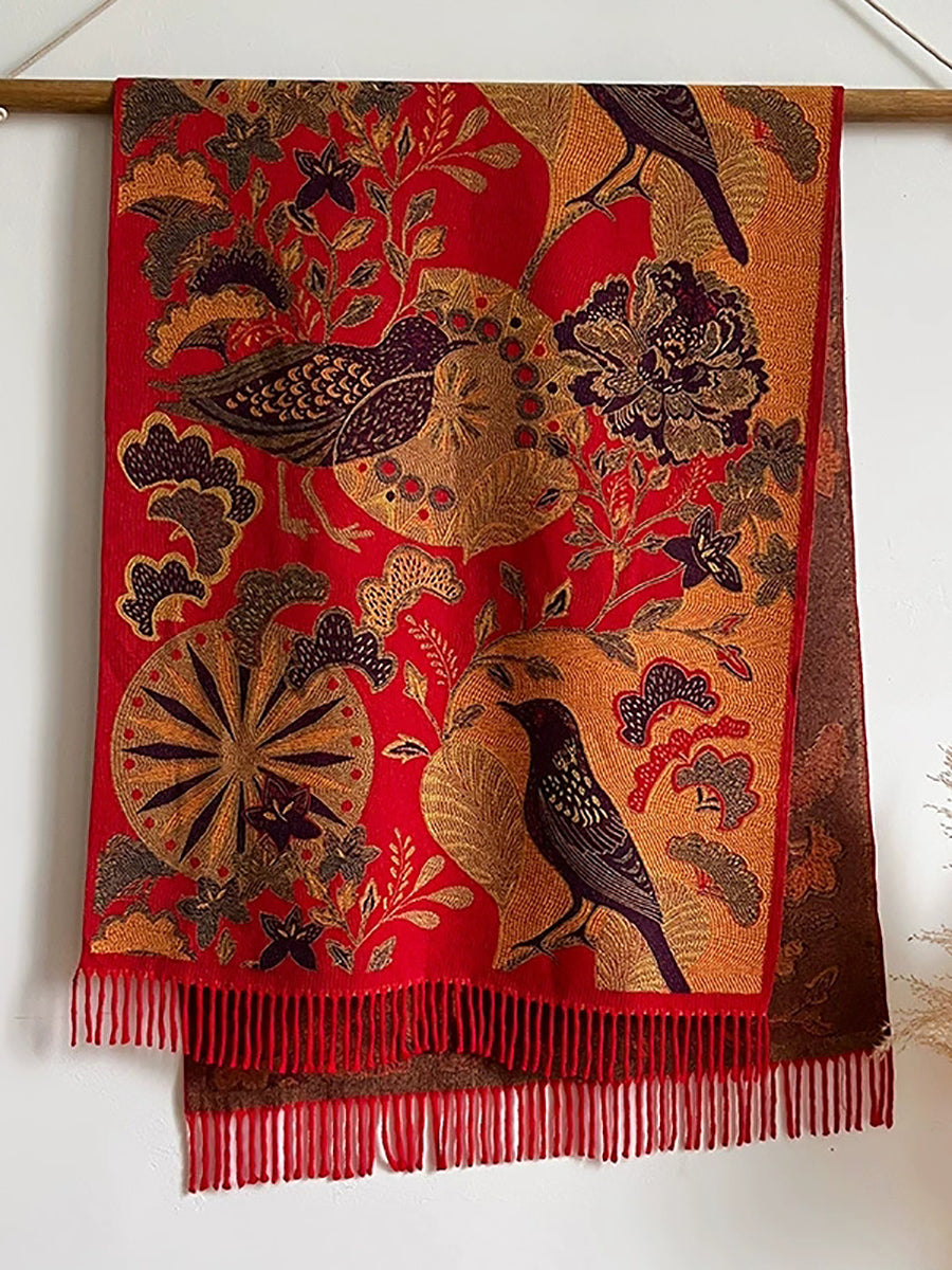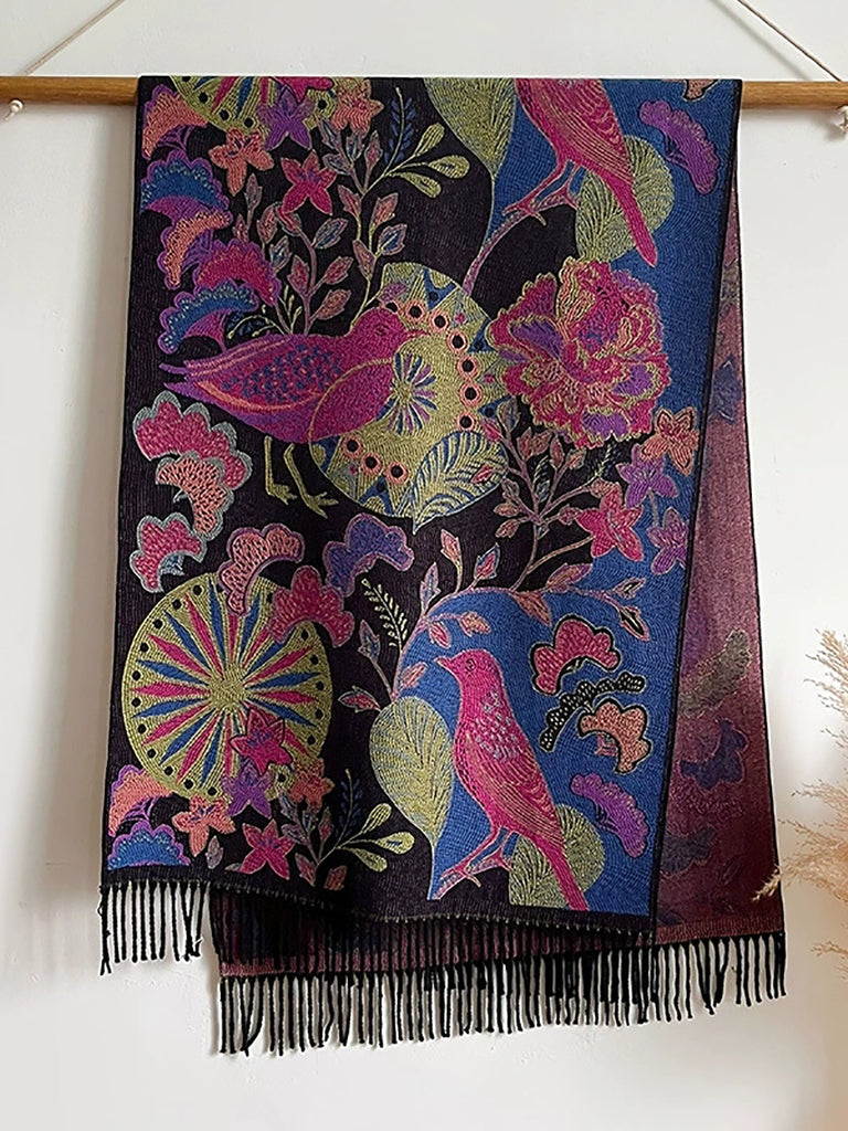 Women Winter Ethnic Bird Flower Tassel Shawl Scarf
