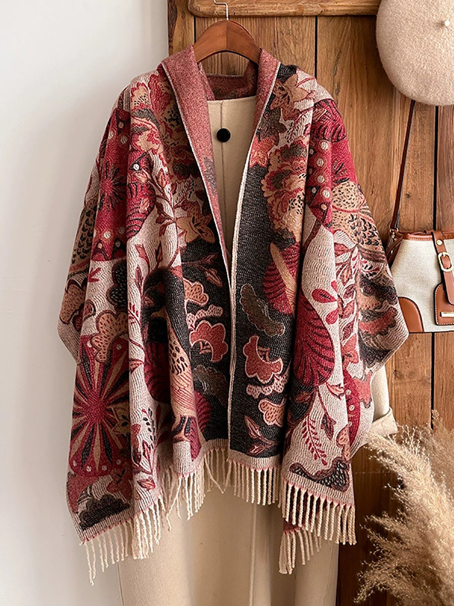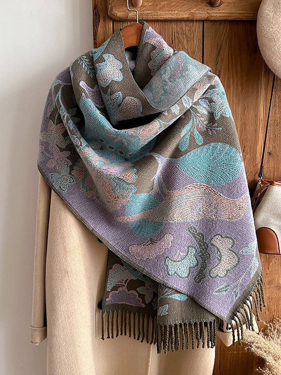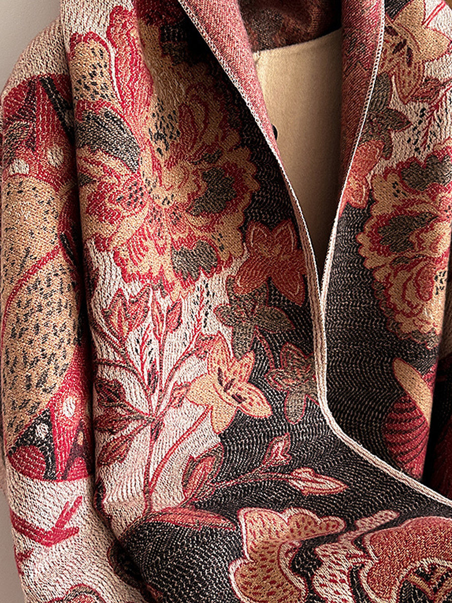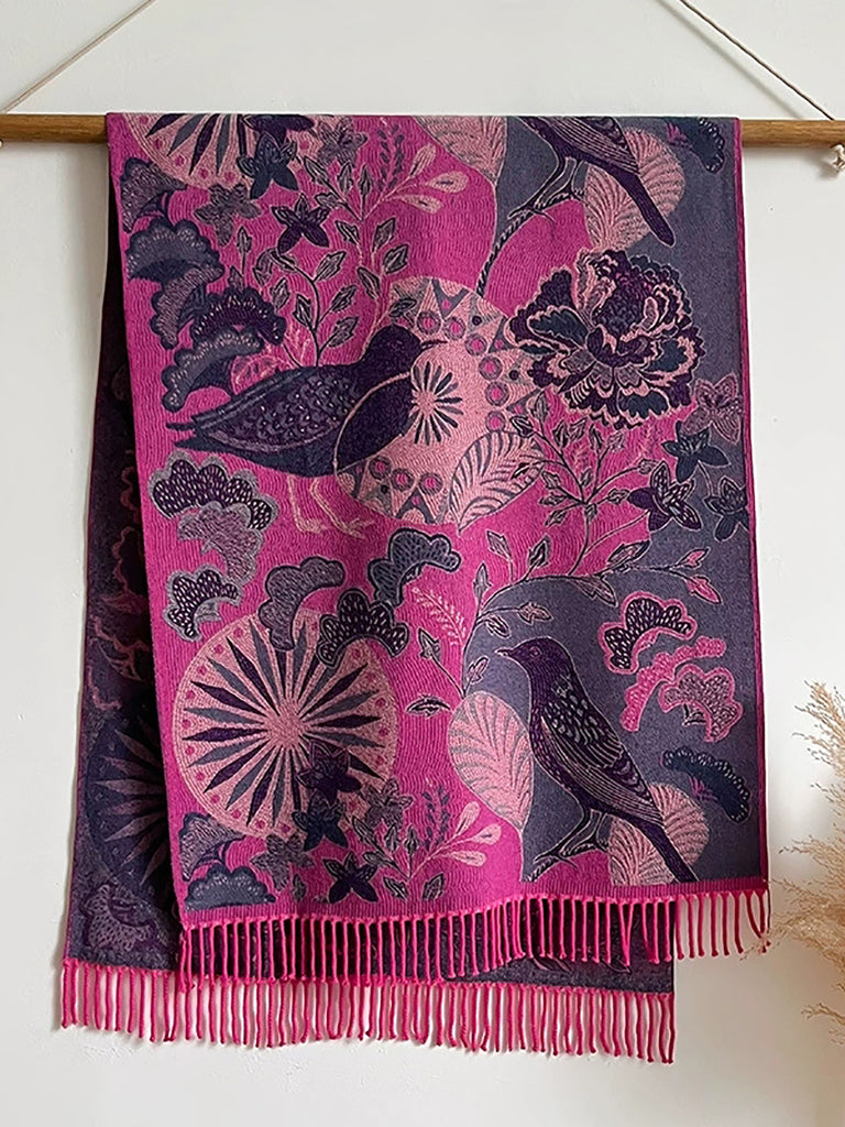Women Winter Ethnic Bird Flower Tassel Shawl Scarf