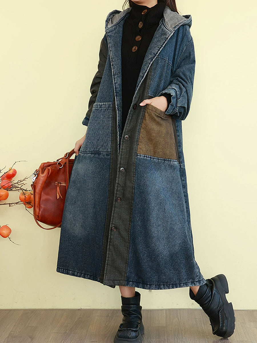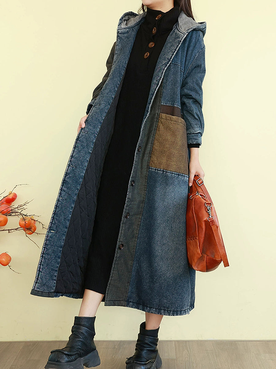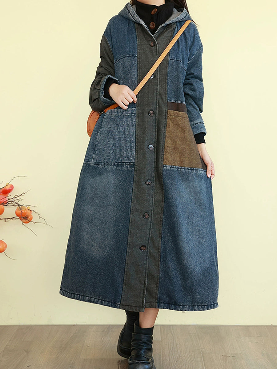 Women Winter Retro Colorblock Denim Hooded Padded Coat