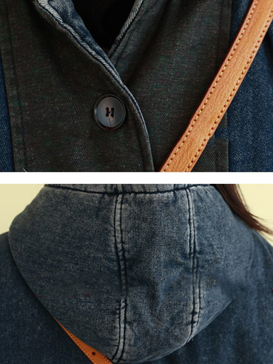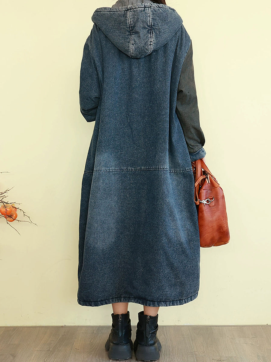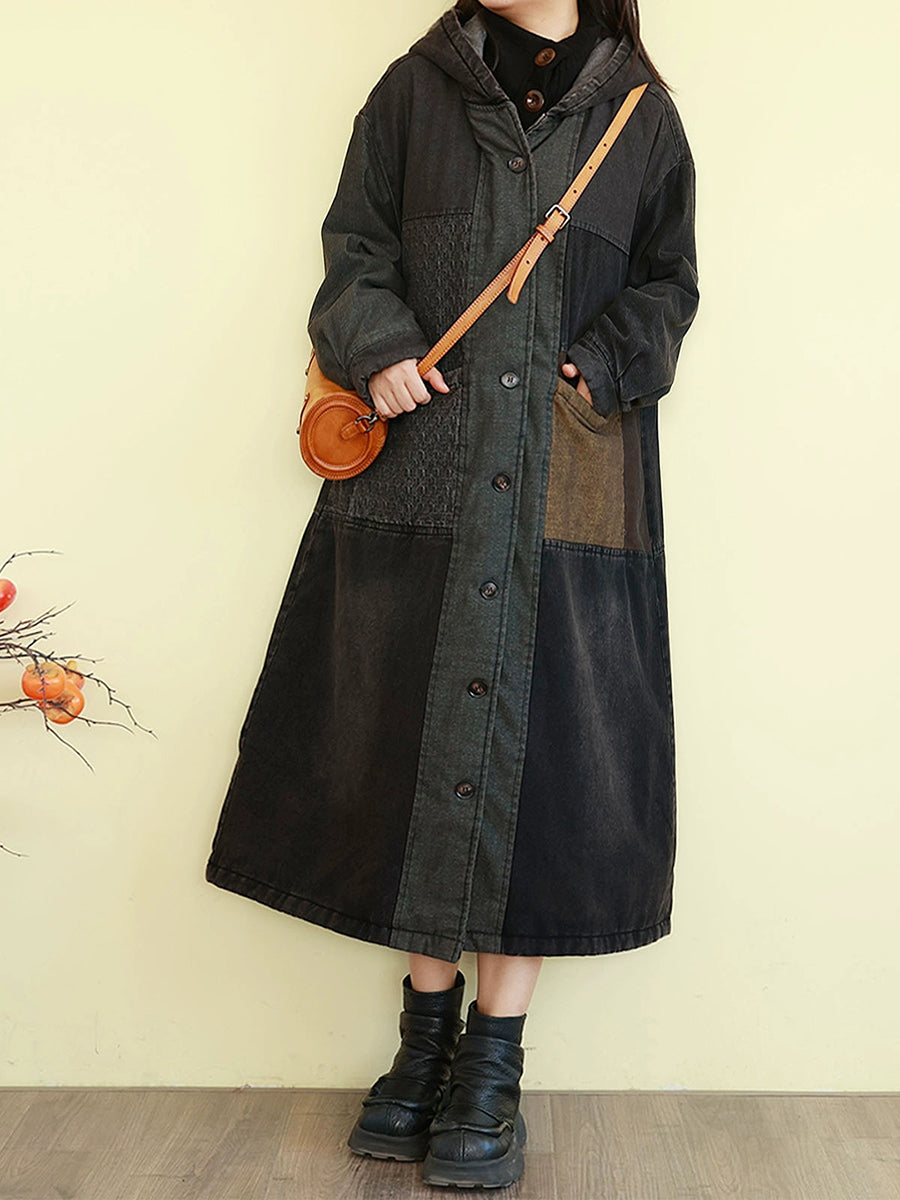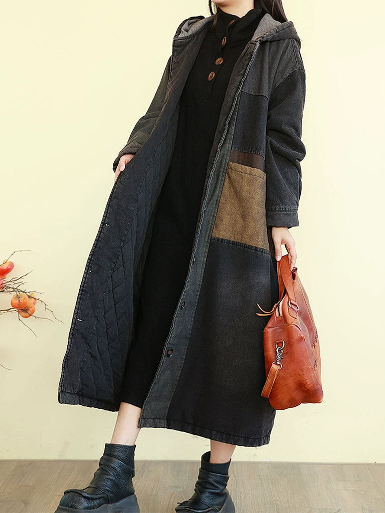 Women Winter Retro Colorblock Denim Hooded Padded Coat