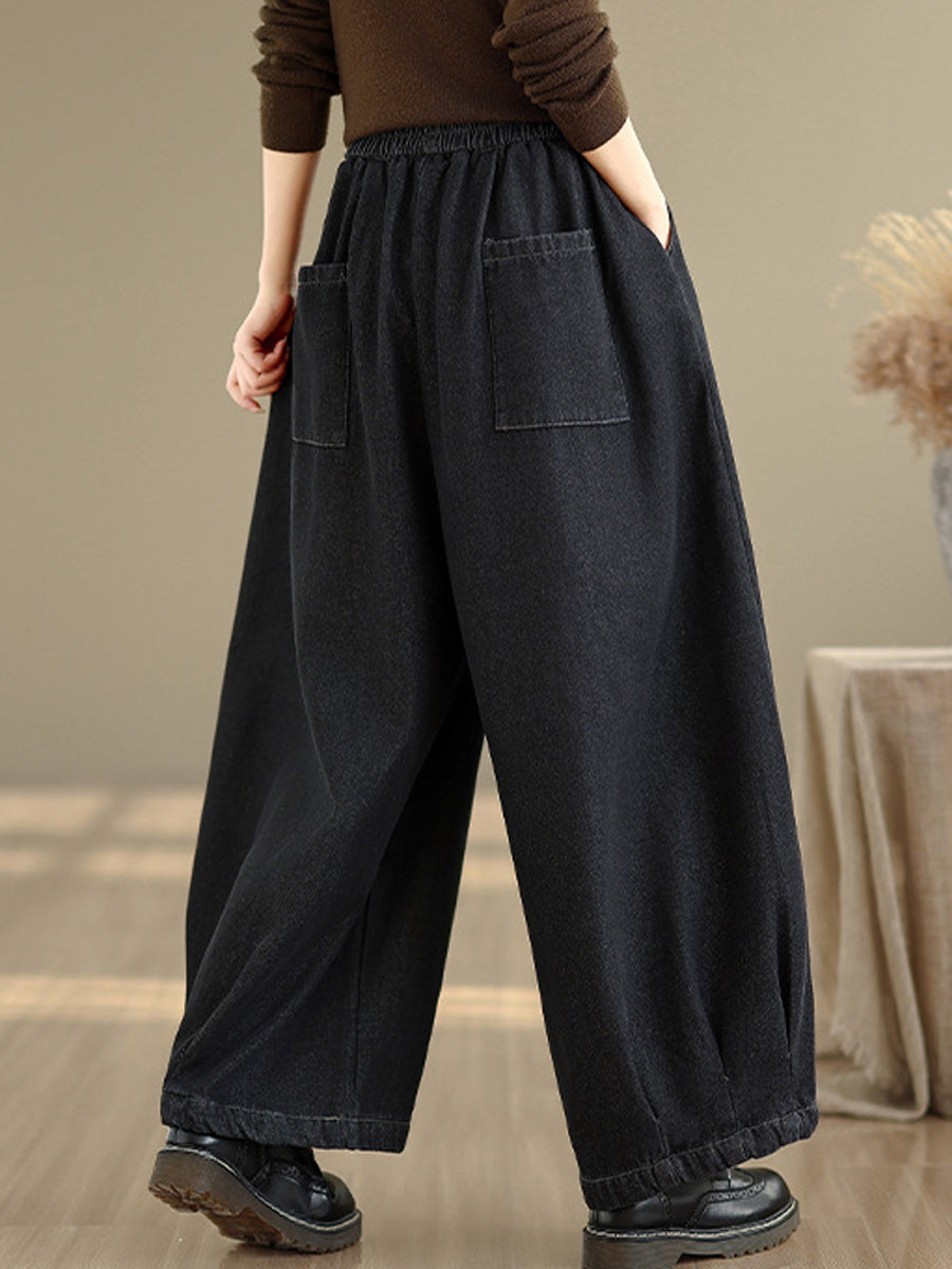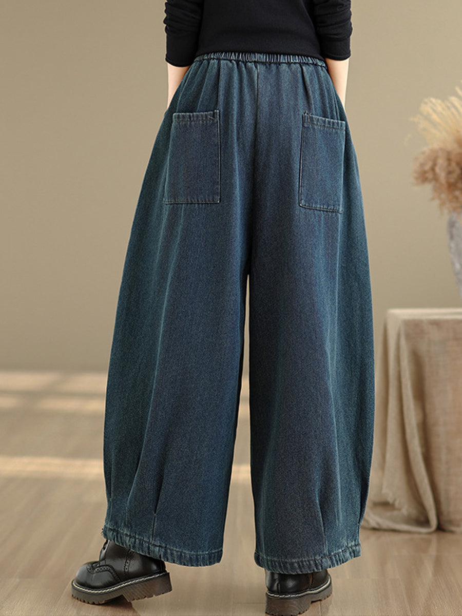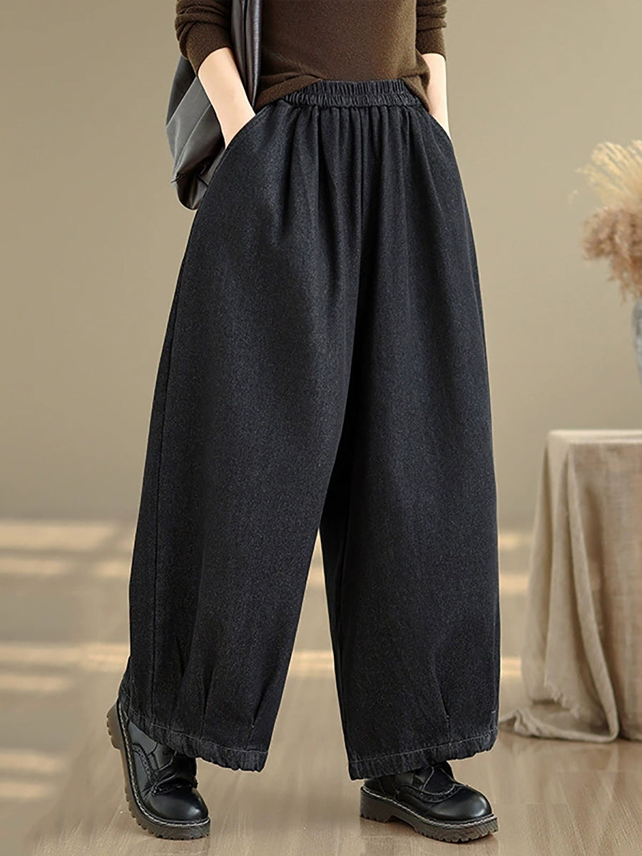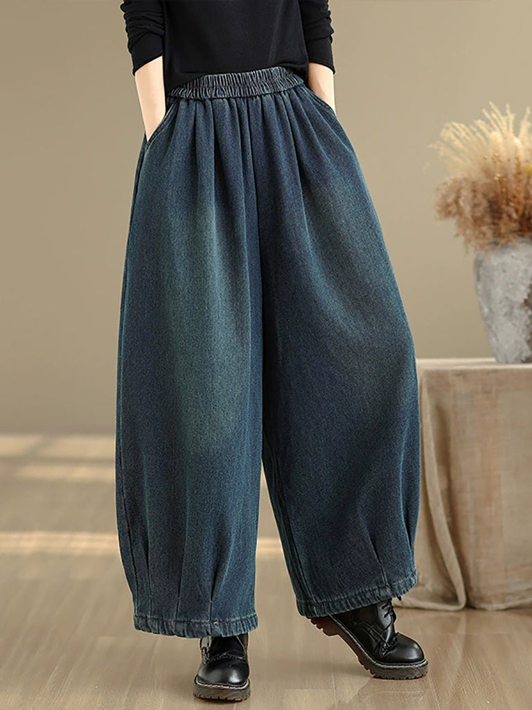 Women Winter Retro Denim Fleece-lined Wide-leg Pants