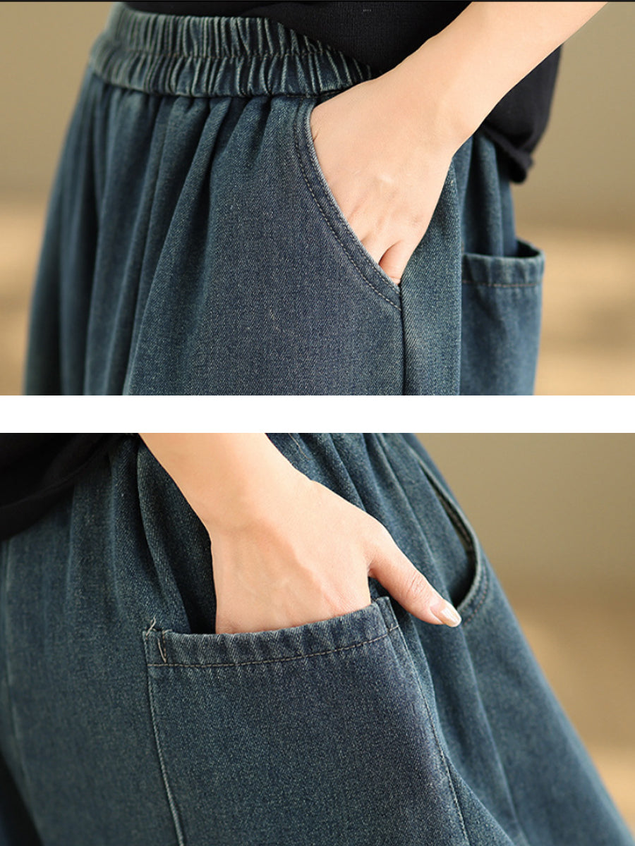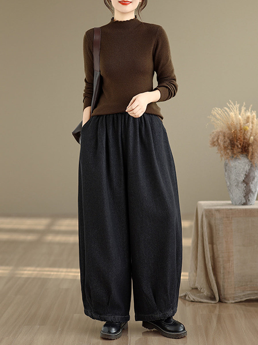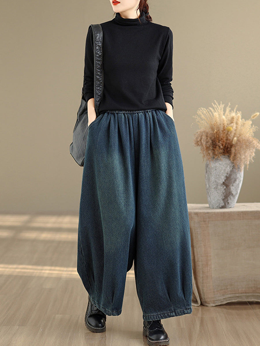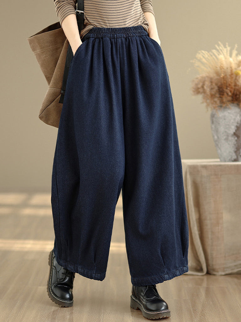 Women Winter Retro Denim Fleece-lined Wide-leg Pants