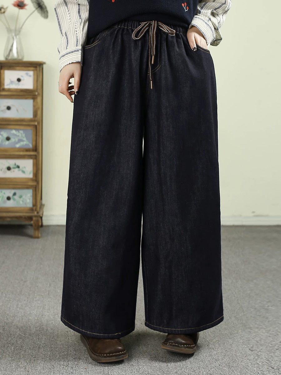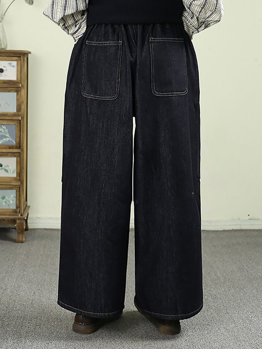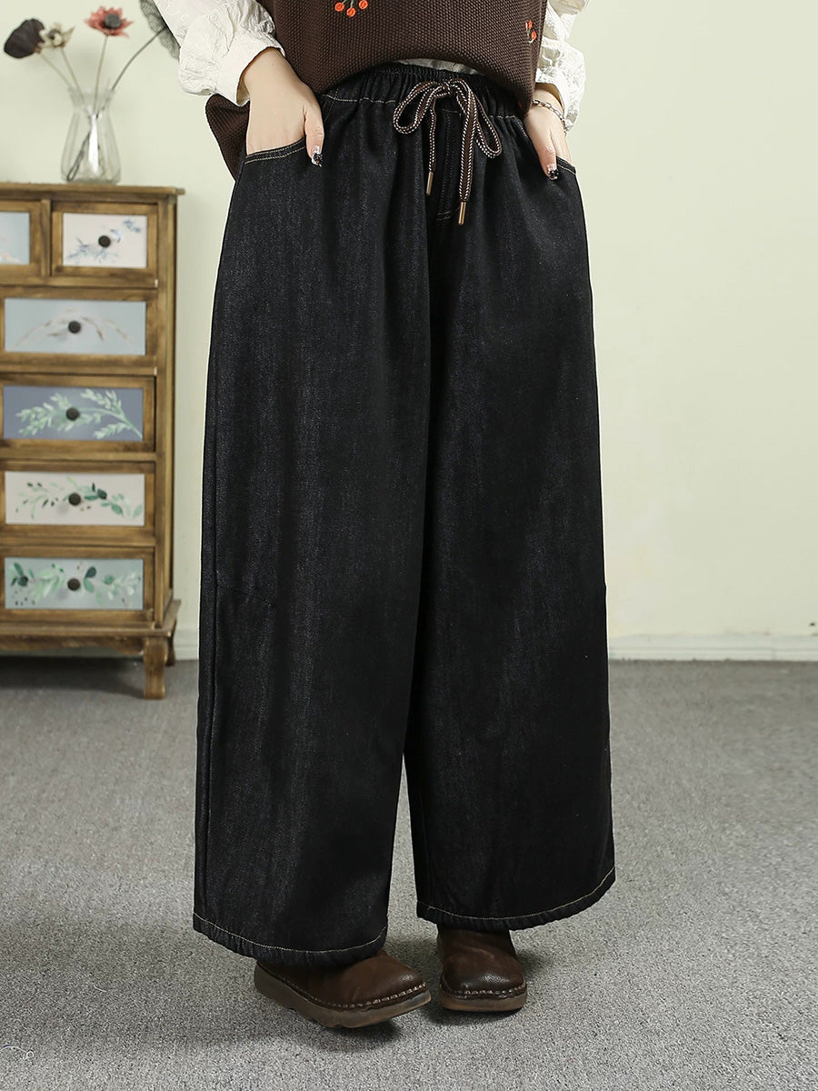 Women Winter Retro Denim Fleece-lined Wide-leg Pants