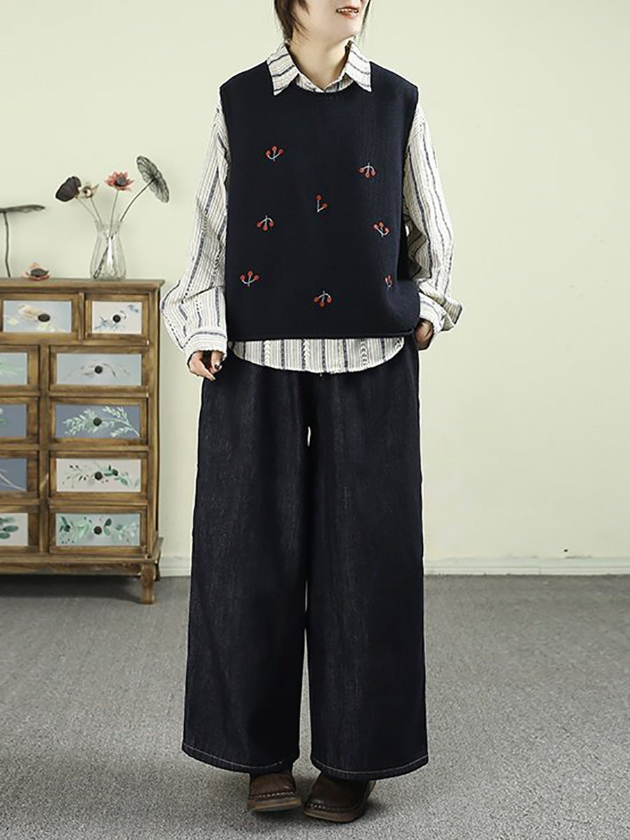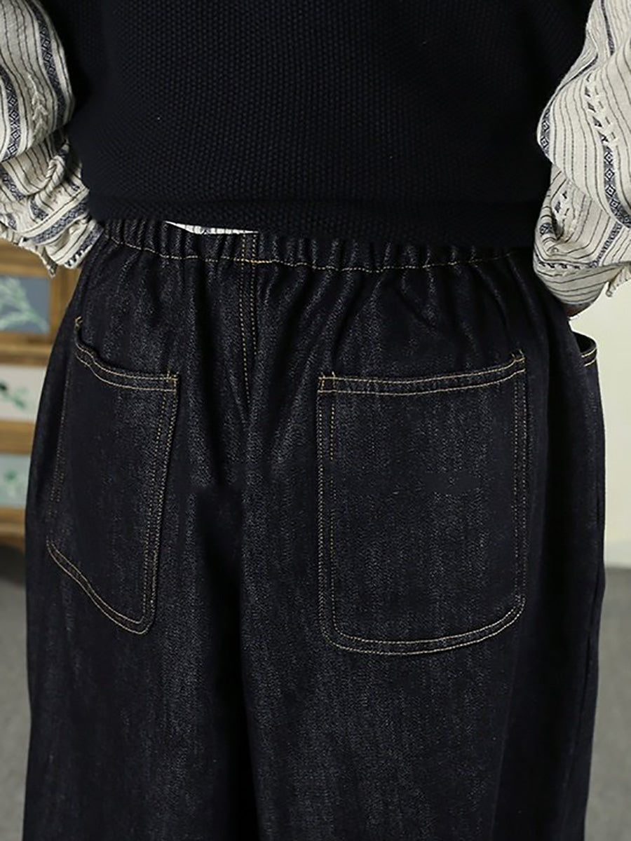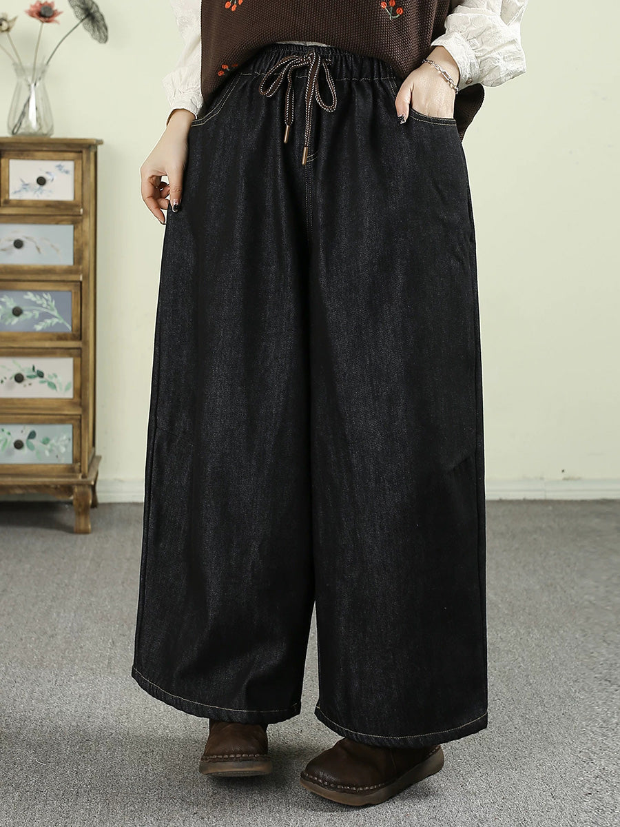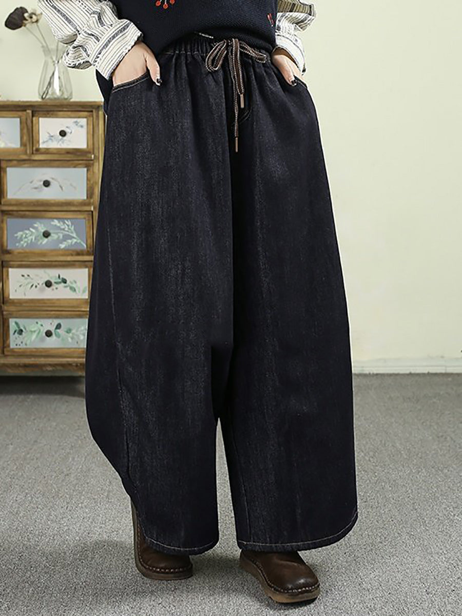 Women Winter Retro Denim Fleece-lined Wide-leg Pants