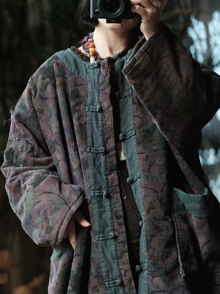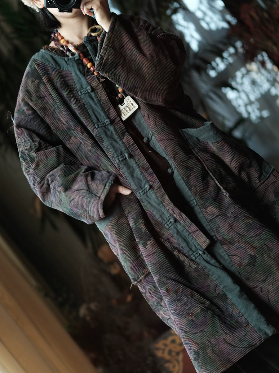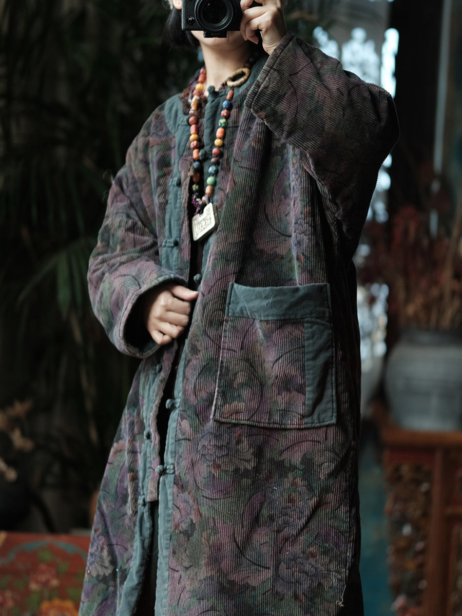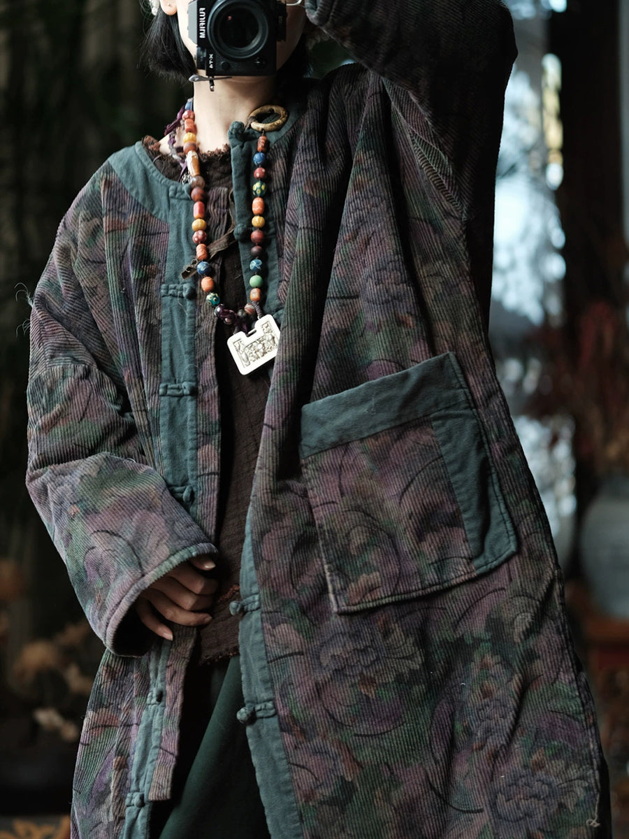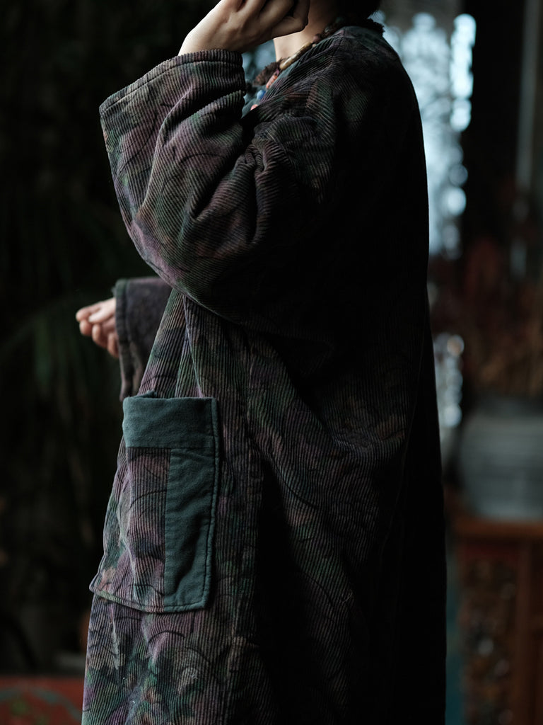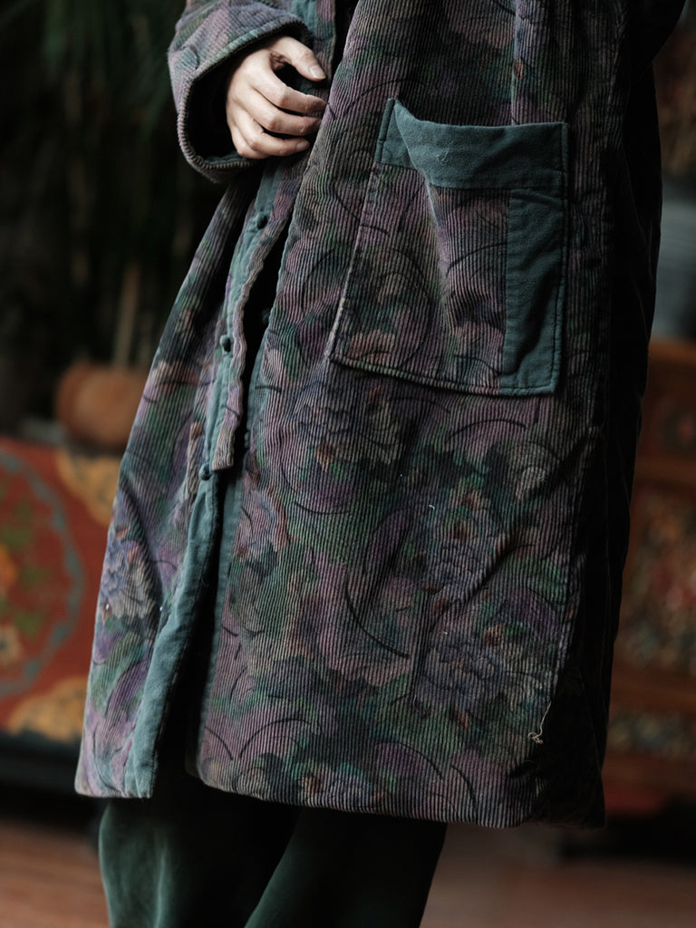 Women Winter Retro Flower O-Neck Corduroy Padded Coat