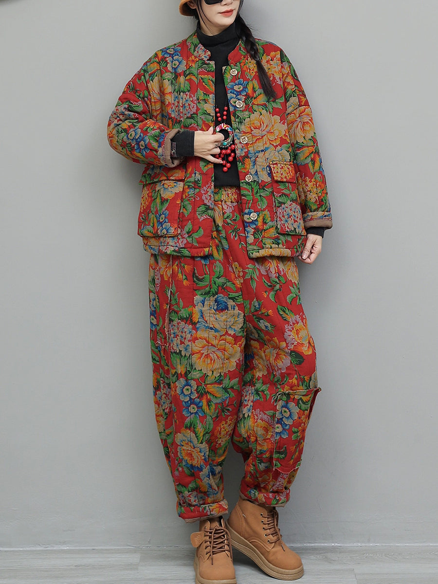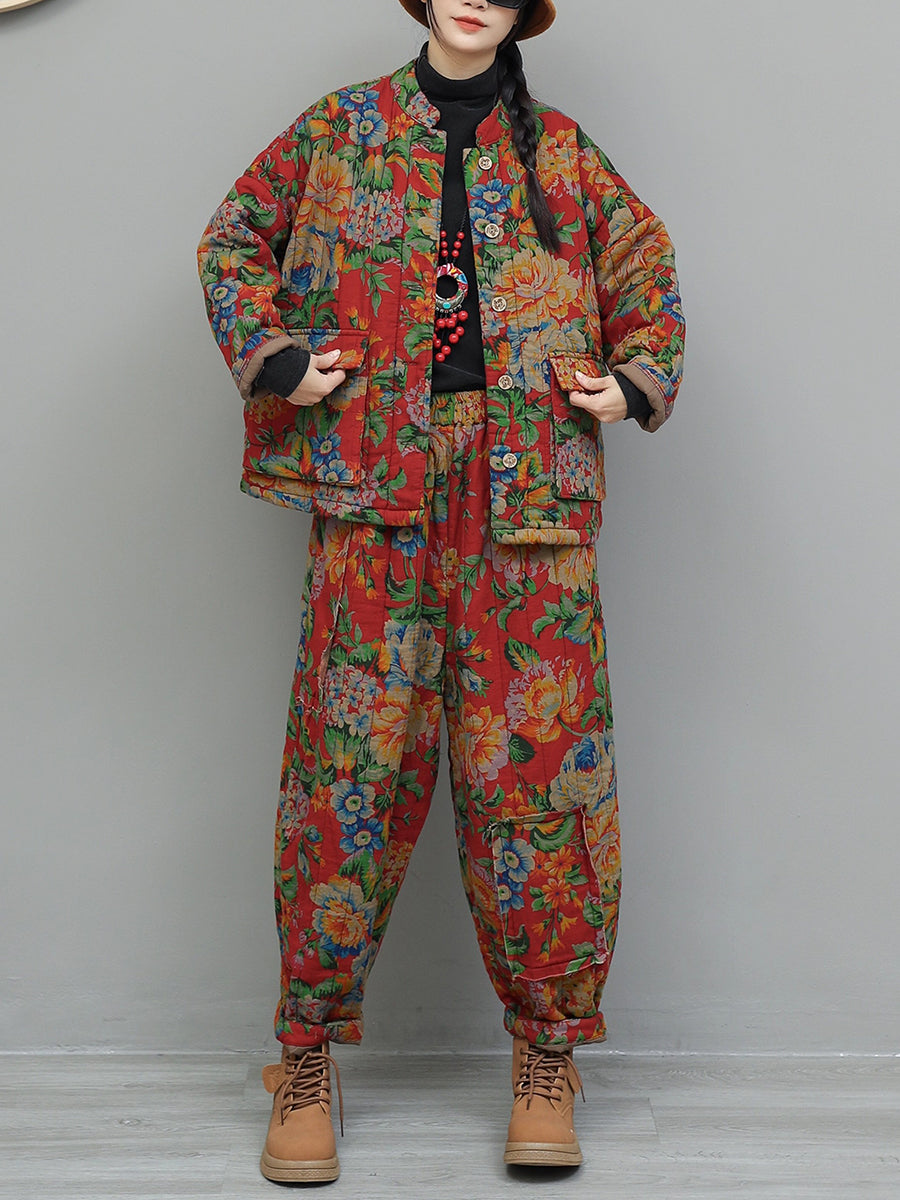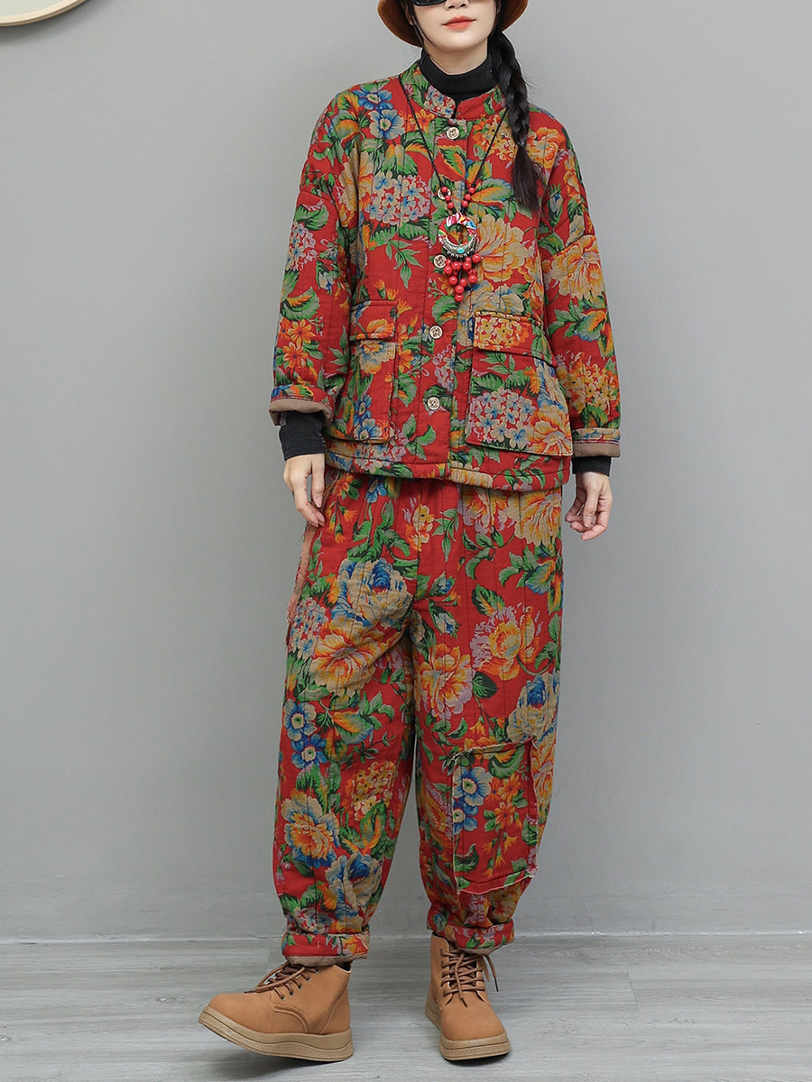 Women Winter Retro Flower Stand Collar Padded Suits