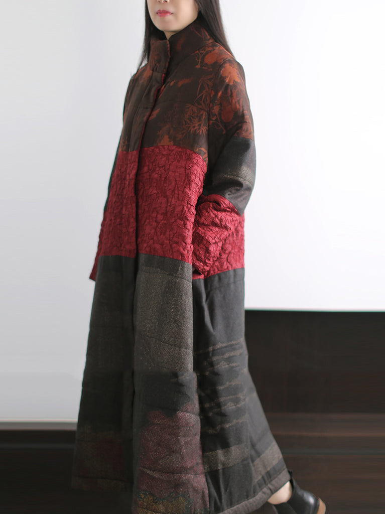 Women Winter Retro Spliced Stand Collar Padded Long Coat