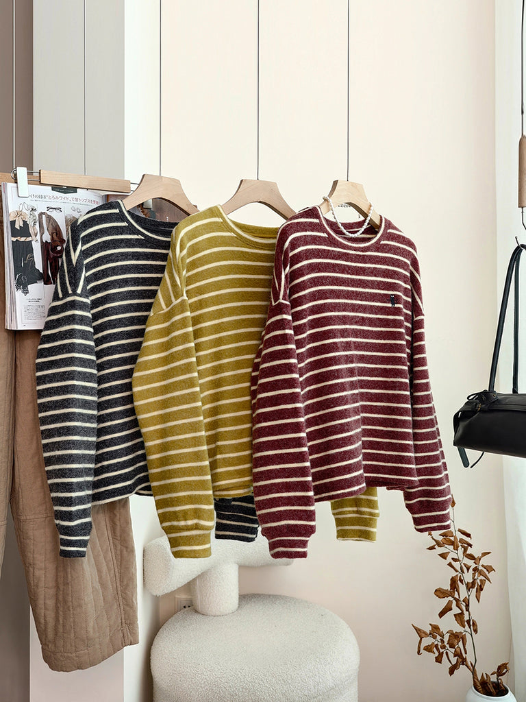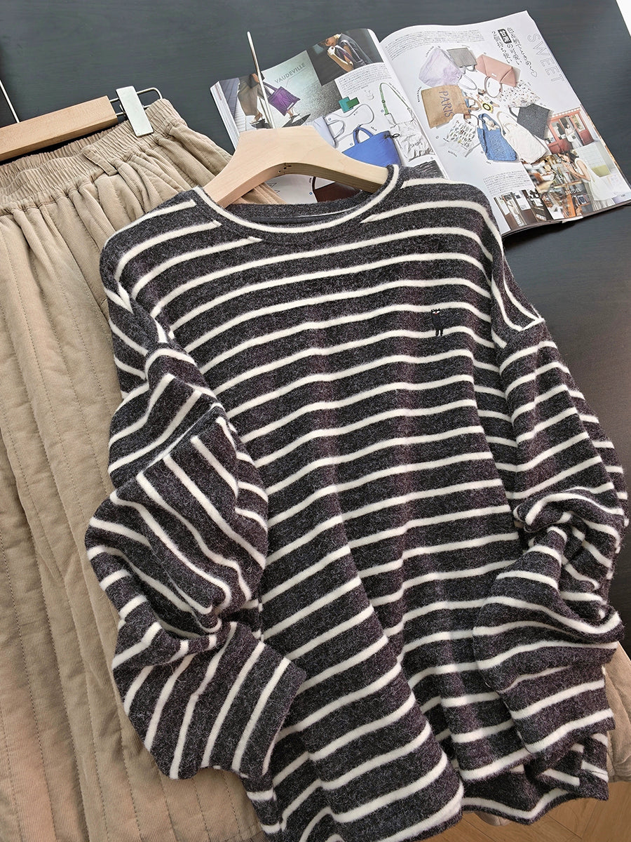 Women Winter Retro Stripe O-Neck Blouse