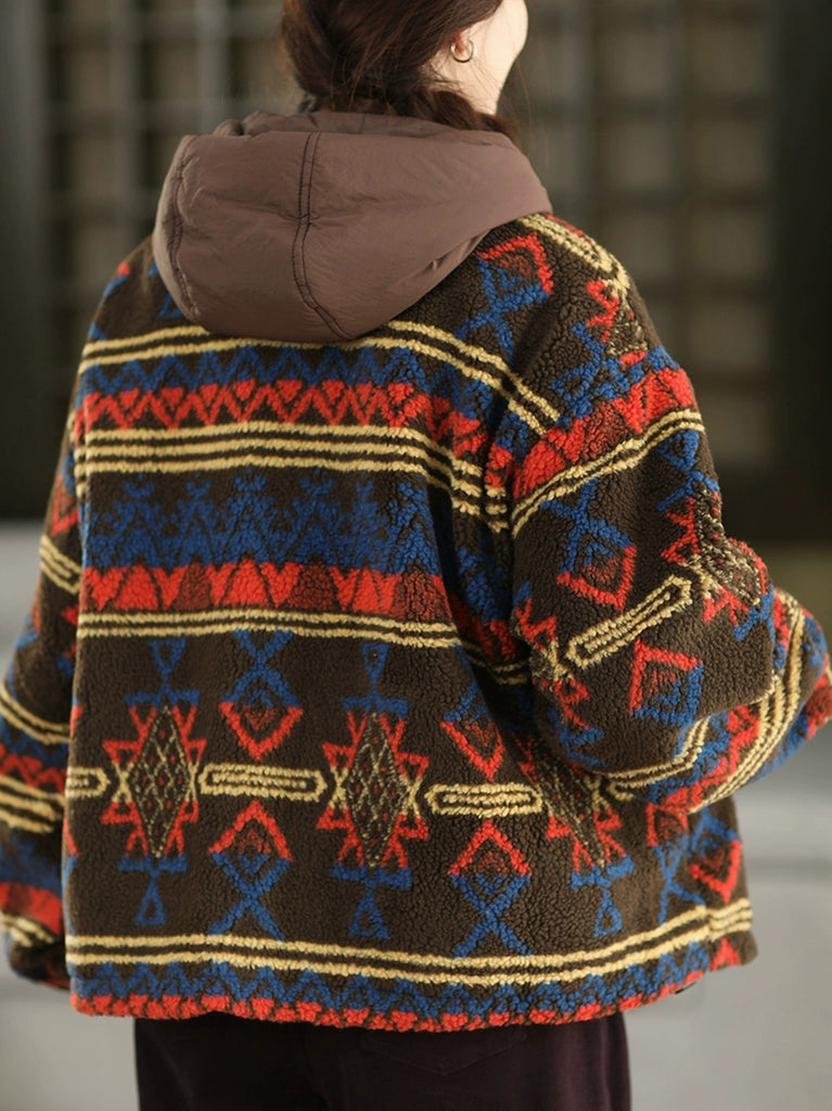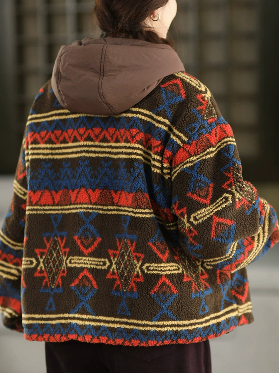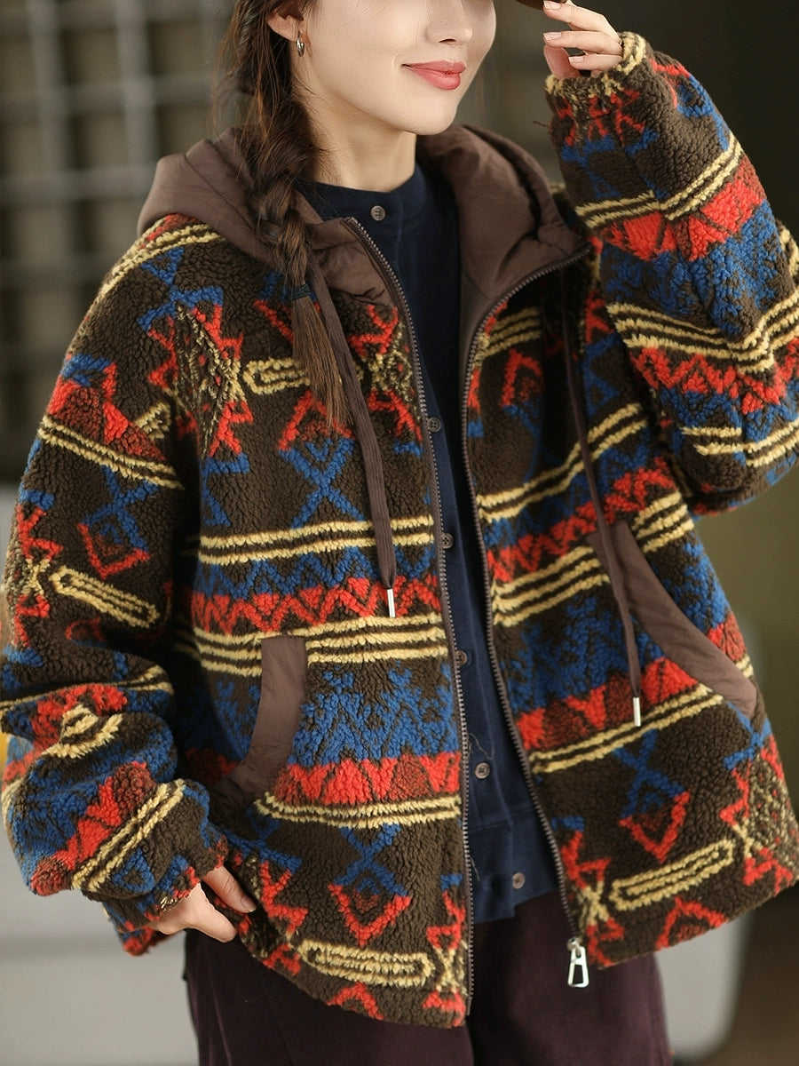 Featuring a printed design, this vintage-inspired fleece coat for women includes a hooded collar and full-length regular sleeves. Perfectly suited for autumn and winter seasons, it combines classic style with warmth and comfort.