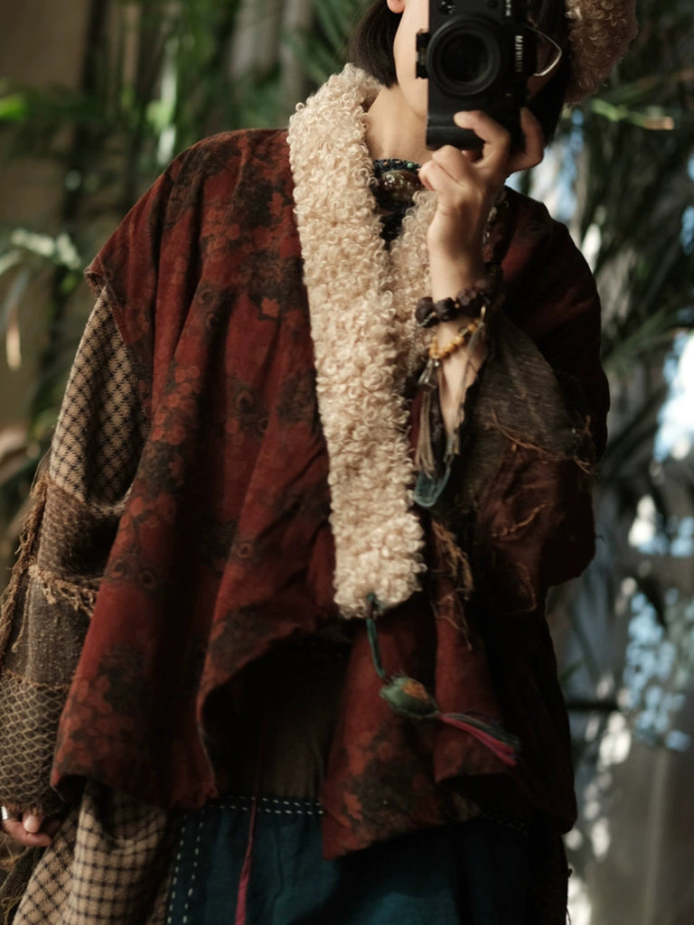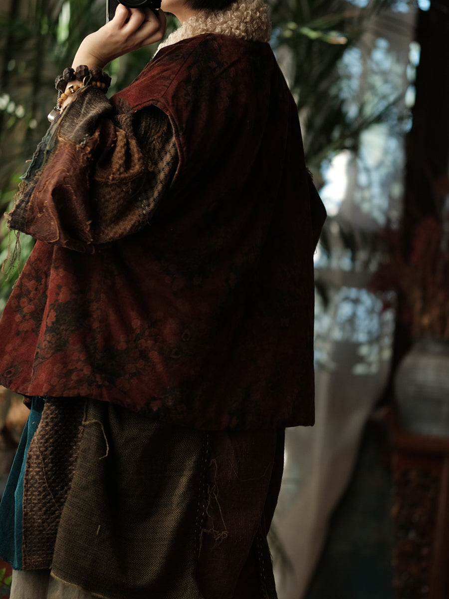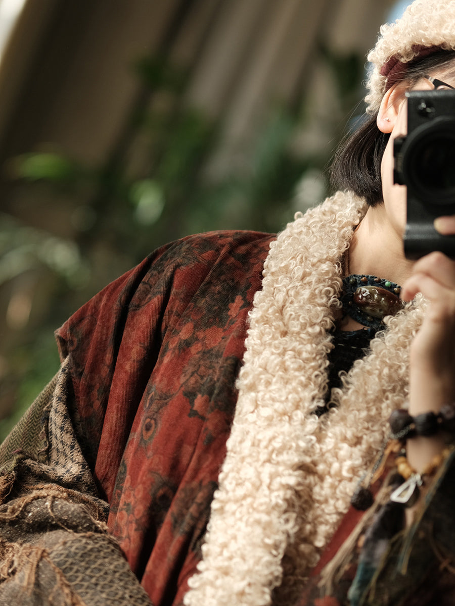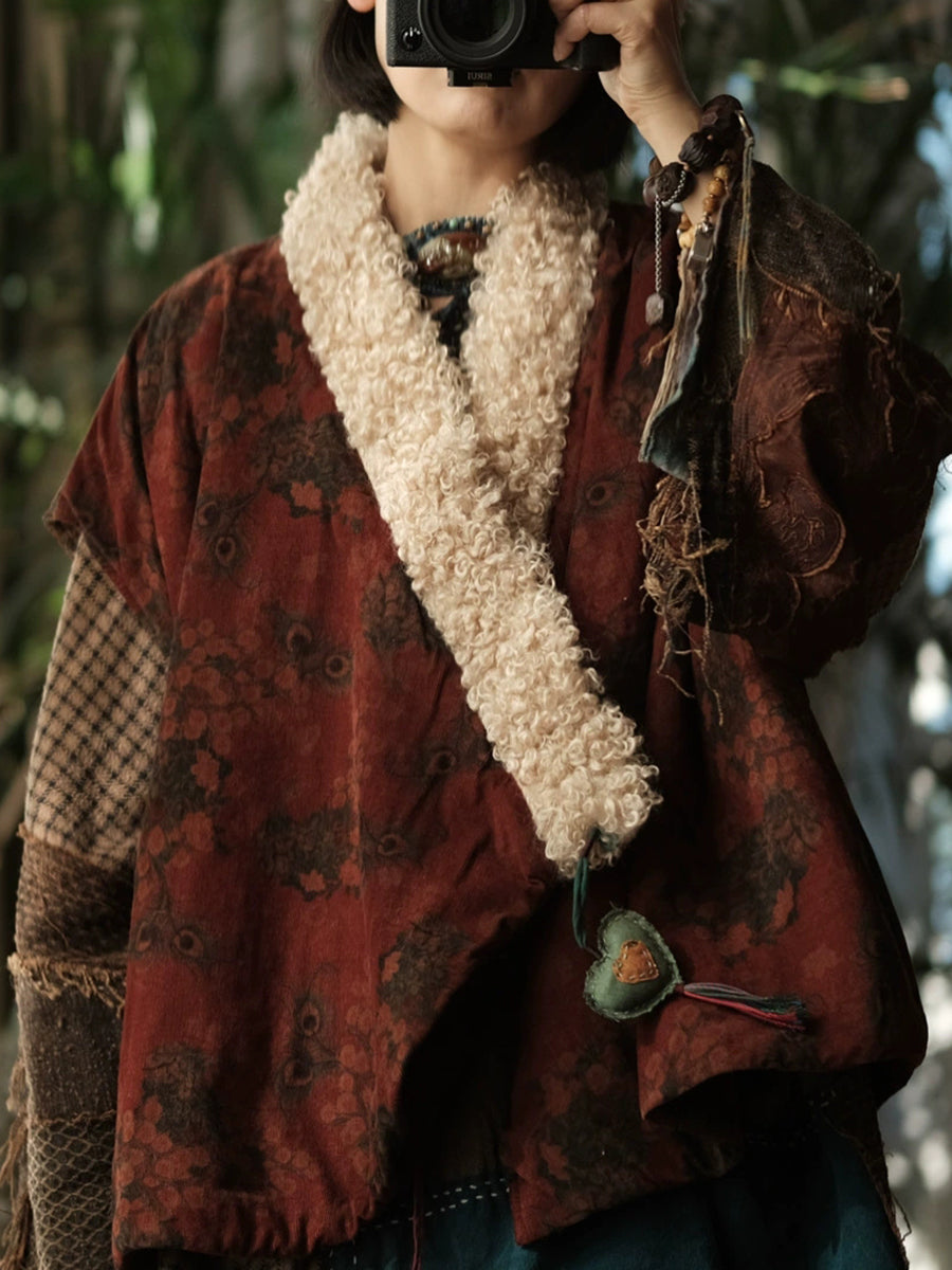 Women Winter Vintage Flower Fleece Spliced Padded Vest