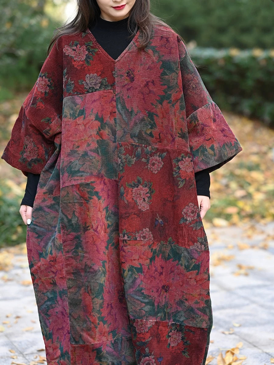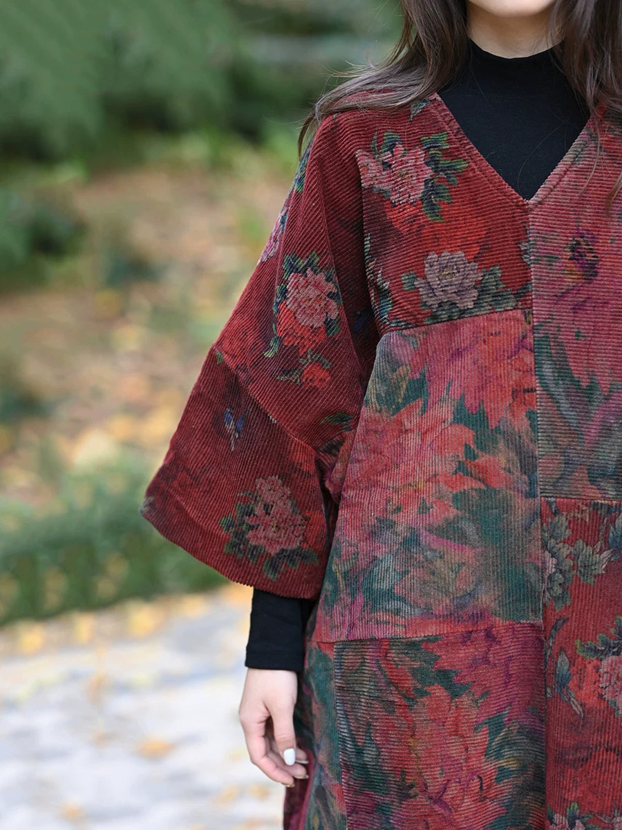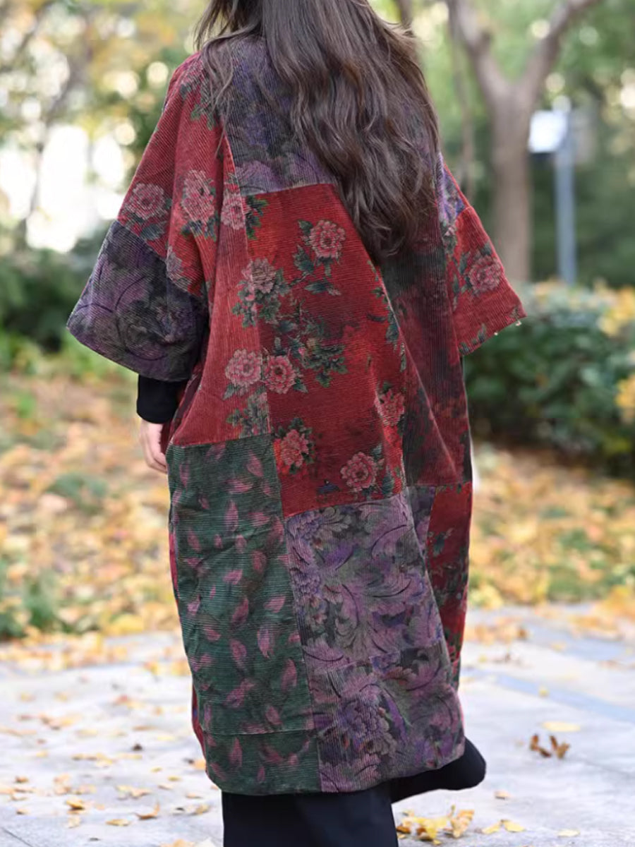 Women Winter Vintage Flower Patch Spliced Corduroy Robe Coat