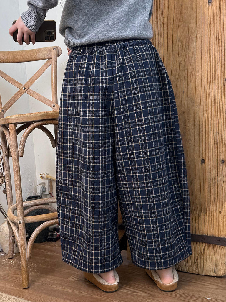 Women Winter Vintage Plaid Fleece-lined Wide-leg Pants
