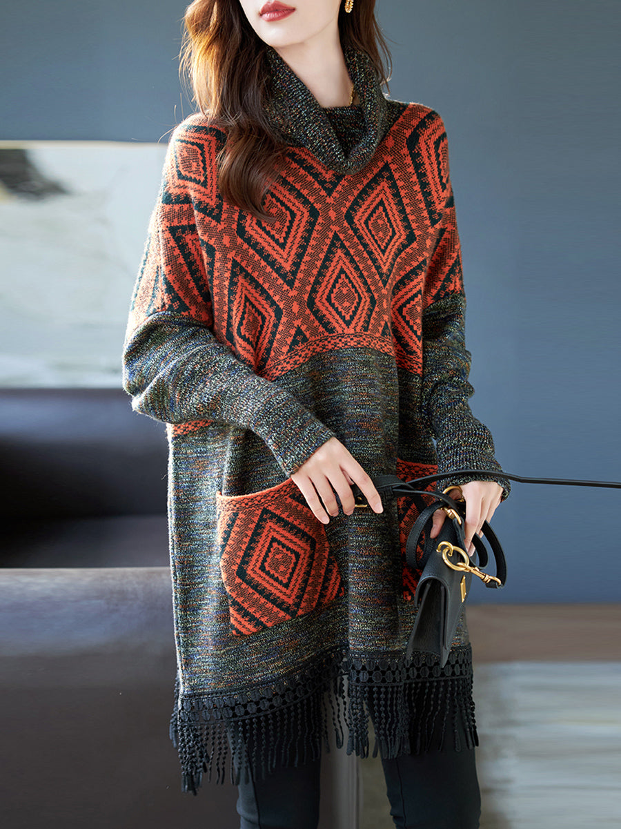 Women Winter Vintage Rhomboids Spliced Turtleneck Tassel Sweater