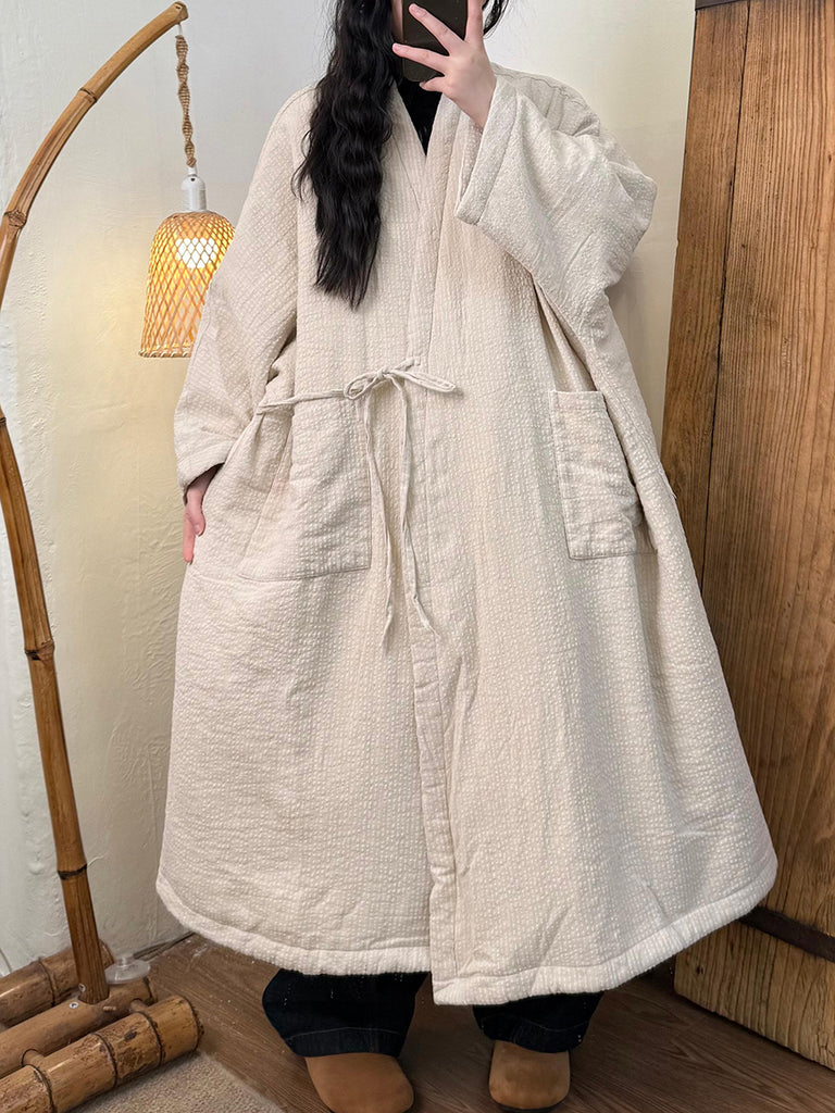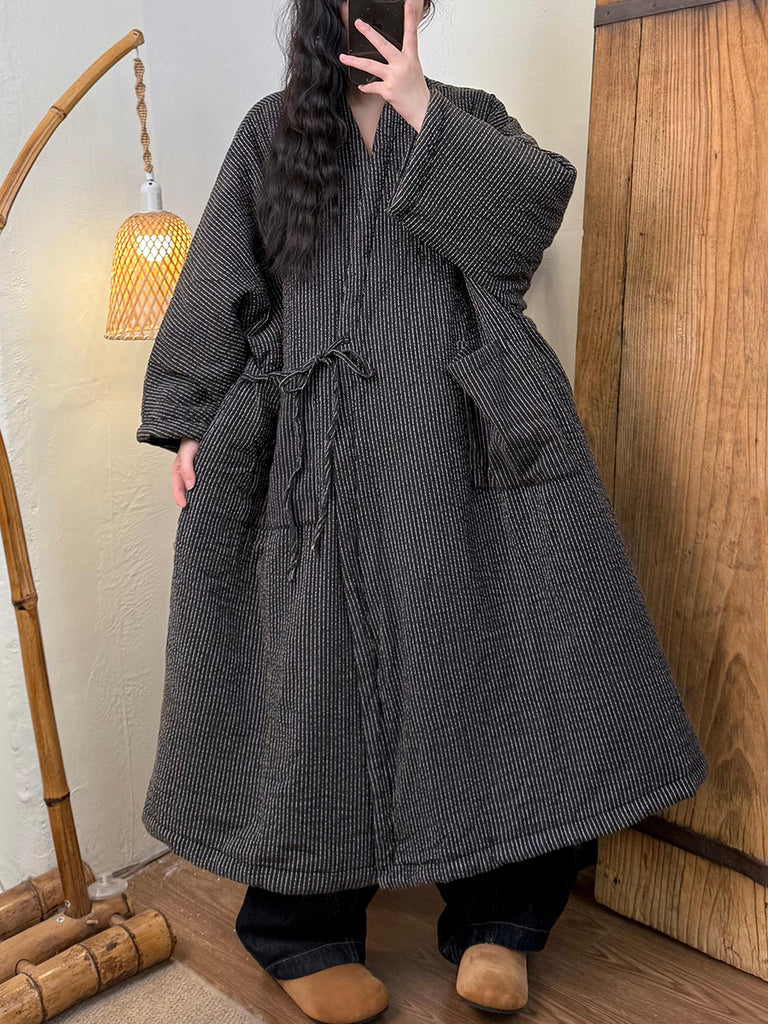Women Winter Vintage Stripe Padded V-Neck Overcoat