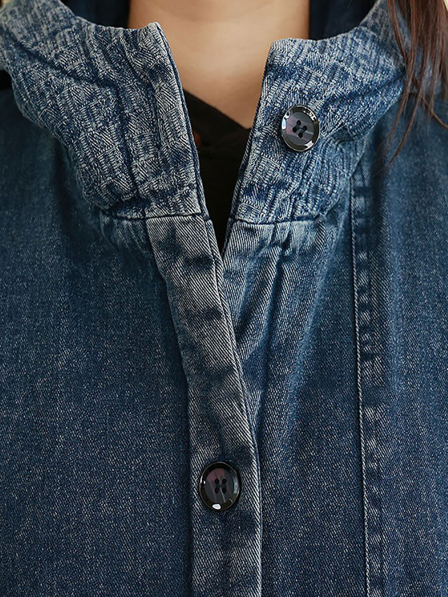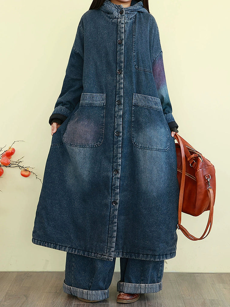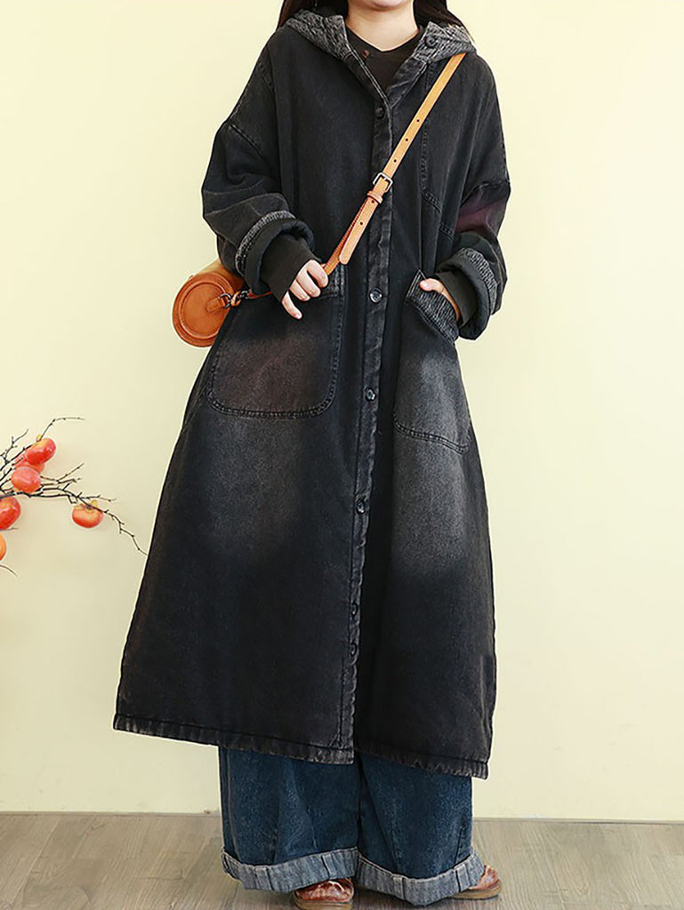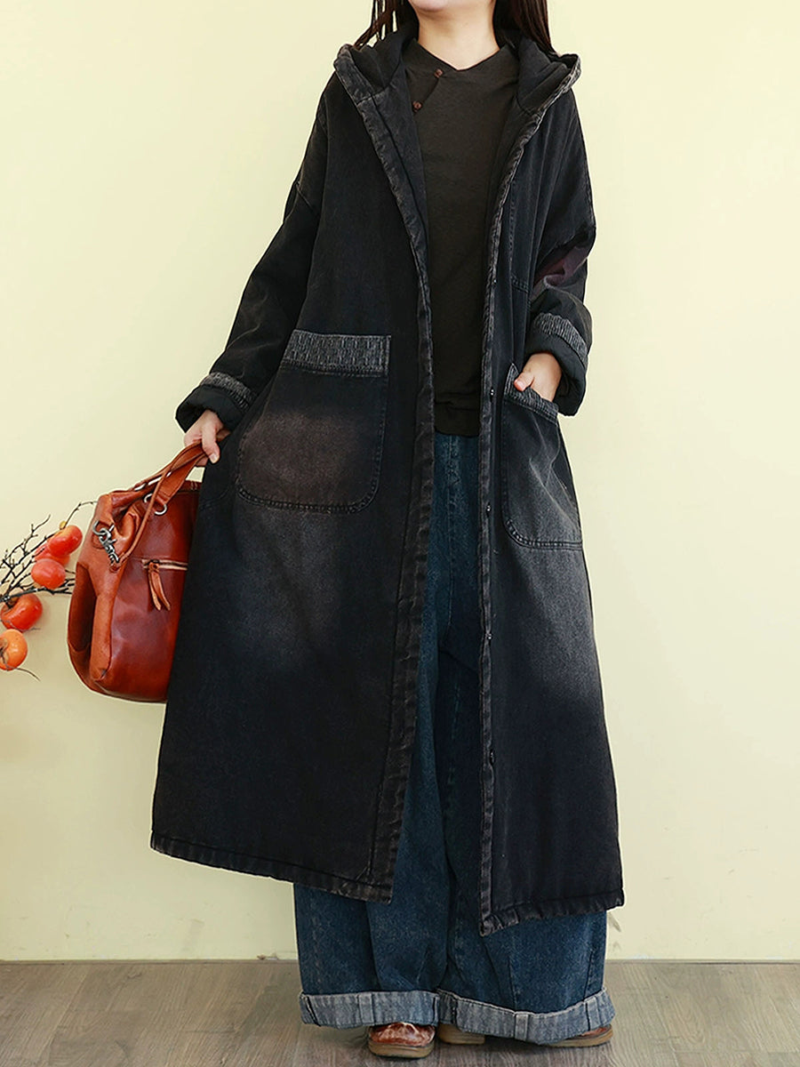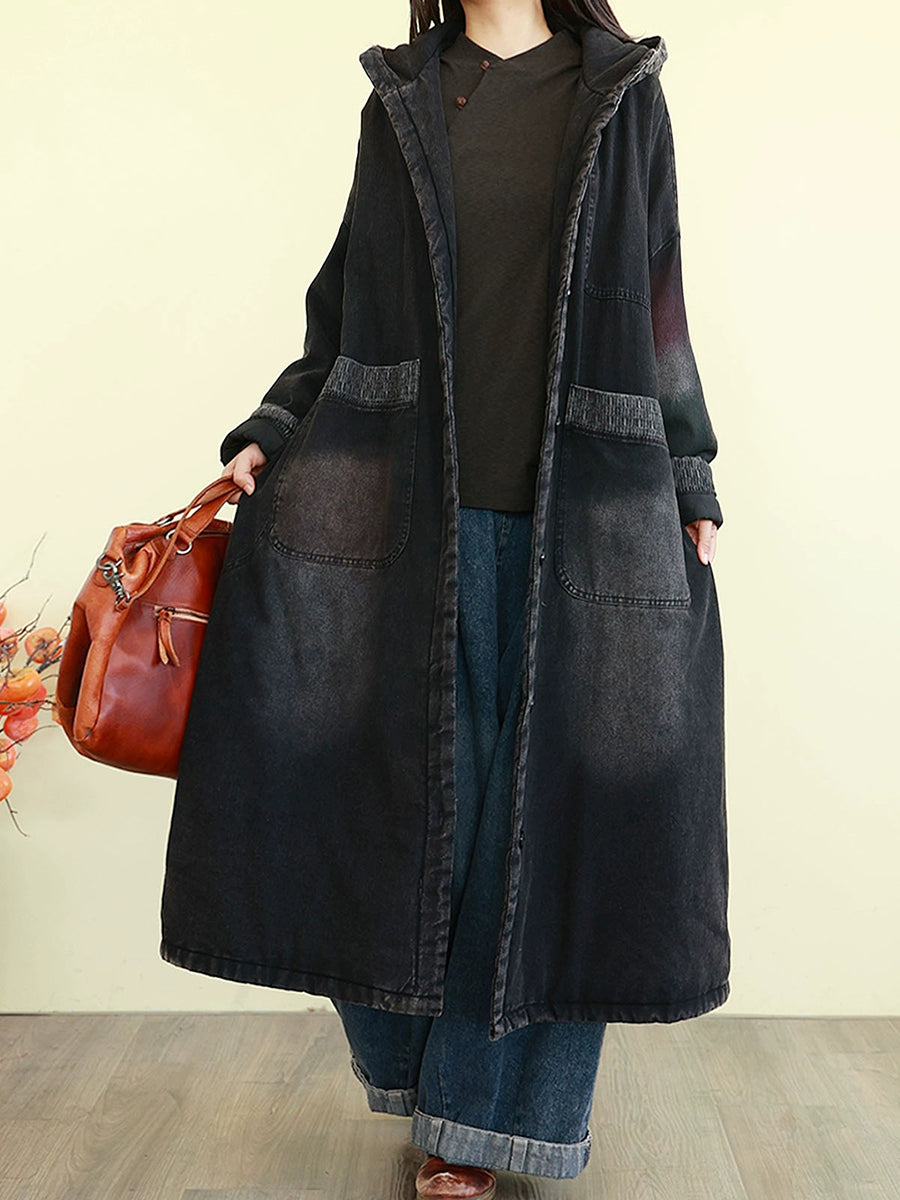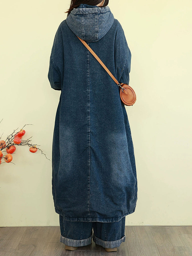 Women Winter Vintage Washed Denim Padded Hooded Coat