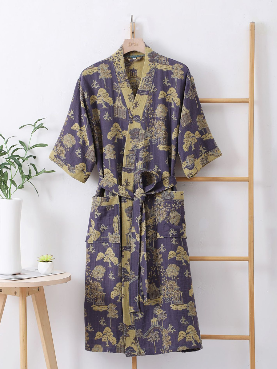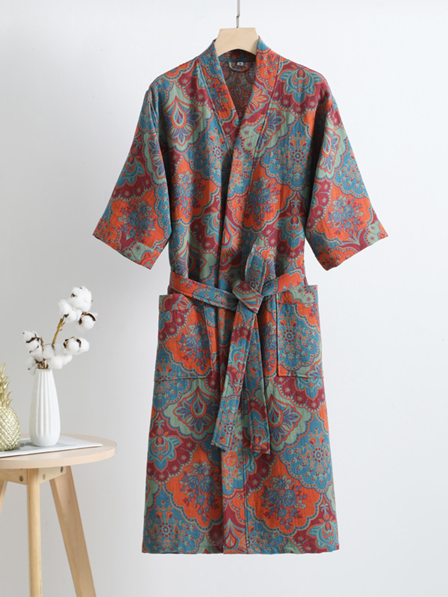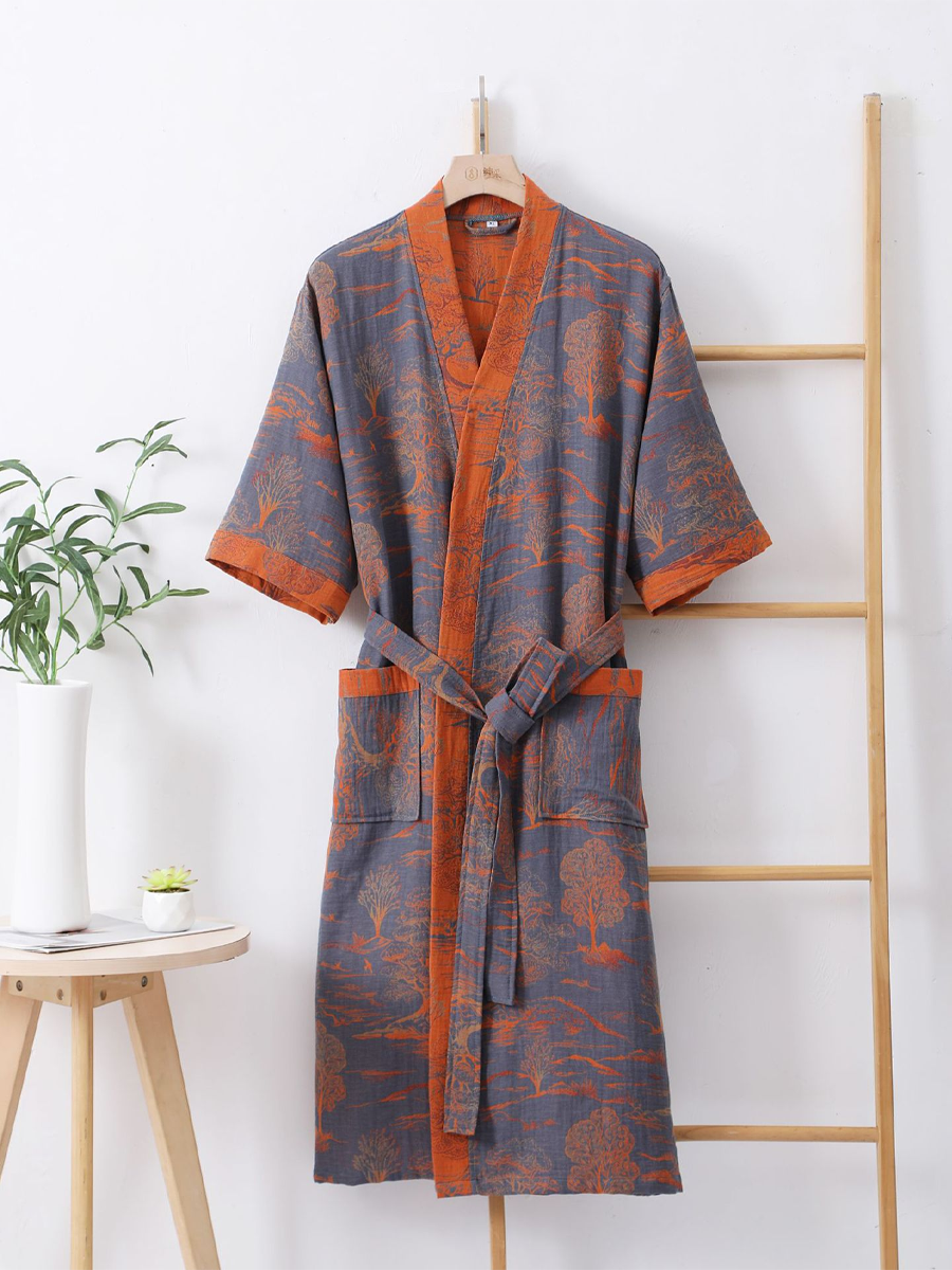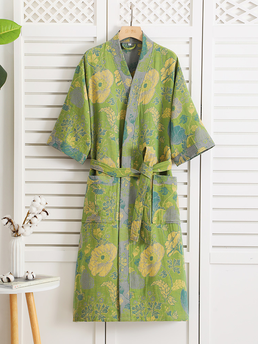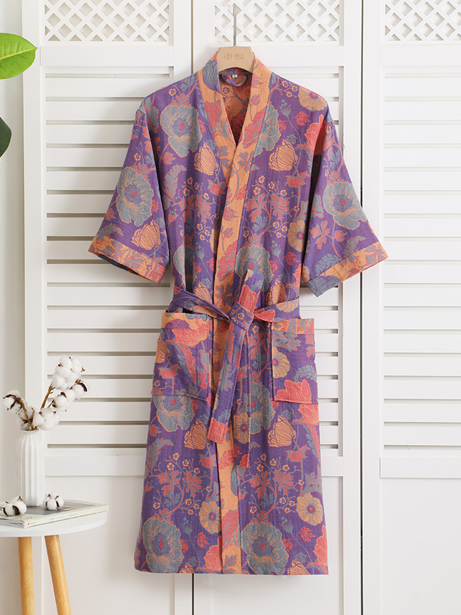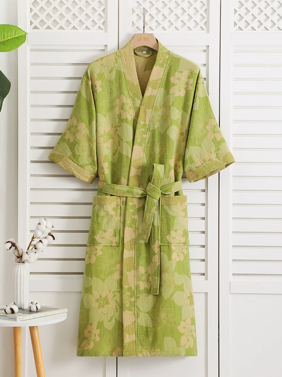 Náš župan z bavlněné gázy má středně dlouhou až dlouhou délku, která sahá pod kolena, a je vyroben ze 100% bavlněné gázy. Díky měkké textuře a elegantnímu květinovému vzoru s paisley vzorem je tento prodyšný a odolný župan ideální pro lenošení doma nebo po sprše a nabízí stylový a pohodlný zážitek.