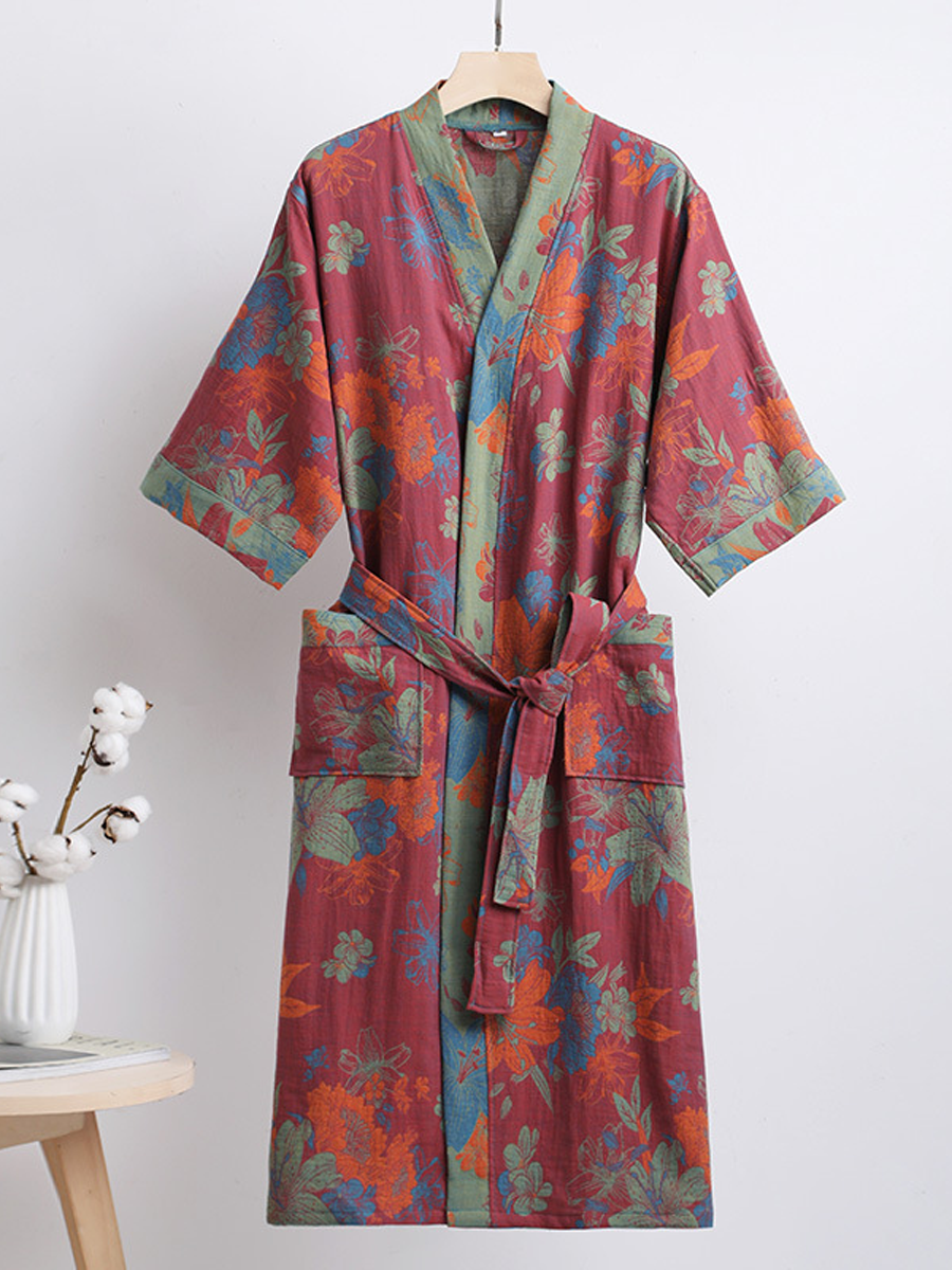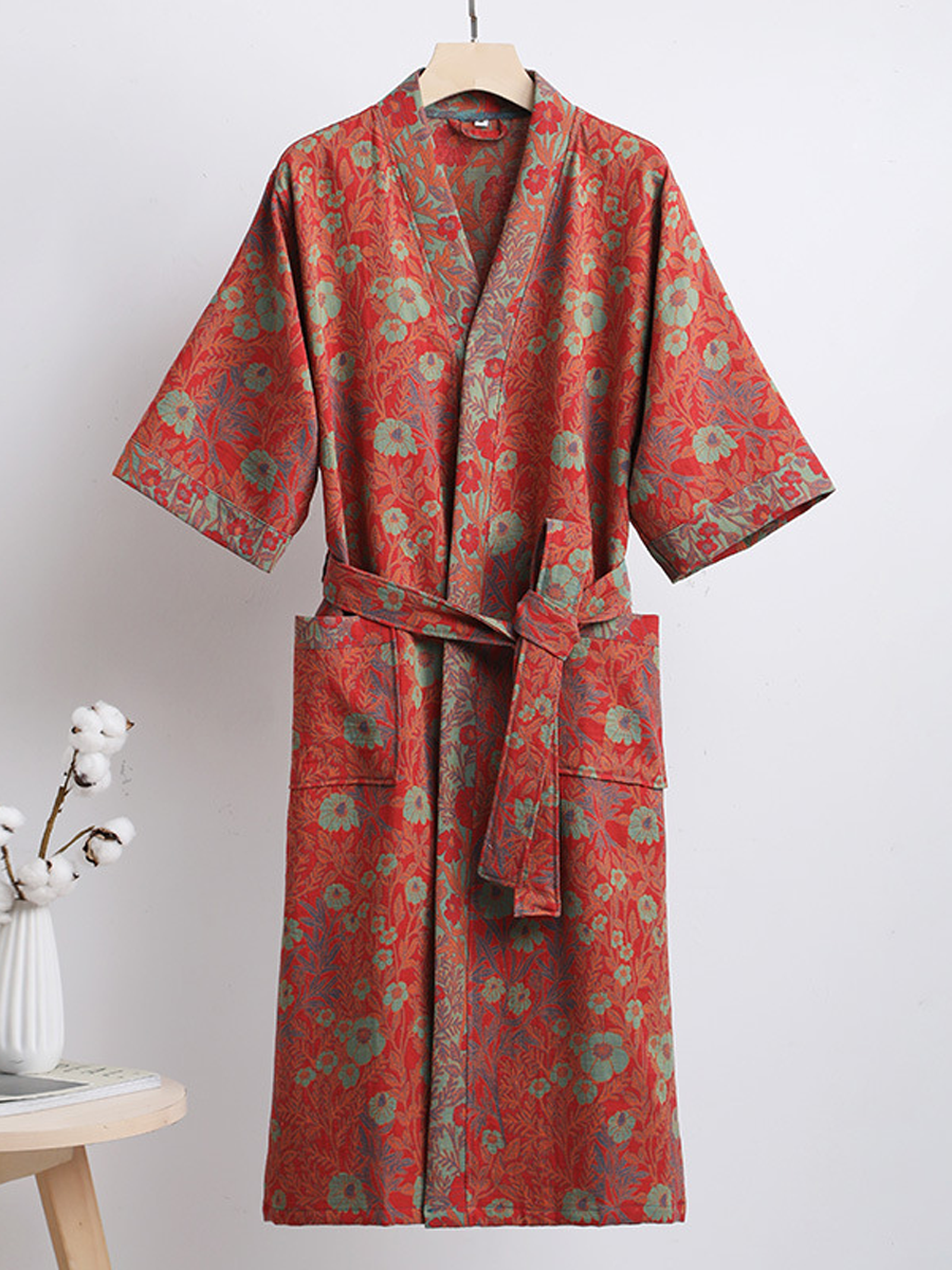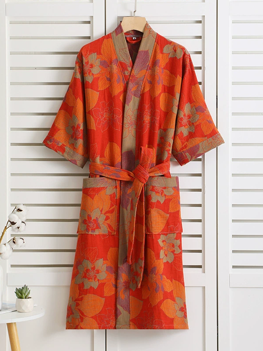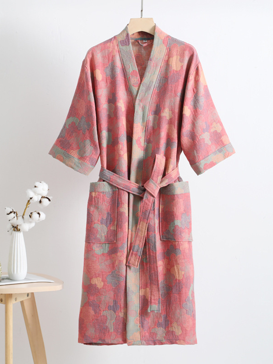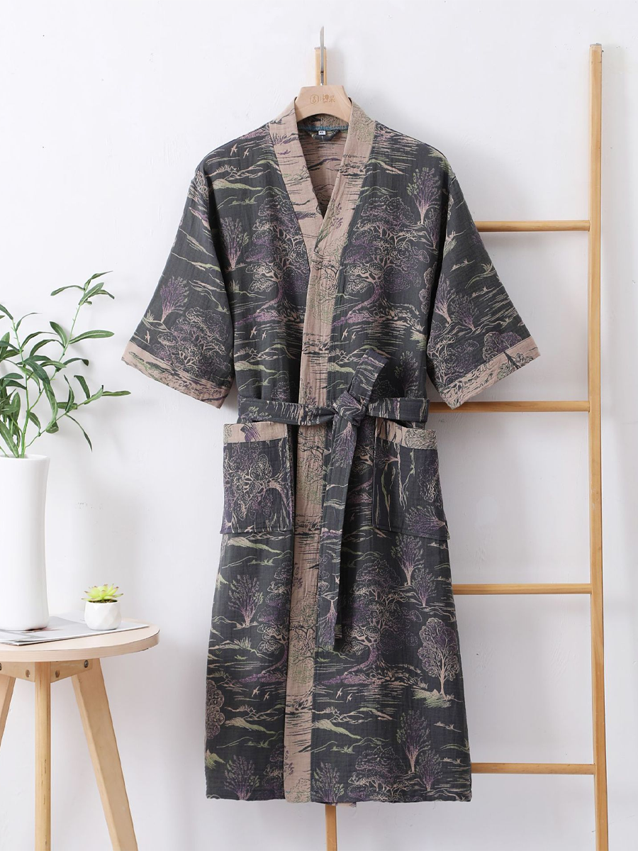 Náš župan z bavlněné gázy má středně dlouhou až dlouhou délku, která sahá pod kolena, a je vyroben ze 100% bavlněné gázy. Díky měkké textuře a elegantnímu květinovému vzoru s paisley vzorem je tento prodyšný a odolný župan ideální pro lenošení doma nebo po sprše a nabízí stylový a pohodlný zážitek.