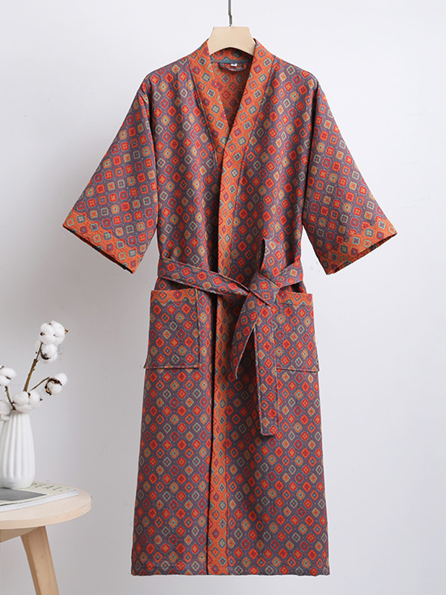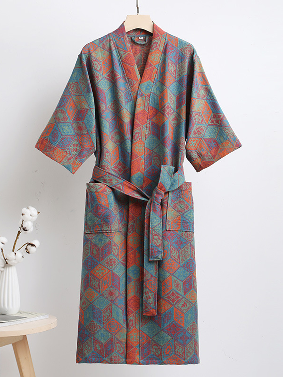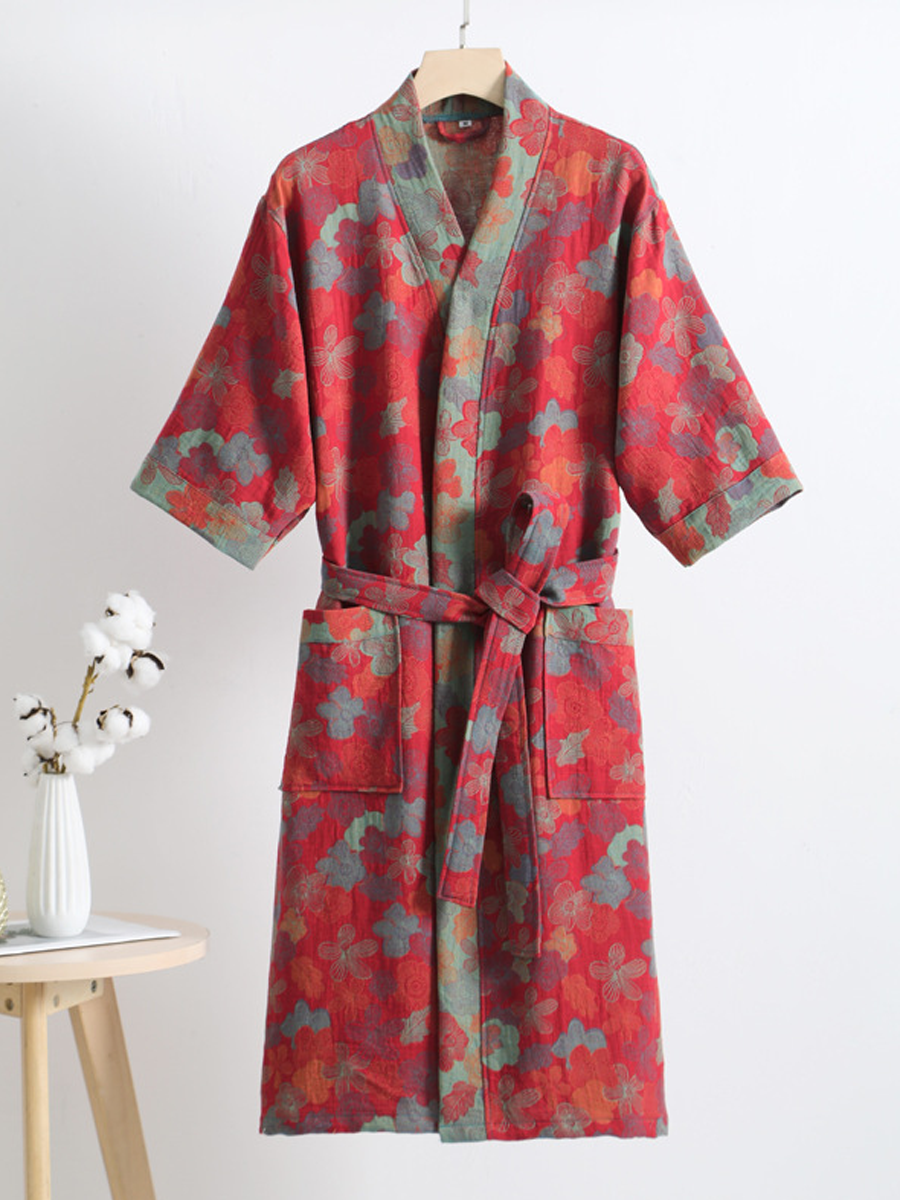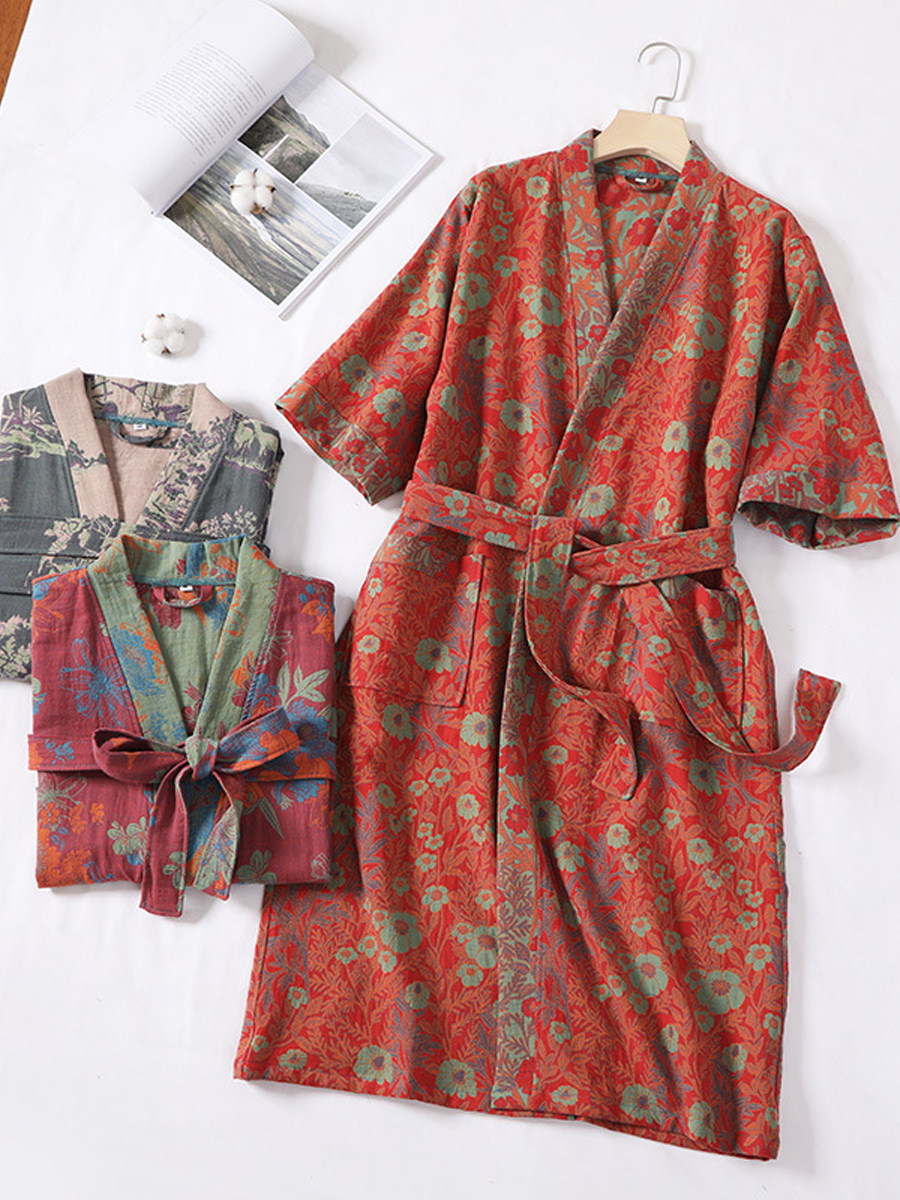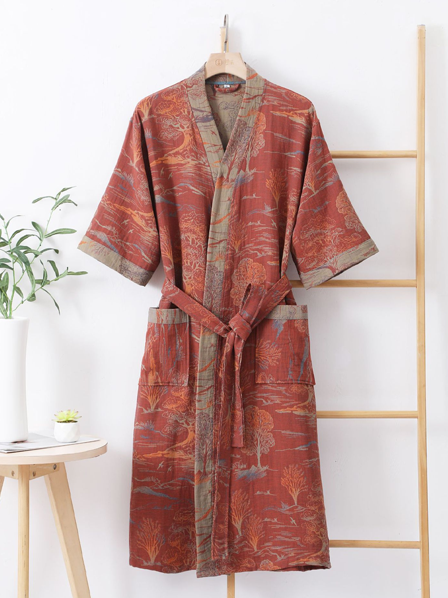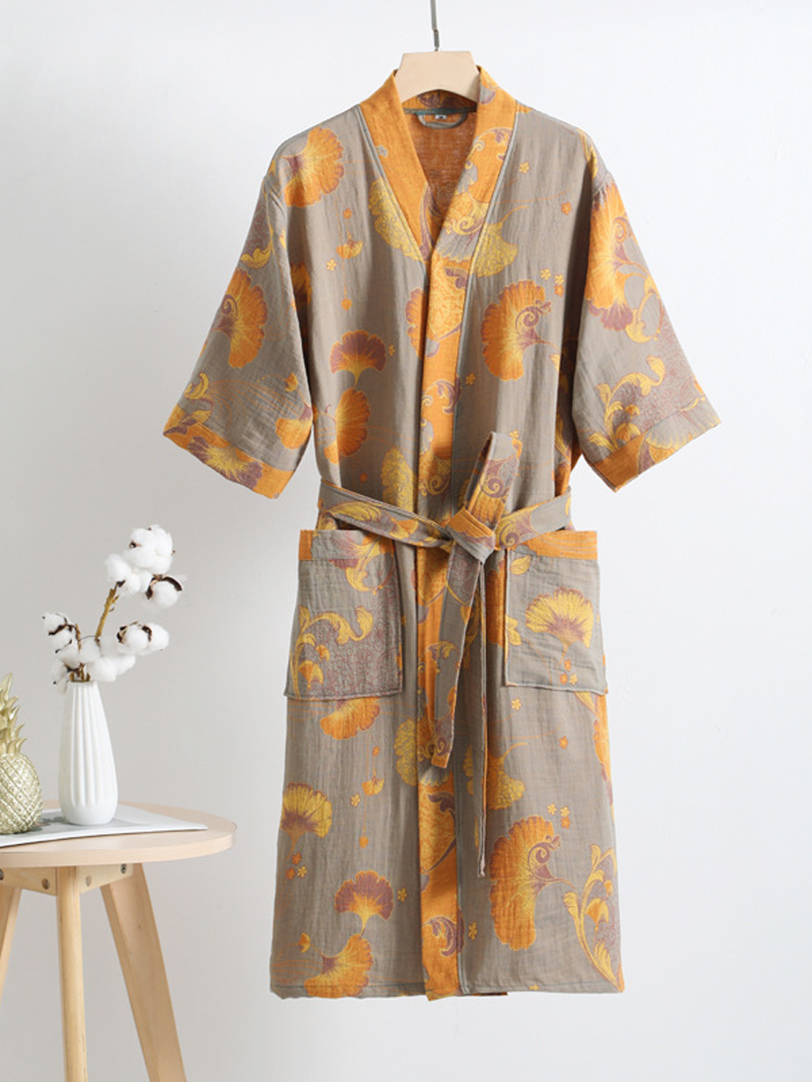 Náš župan z bavlněné gázy má středně dlouhou až dlouhou délku, která sahá pod kolena, a je vyroben ze 100% bavlněné gázy. Díky měkké textuře a elegantnímu květinovému vzoru s paisley vzorem je tento prodyšný a odolný župan ideální pro lenošení doma nebo po sprše a nabízí stylový a pohodlný zážitek.