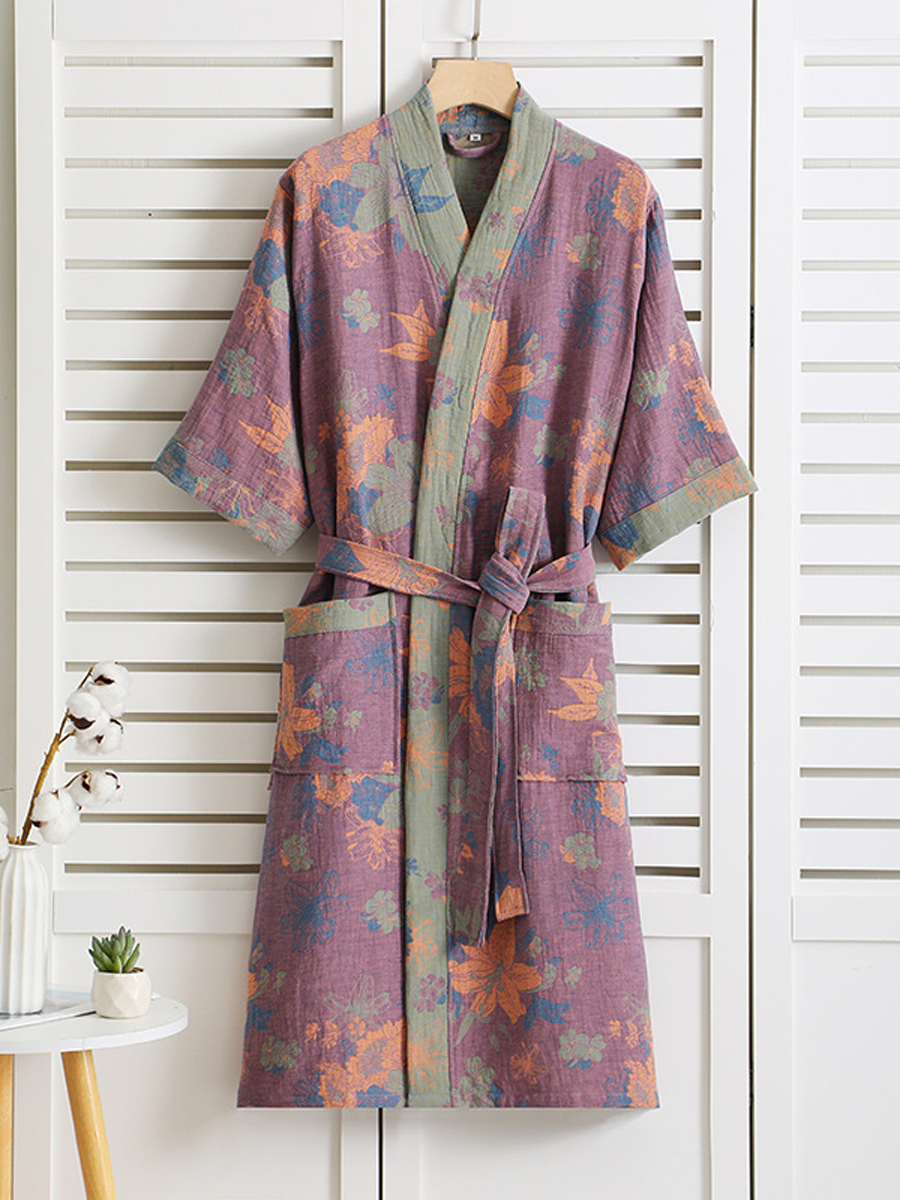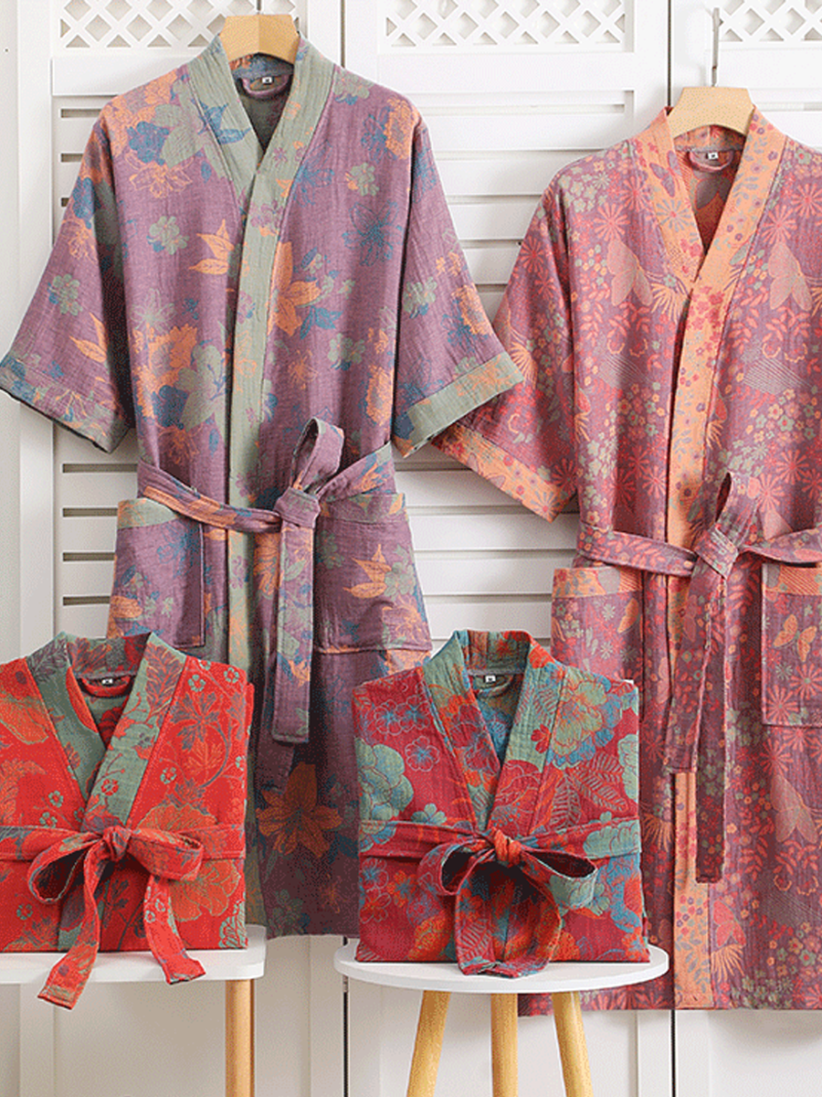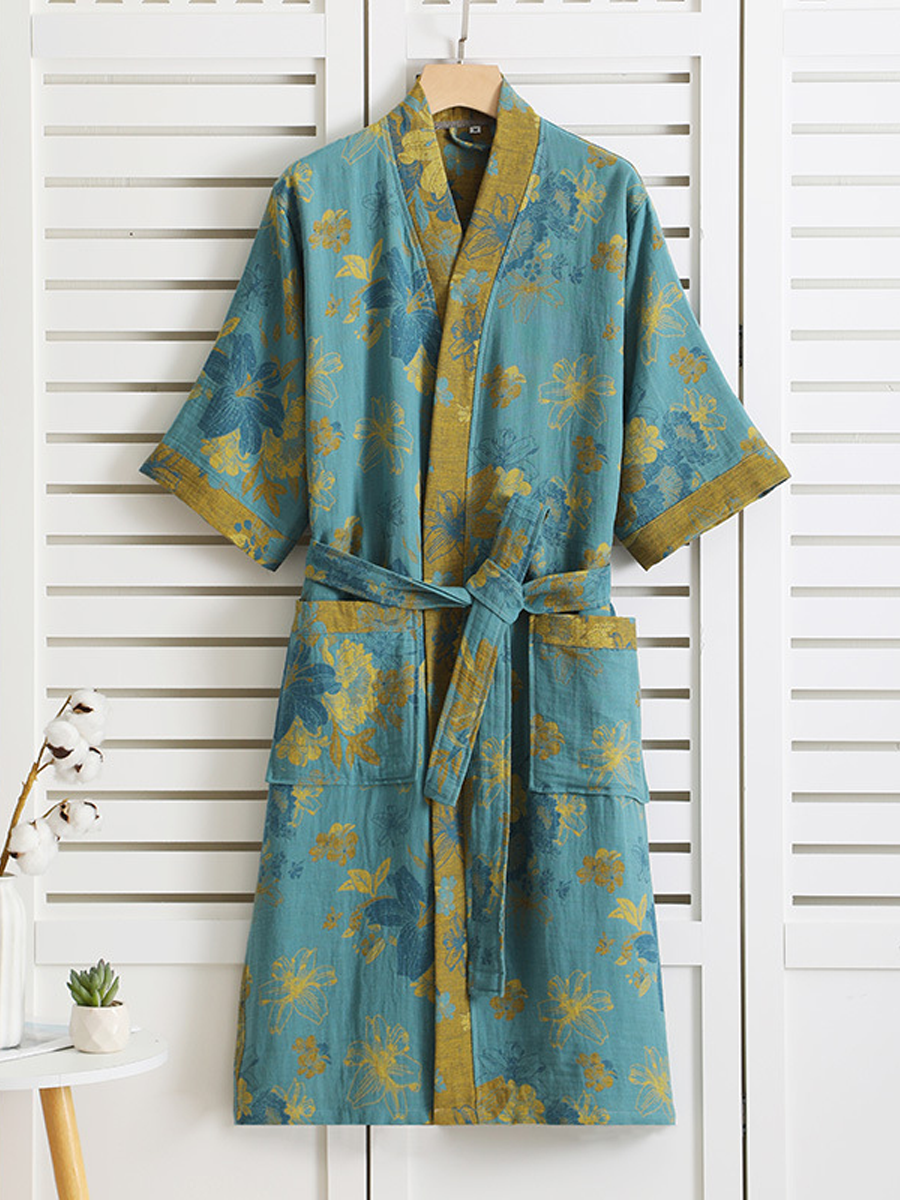 Tento lehký a prodyšný župan je vyroben ze 100% čisté bavlny s dvojitou vrstvou gázy, má volný střih a elegantní květinový vzor. Díky nastavitelnému pásku a dlouhé délce nabízí pohodlí a styl pro vaši relaxaci.