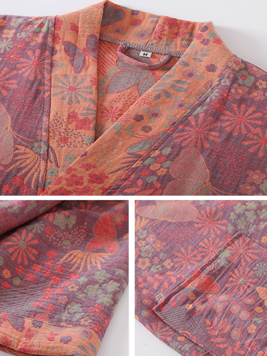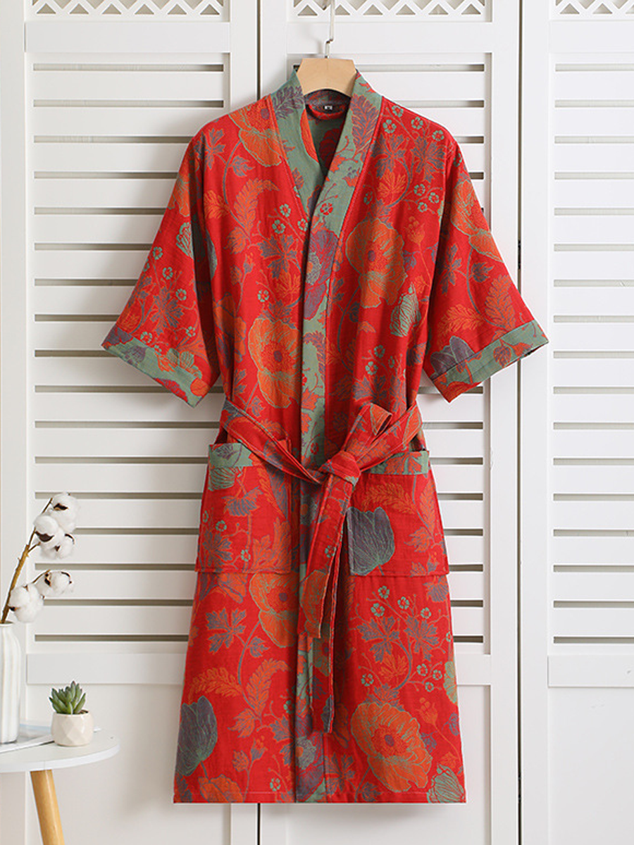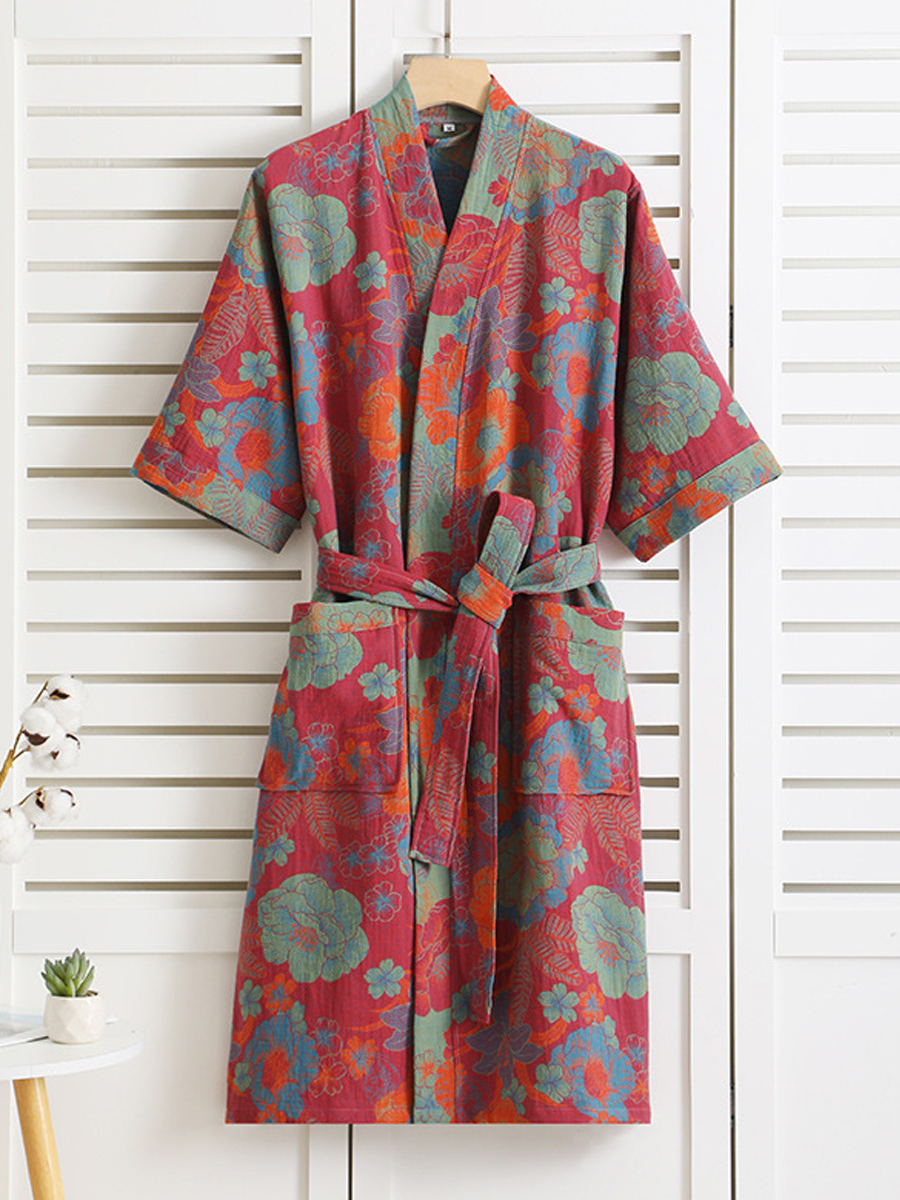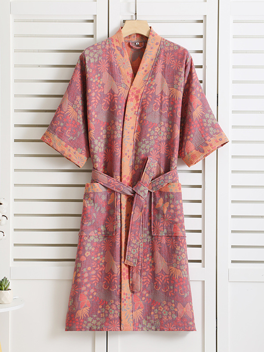 Tento lehký a prodyšný župan je vyroben ze 100% čisté bavlny s dvojitou vrstvou gázy, má volný střih a elegantní květinový vzor. Díky nastavitelnému pásku a dlouhé délce nabízí pohodlí a styl pro vaši relaxaci.