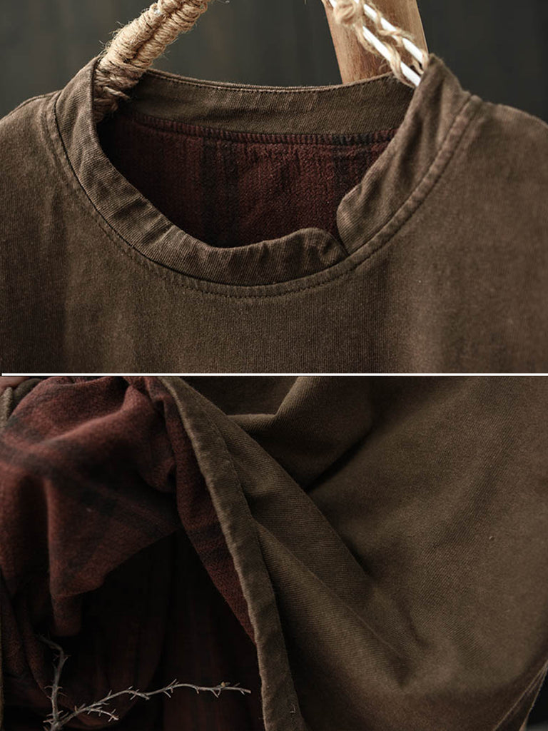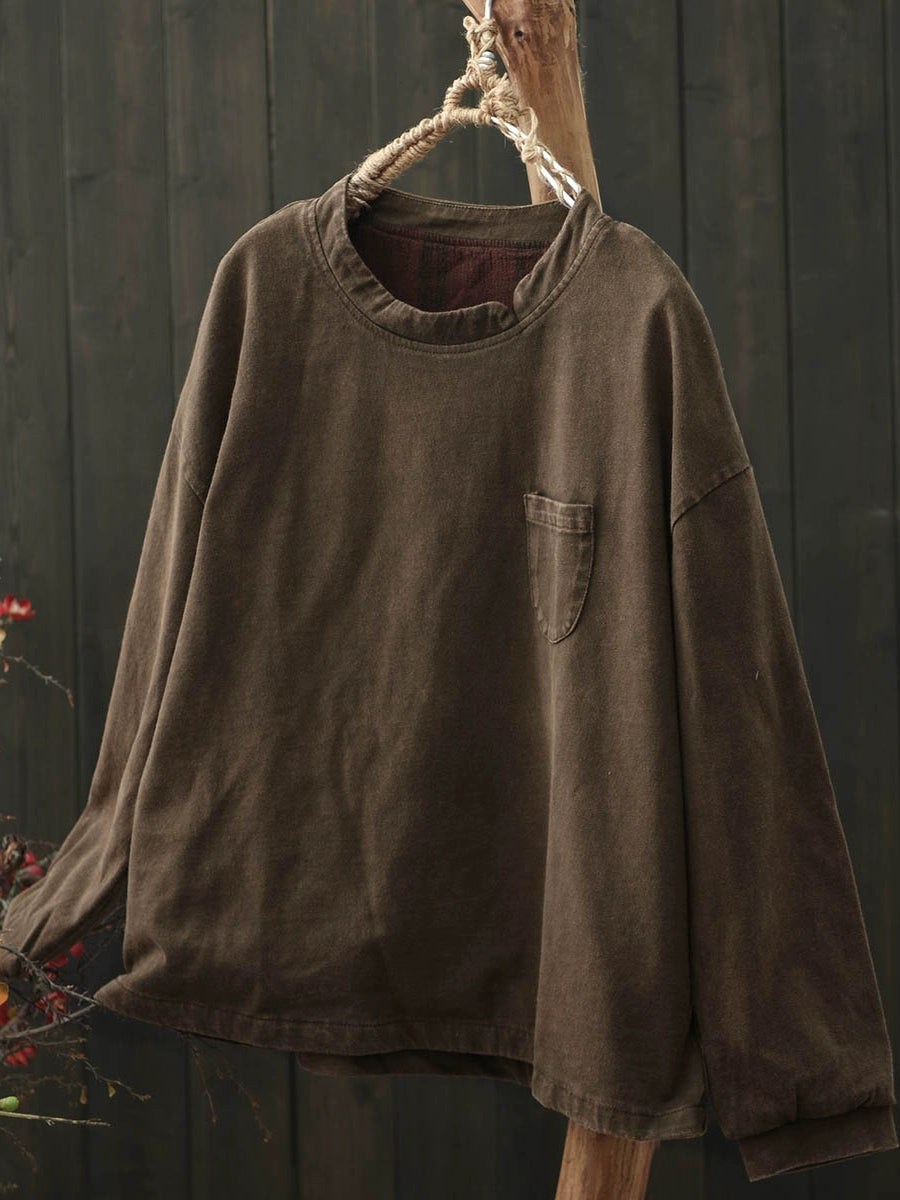 Dámská umělecká podzimní čistě barevná bavlněná halenka s výstřihem do O-neck