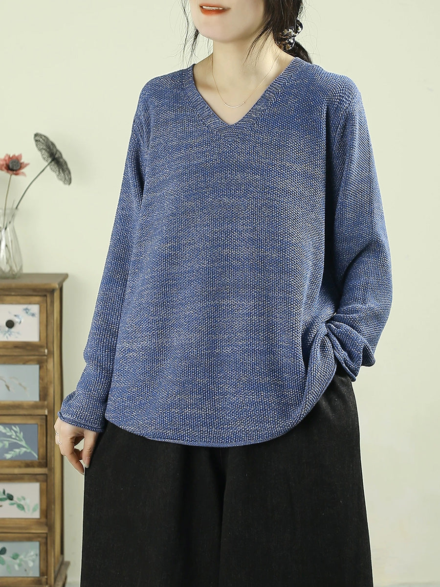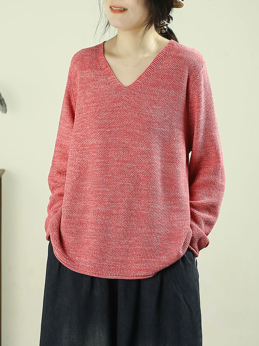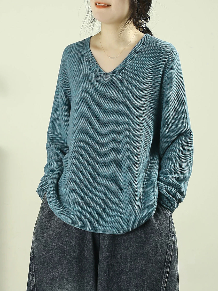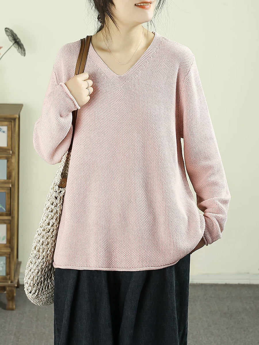 Dámský umělecký jarní ležérní čistě barevný svetr s výstřihem do V