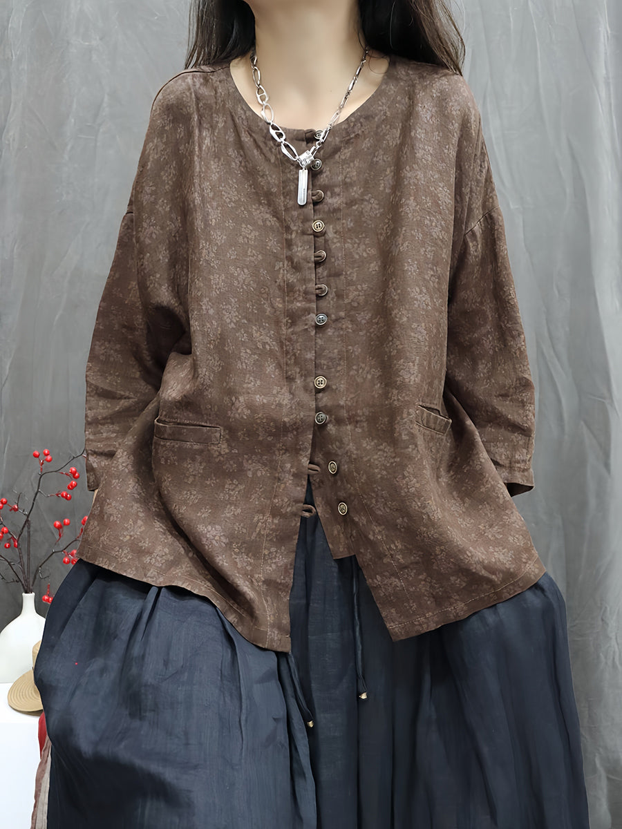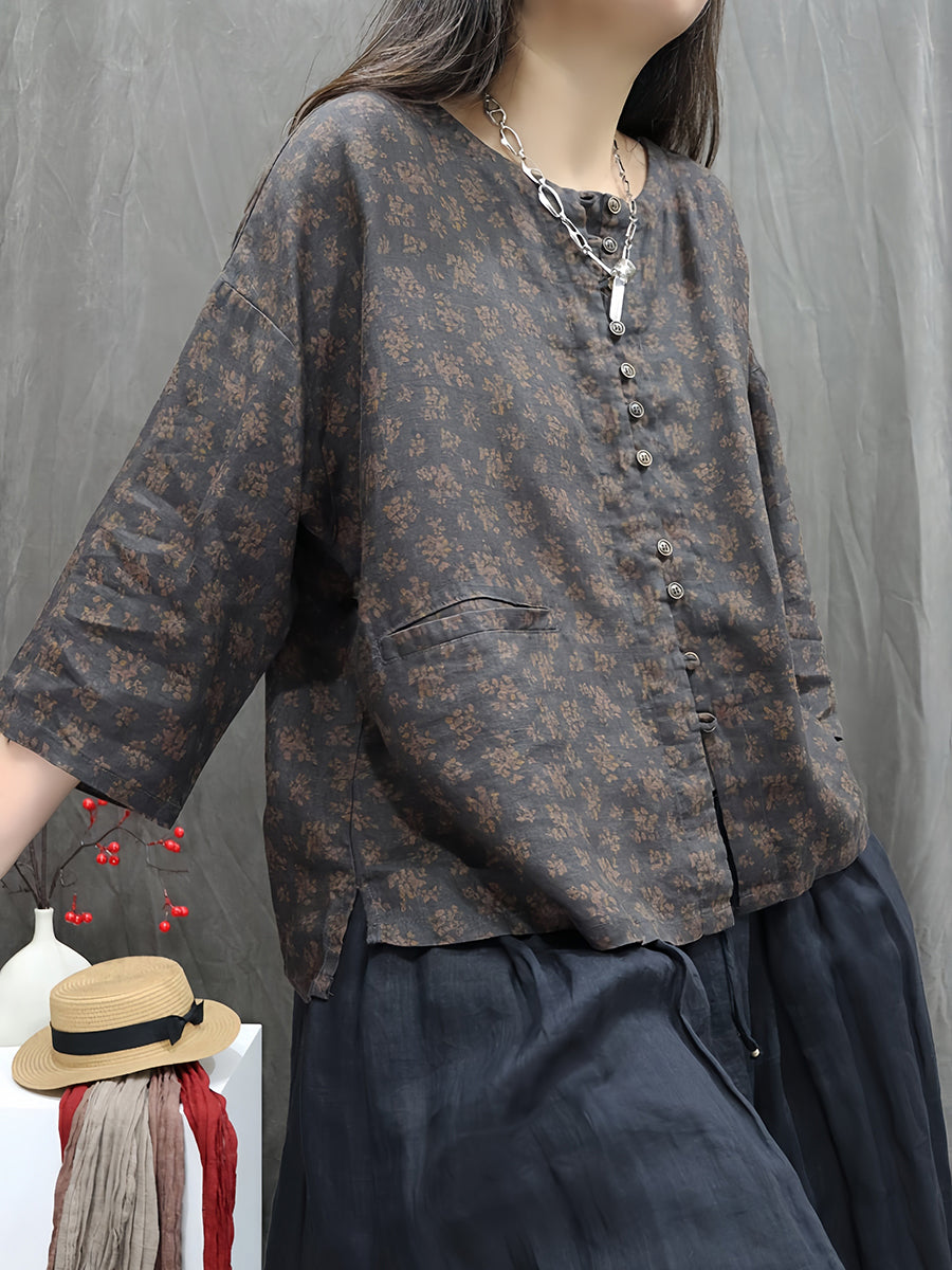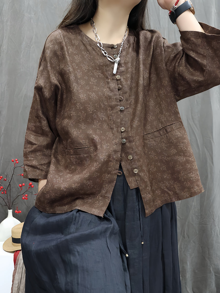 Dámská umělecká jarní květinová košile s výstřihem do O-neck ze 100% lnu