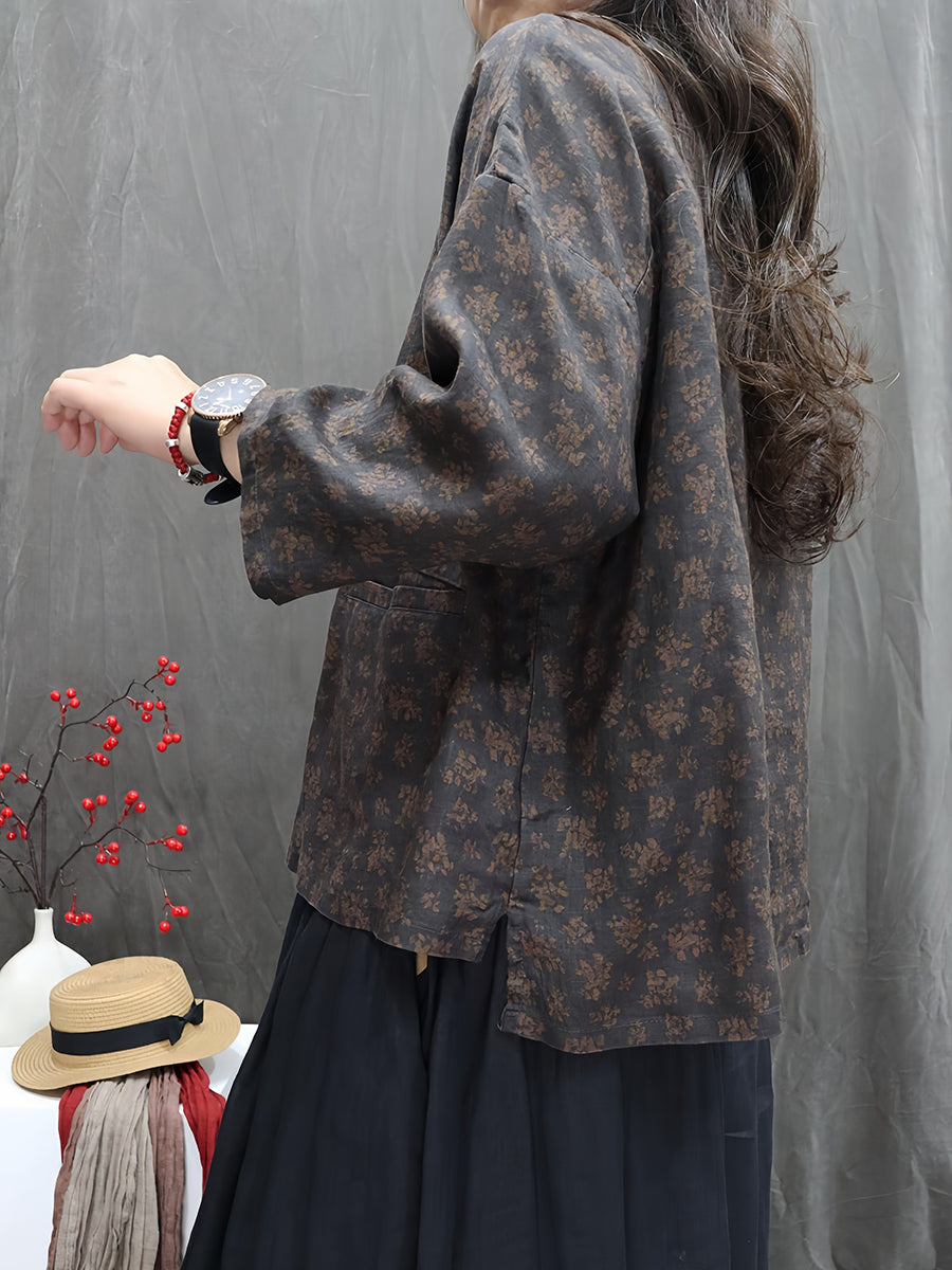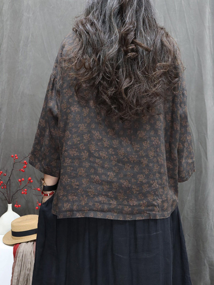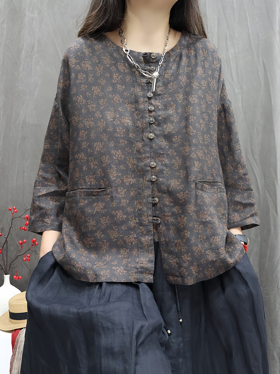 Dámská umělecká jarní květinová košile s výstřihem do O-neck ze 100% lnu
