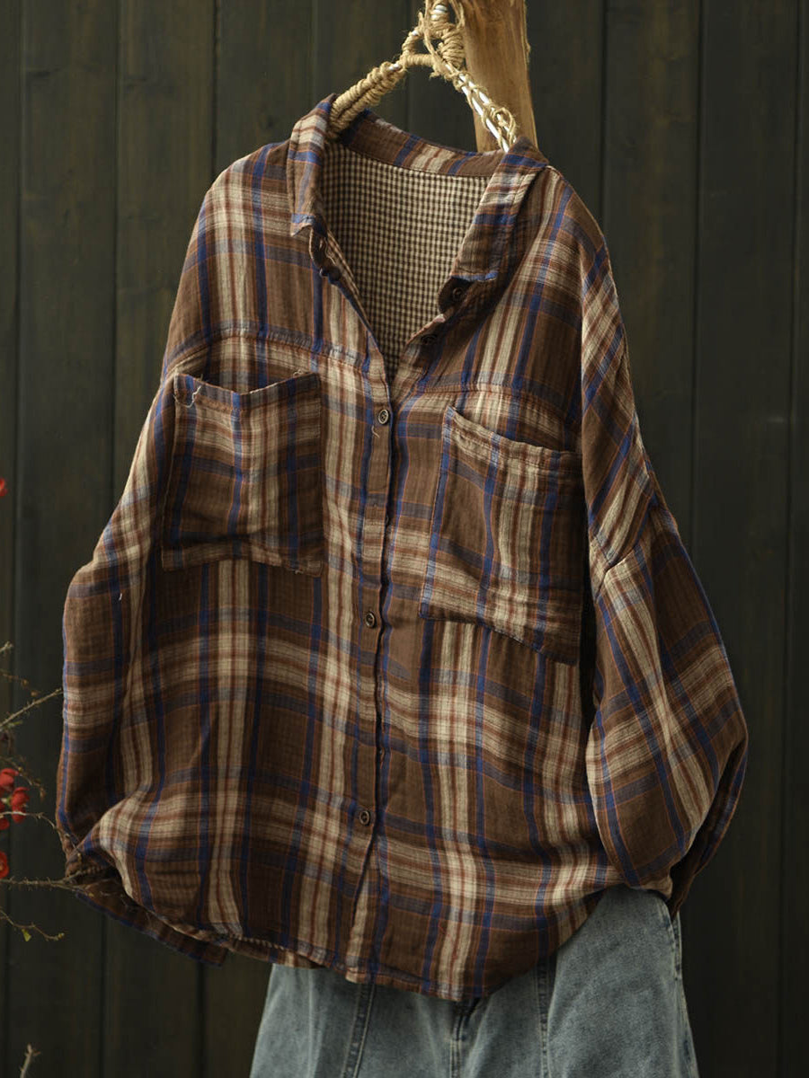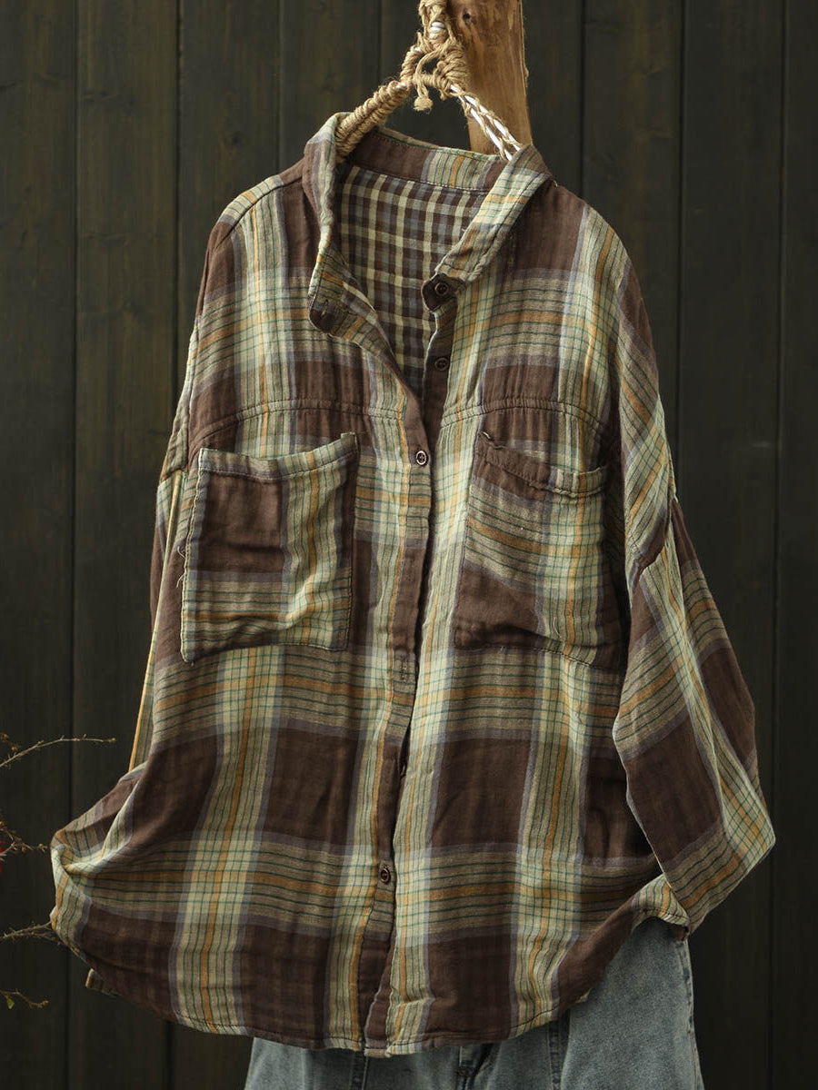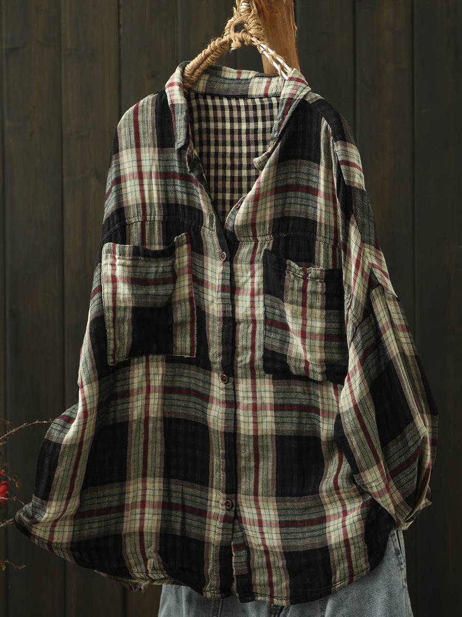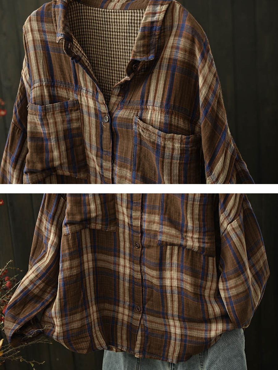 Dámská umělecká jarní kostkovaná bavlněná košile s odkládacím límcem