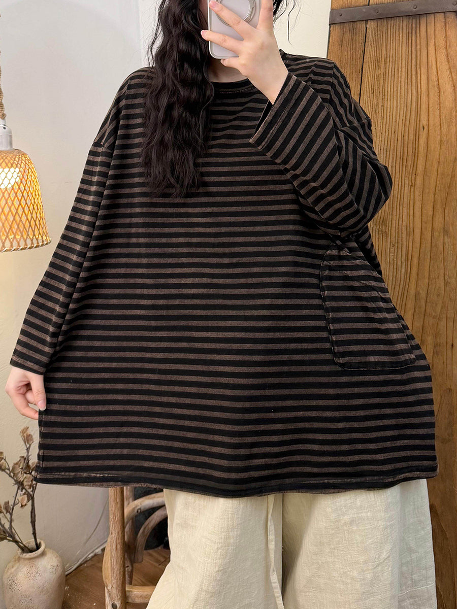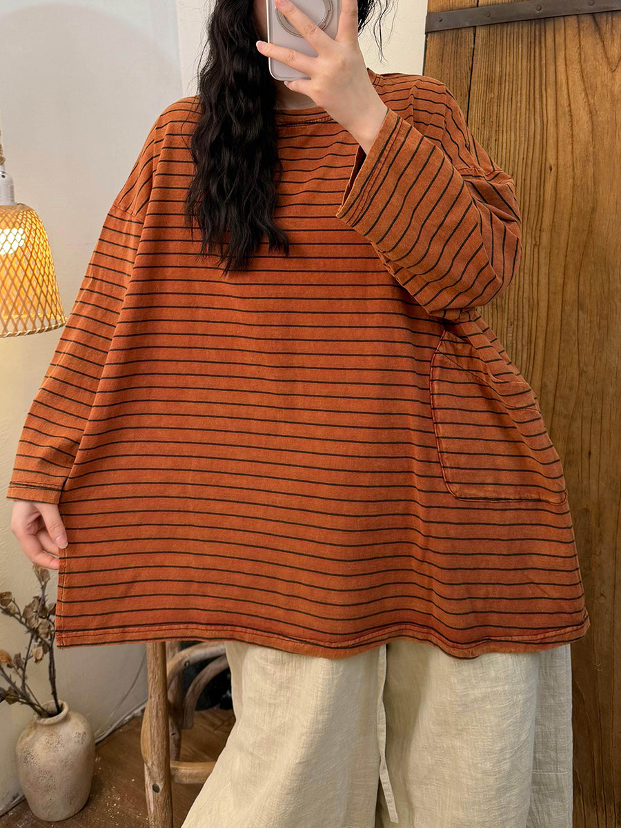 Dámská umělecká jarní pruhovaná bavlněná halenka s výstřihem do O-neck