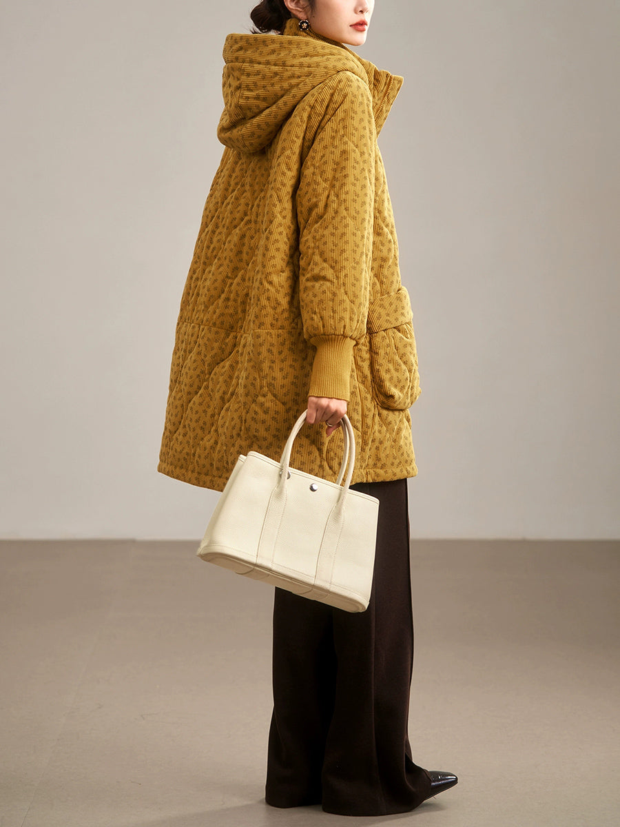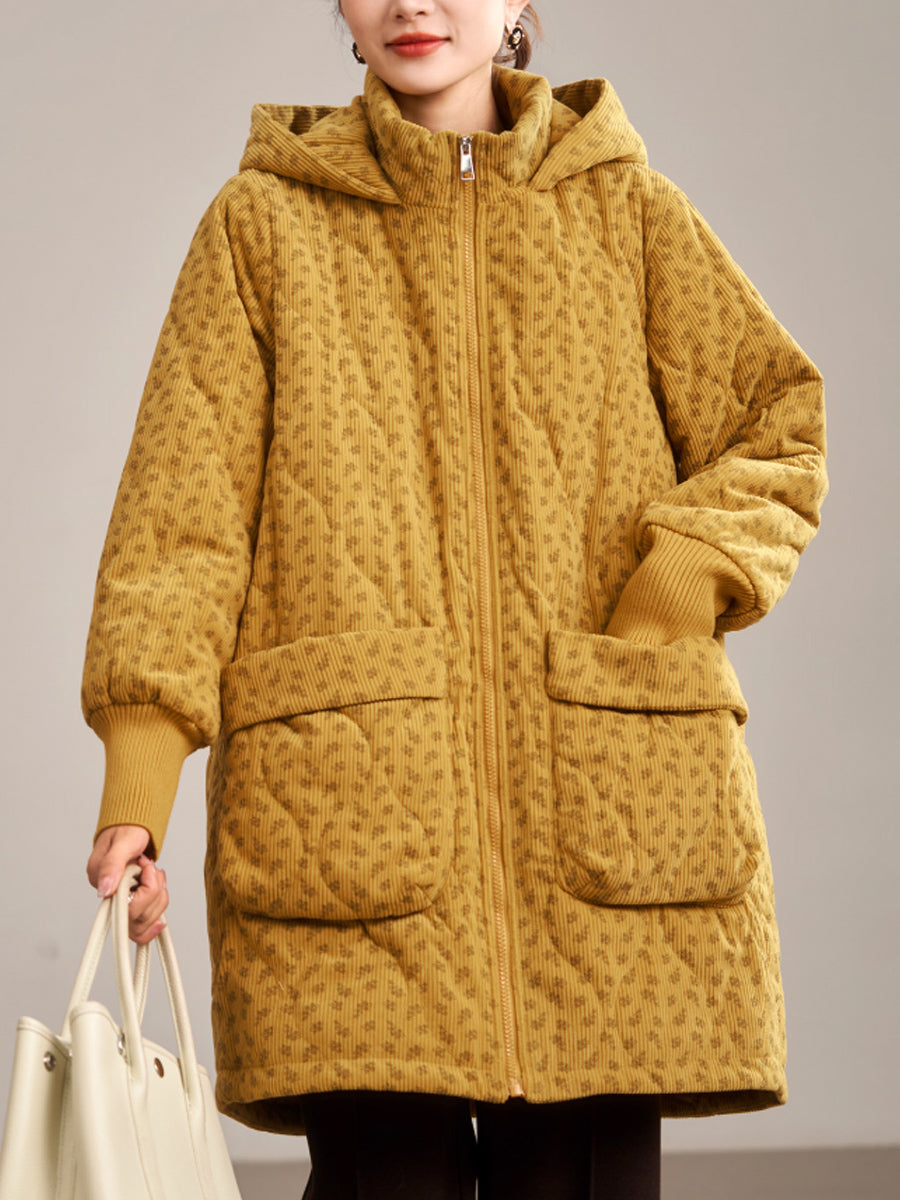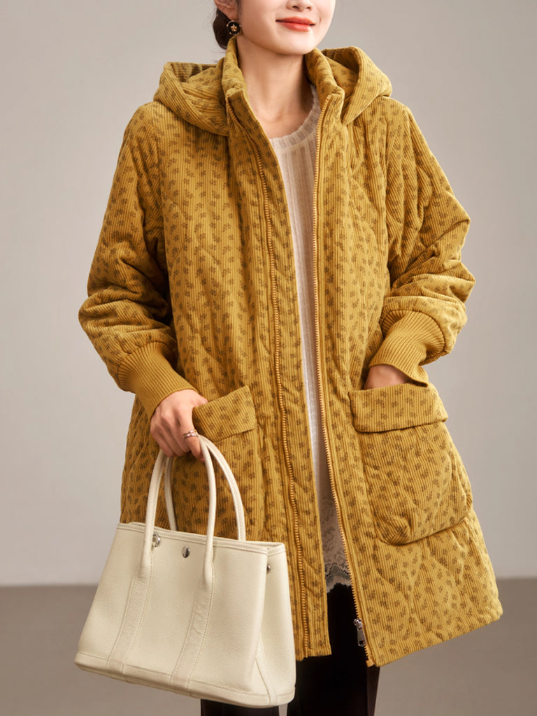 Dámský zimní umělecký květinový prošívaný kabát s kapucí