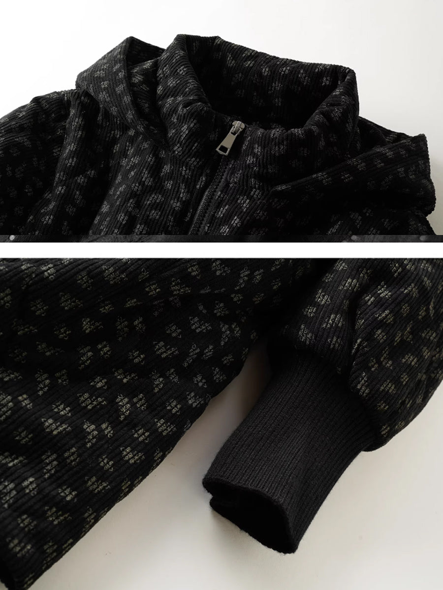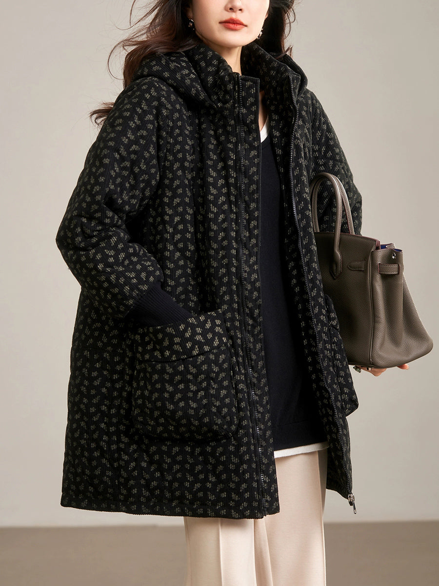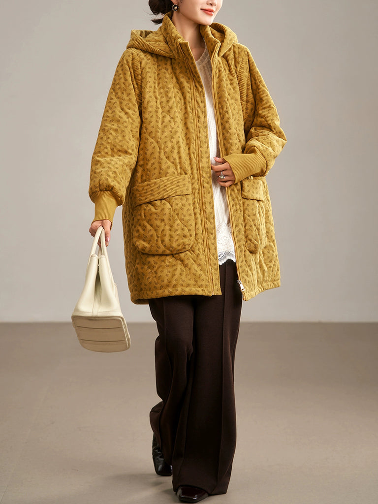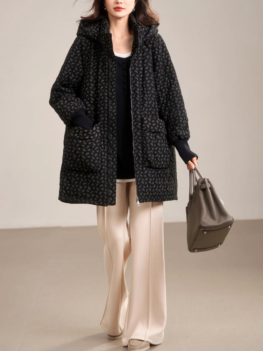 Dámský zimní umělecký květinový prošívaný kabát s kapucí
