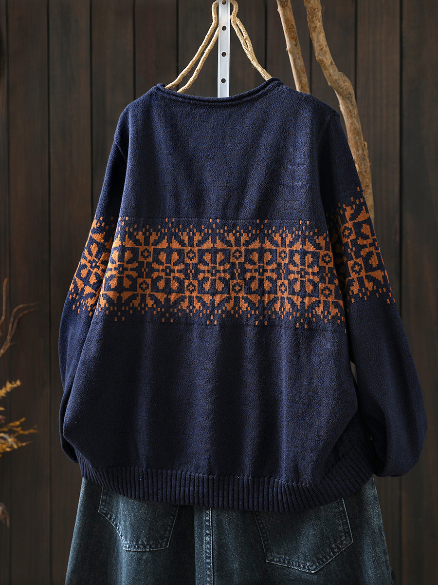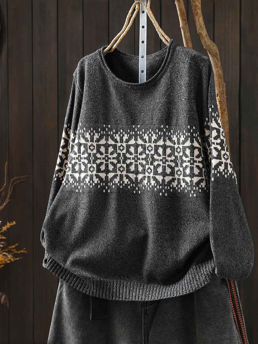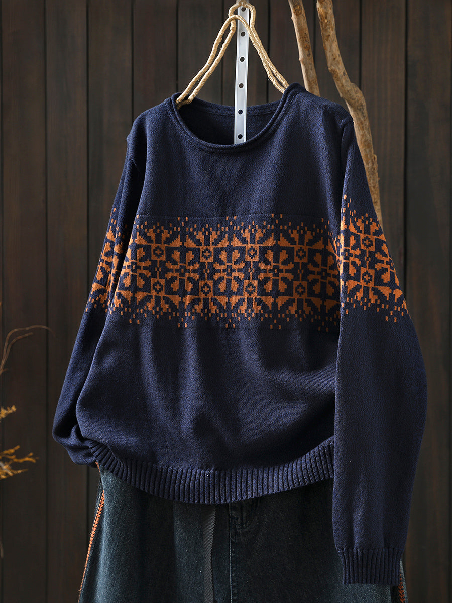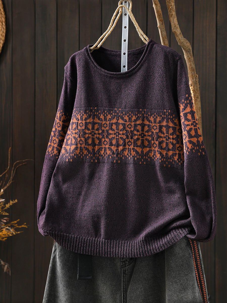 Dámský podzimní pletený svetr s výstřihem do O-neck s uměleckým květinovým vzorem