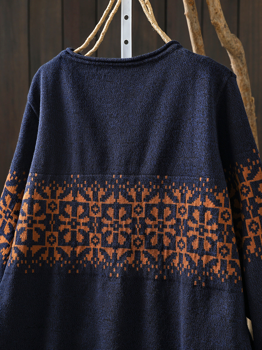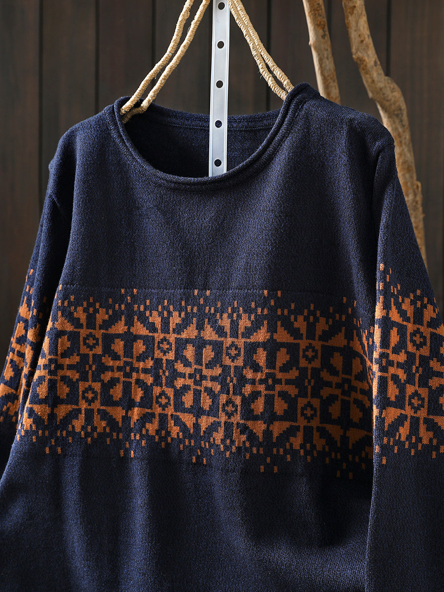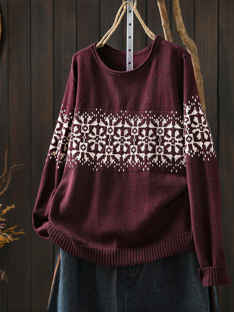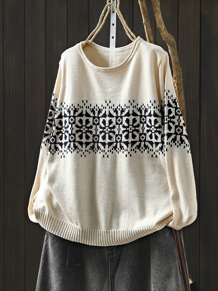 Dámský podzimní pletený svetr s výstřihem do O-neck s uměleckým květinovým vzorem
